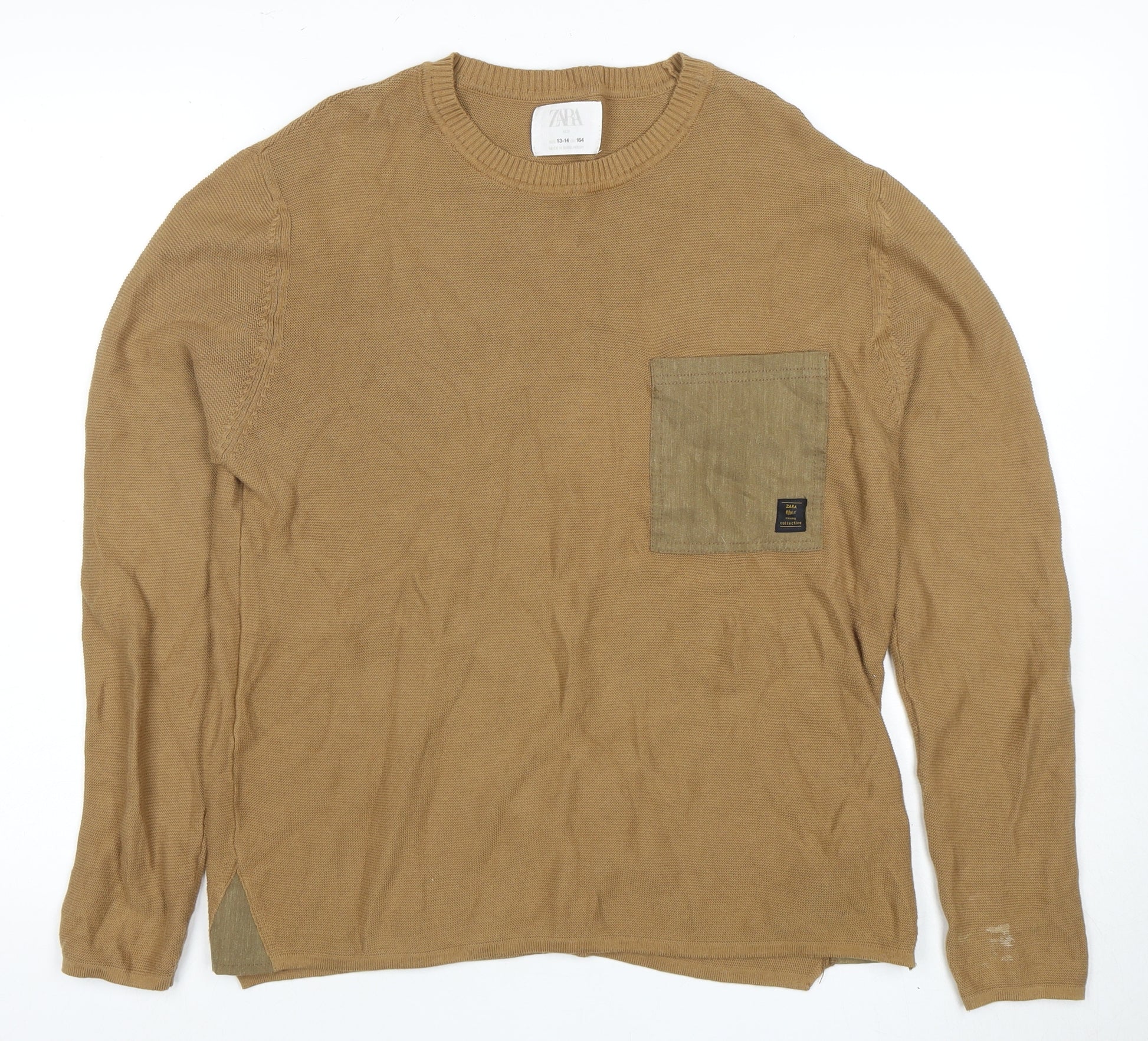 Elevate your child's wardrobe with this stylish Zara boys' pullover jumper. Crafted from 100% cotton, this brown knit jumper offers both comfort and durability, perfect for those cooler autumn and winter days. The classic crew neck and long sleeve design provide a timeless look, ensuring your child stays warm with a touch of fashion-forward style. With no discernible patterns, it offers a clean, versatile appearance, making it suitable for various casual occasions. Whether for school outings or weekend adventures, this jumper is a practical choice for the active young man. The Zara brand assures quality, and the pullover closure type ensures easy wearing. Despite slight signs of wear, the jumper remains in excellent condition, ready to provide continued warmth and style. Make this essential part of your child's wardrobe today!