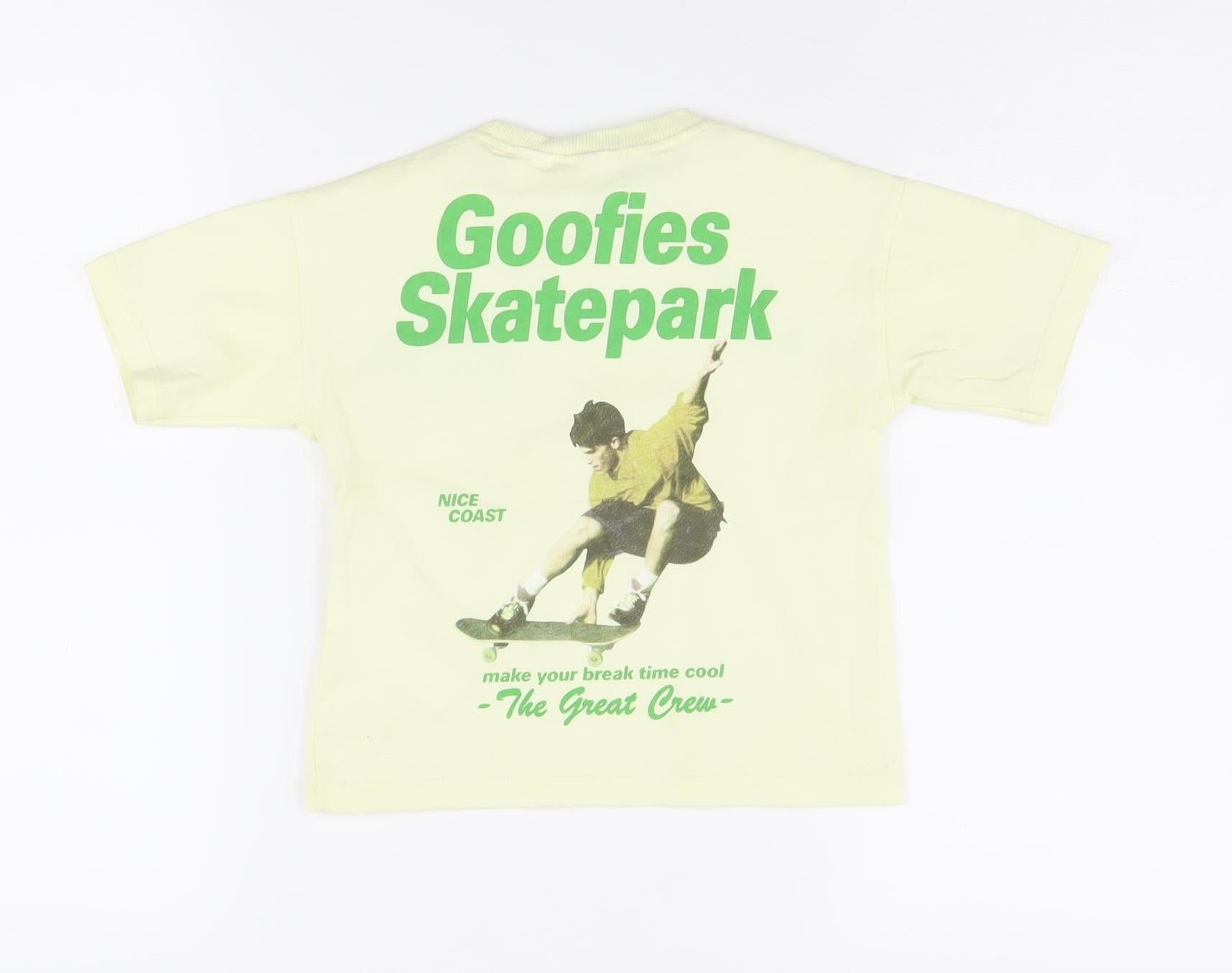 Elevate your little one's wardrobe with this vibrant Zara Boys Graphic T-Shirt in a refreshing green shade. Perfect for the young skateboarding enthusiast, the shirt features a bold 'Goofies Skatepark' design that is sure to stand out. Made from 100% cotton, this T-shirt offers ultimate comfort and breathability, making it ideal for the summer months. The short sleeves and crew neckline provide a classic fit that's both casual and stylish. Despite a couple of minor stains, the shirt is in very good condition, promising durability and fashion without compromising quality. An excellent choice for casual outings or a day at the park. Give your child a trendy edge with this fun and functional piece.