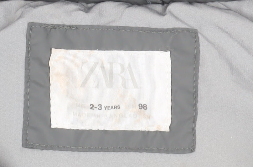 Boost your little one's outerwear collection with this versatile Zara bodywarmer, ideal for keeping them comfortable and stylish during those cooler months. Designed for boys aged 2-3 years, this jacket boasts a sleek grey hue that blends seamlessly with a variety of outfits, making it a practical and chic choice. Crafted from 100% polyester, the outer shell offers durability and a lightweight feel, perfect for everyday wear. The insulation of this bodywarmer adds that essential warmth, ensuring your child stays snug in autumn and winter's chillier weather. Featuring a convenient zip closure, dressing and undressing becomes effortless, allowing for easy on-and-off transitions. Practicality is at the forefront with two zipped pockets, offering secure storage for small essentials or simply a cozy spot for your little one's hands. While the condition is rated as very good, minor colour marks on the inside label are present but do not affect the garment's overall look or performance. Perfect for casual occasions or playful adventures, this jacket is a staple for any young boy's wardrobe. Pair it with jeans and a sweater for a classic, layered outfit. Get this stylish and functional Zara bodywarmer at an attractive price, ensuring comfort and fashion meet perfectly for your child.