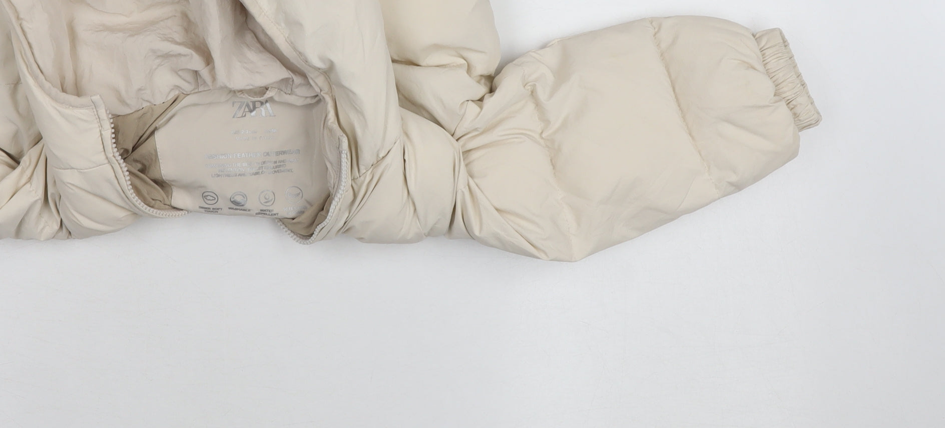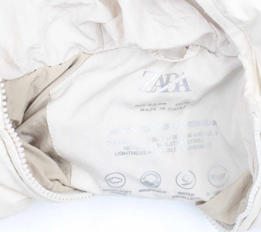 Keep your little one cosy and stylish with this Zara Girls Beige Hooded Puffer Jacket, designed for warmth and comfort during cooler days. Crafted from 100% polyester, this short-length jacket offers a soft woven texture with a lightweight padded design, ensuring excellent heat retention without extra bulk. Its neutral beige colour makes it easy to pair with any outfit, while the full-zip closure allows quick and convenient dressing. The hood adds extra protection against wind and rain, making it ideal for autumn and winter wear.This water-repellent jacket is practical for everyday activities, from walks in the park to school runs, keeping your child comfortably dry during unexpected drizzles. The inside is fully lined for a snug fit, and the elasticated cuffs help trap warmth and keep out the chill. The simple and modern silhouette, combined with Zara’s quality craftsmanship, ensures a polished yet relaxed look that's perfect for casual outings.The durable fabric and washable material make this jacket easy to care for, maintaining its soft-touch feel even after repeated washes. The quilted construction not only adds texture but also enhances the jacket’s ability to retain warmth efficiently. Suitable for layering over jumpers or tops, it provides both practicality and timeless charm in equal measure.In excellent pre-owned condition, this Zara puffer jacket shows minimal signs of wear, reflecting the brand’s commitment to quality. Ideal for girls aged 2-3 years, it combines comfort, utility, and understated style — everything you could want in outerwear for your child. A practical yet chic choice for everyday adventures.