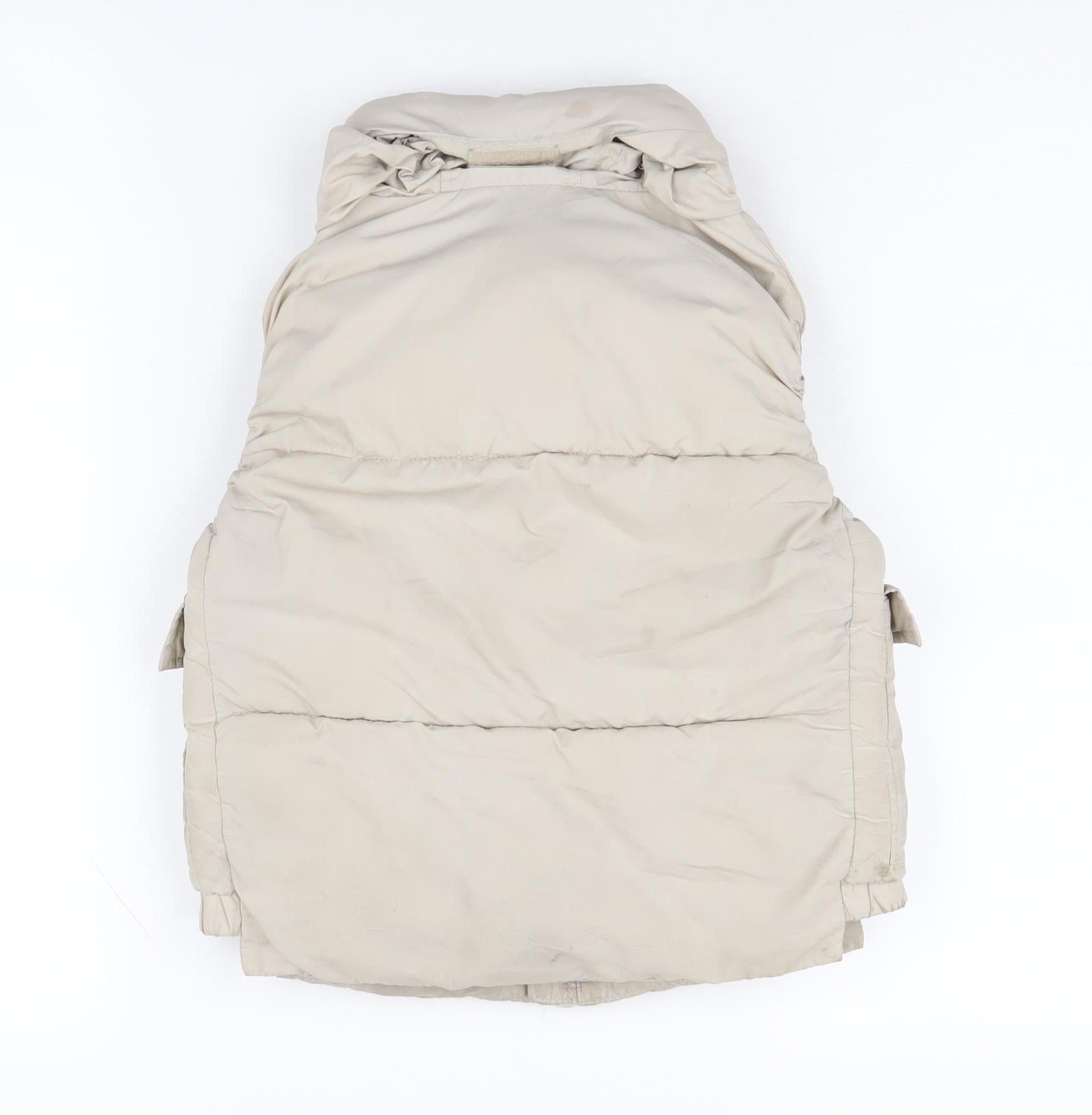 Keep your little girl warm and stylish with this beige puffer jacket from Zara, designed for comfort and durability. Ideal for winter outings, it's crafted from 100% polyester, ensuring a cozy fit. Featuring handy pockets and a zip closure for ease, this mid-length jacket is perfect for casual wear. Despite some visible stains, it's still in good condition and ready for more adventures. A versatile piece that complements various outfits, its regular fit and sleeveless design make it a practical choice for layering. A charming addition to any girl's wardrobe.