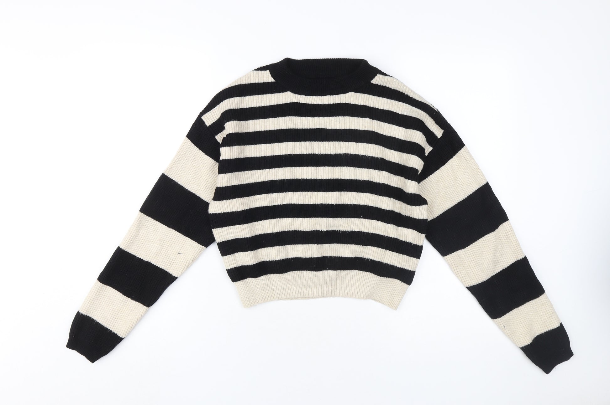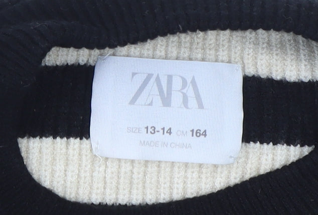 Embrace the timeless style of this Zara pullover jumper, a perfect blend of casual elegance for any young fashionista. Crafted for girls in the 13-14 year range, this lightweight knit features a striking black and beige striped pattern that makes a bold statement. The classic crew neck design offers a comfortable fit, ideal for layering or wearing on its own during the cooler months of autumn and winter. Made from a high-quality blend of 53% viscose, 26% polyester, and 21% nylon, it ensures a soft and cozy feel against the skin while providing durability for everyday wear. Despite lacking original tags, this jumper is in very good condition with no visible flaws, promising style and longevity without the premium price tag. Pair it with jeans or skirts for versatile, effortless looks suitable for casual outings, school, or weekend activities. Keep your young one's wardrobe trendy and chic with this essential piece by Zara.