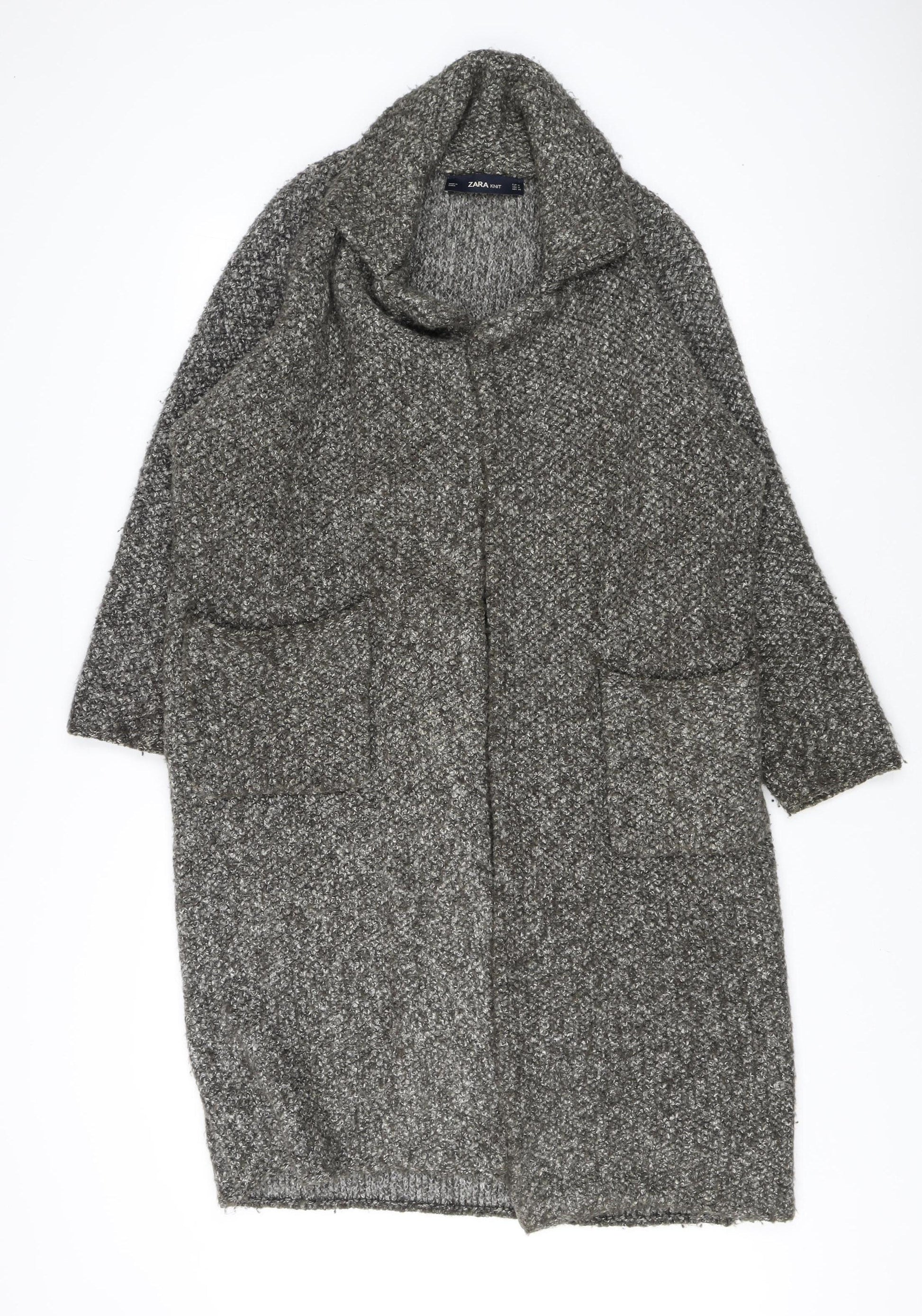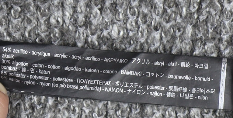 Embrace cosy elegance with this Zara Knit Women's Grey Open-Knit Cardigan. Perfect for adding a touch of sophistication to your autumn and winter wardrobe, this relaxed-fit cardigan combines comfort and style effortlessly. Crafted from a blend of luxurious materials including acrylic, cotton, polyester, and nylon, the cardigan offers warmth and softness, ensuring you stay snug during chilly days. The rich grey shade offers a versatile appeal, pairing easily with any outfit, while the open-knit style adds texture and dimension. Featuring an open front and practical pockets, this cardigan is tailored for convenience and style. The long sleeves and raglan style provide a contemporary twist, making it ideal for casual outings. Despite its use, the cardigan remains in excellent condition, exhibiting minimal wear with no visible damage. For ease of care, this piece is machine washable, promising effortless maintenance. Whether draped over a blouse or layered with a turtleneck, this Zara cardigan promises to be your go-to piece for sophisticated layering. Elevate your casual ensemble with this chic and versatile addition, perfect for those seeking comfort with a fashion-forward edge.