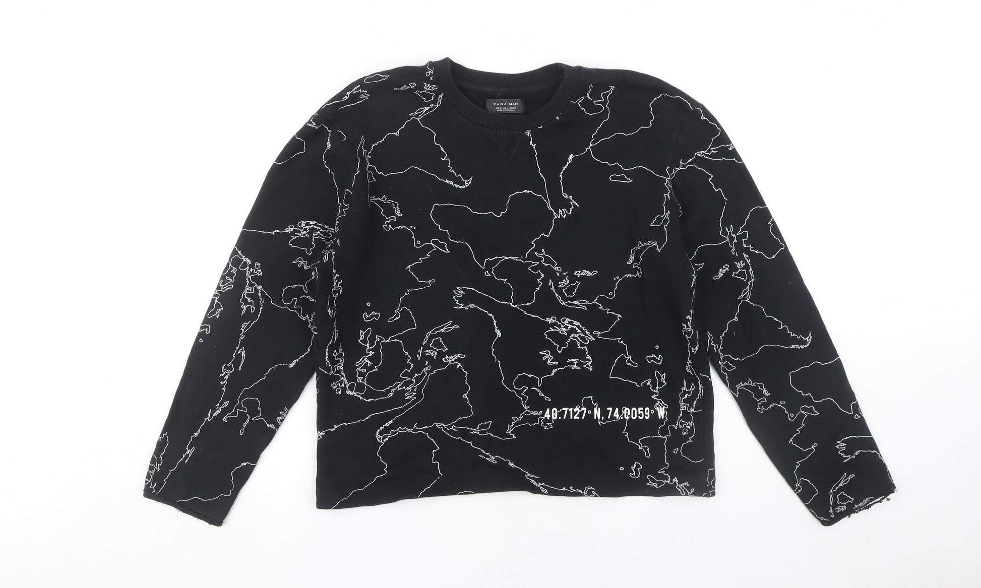Dive into comfort with this ZARA MAN sweatshirt, a perfect addition for any modern wardrobe. Crafted in a regular fit with jersey fabric type, this black pullover features an eye-catching map graphic print that adds a creative twist to the classic sweatshirt look. Designed for men, this stylish piece comes in a medium size and a versatile long sleeve design, making it suitable for spring, autumn, and winter. Accentuated by a crew neckline, it presents a relaxed fit with a fashionable edge. Made from 100% cotton, it promises softness and breathability. Enjoy the ease of machine washability, ensuring practical maintenance. With no wear or damage, its excellent condition makes it a valuable find. Whether for casual outings or comfortable home wear, this sweatshirt seamlessly blends fashion with functionality.
