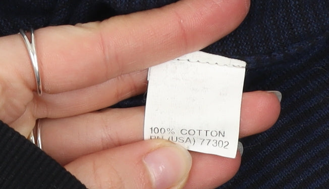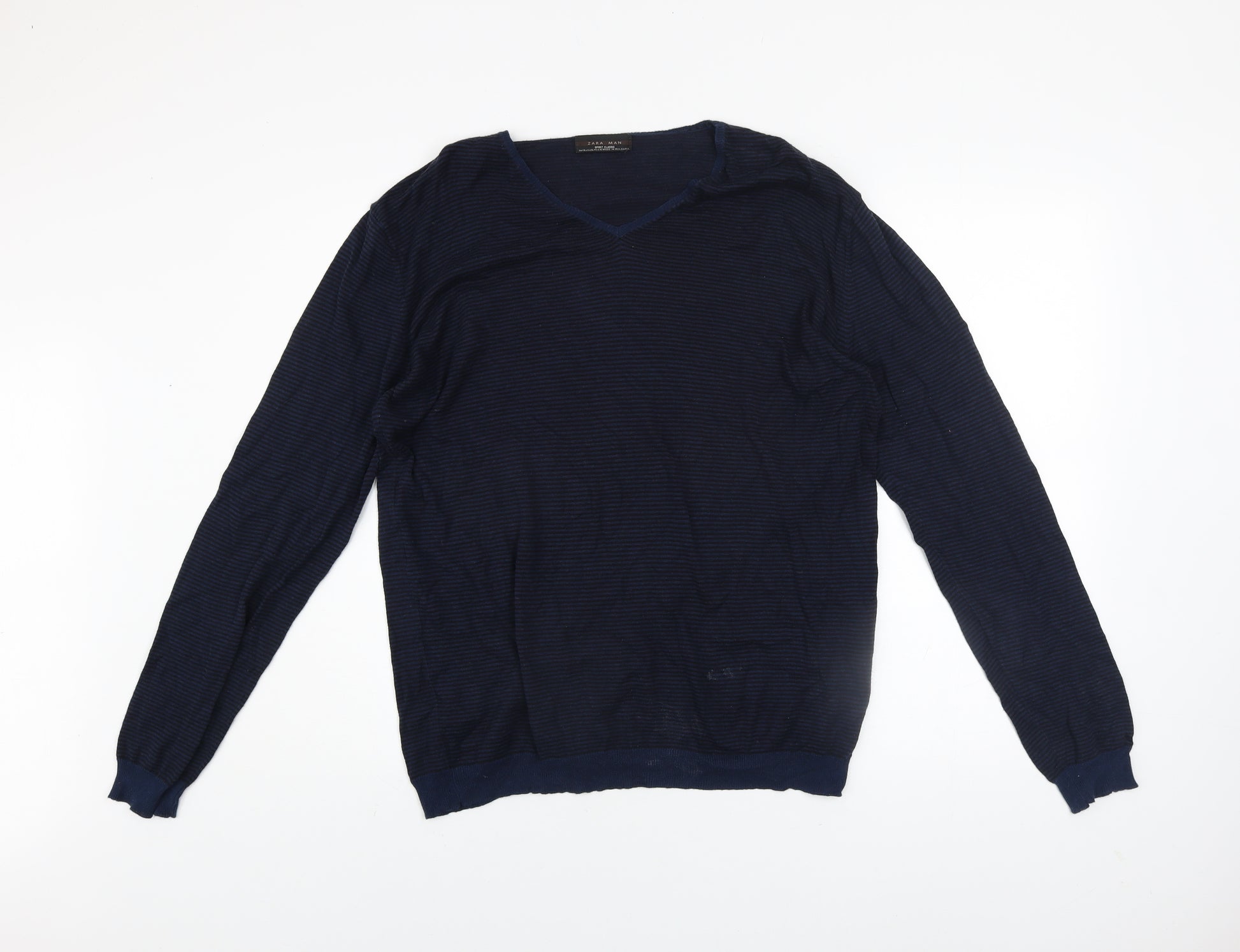 Add a touch of refined casual style to your wardrobe with this Zara Man Sport Classic V-neck jumper in timeless navy blue. Crafted from 100% cotton, this lightweight knit offers breathable comfort and versatility, making it ideal for layering across multiple seasons including autumn, spring and winter. The subtle fine stripe pattern gives the jumper a modern and understated look, while the soft knit texture ensures it feels comfortable against the skin. Designed for men, this classic pullover style provides a regular fit that flatters various body shapes. The V-neckline makes it a perfect companion for both smart-casual and relaxed outfits — easily paired with jeans, chinos, or layered over a shirt for a polished finish. Made in Bulgaria, the quality craftsmanship reflects Zara’s dedication to stylish yet functional design. The cotton fabric allows for easy maintenance as it is machine washable. Although pre-owned and showing a small hole near the front hem, the jumper remains in good wearable condition and holds its shape well. This versatile piece is ideal for casual outings, everyday wear, or smart weekend looks. Offering both comfort and subtle sophistication, this Zara Man blue striped jumper is a wardrobe essential that can be used to elevate simple outfits with minimal effort. A great addition for anyone wanting quality and effortless style at an affordable price.
