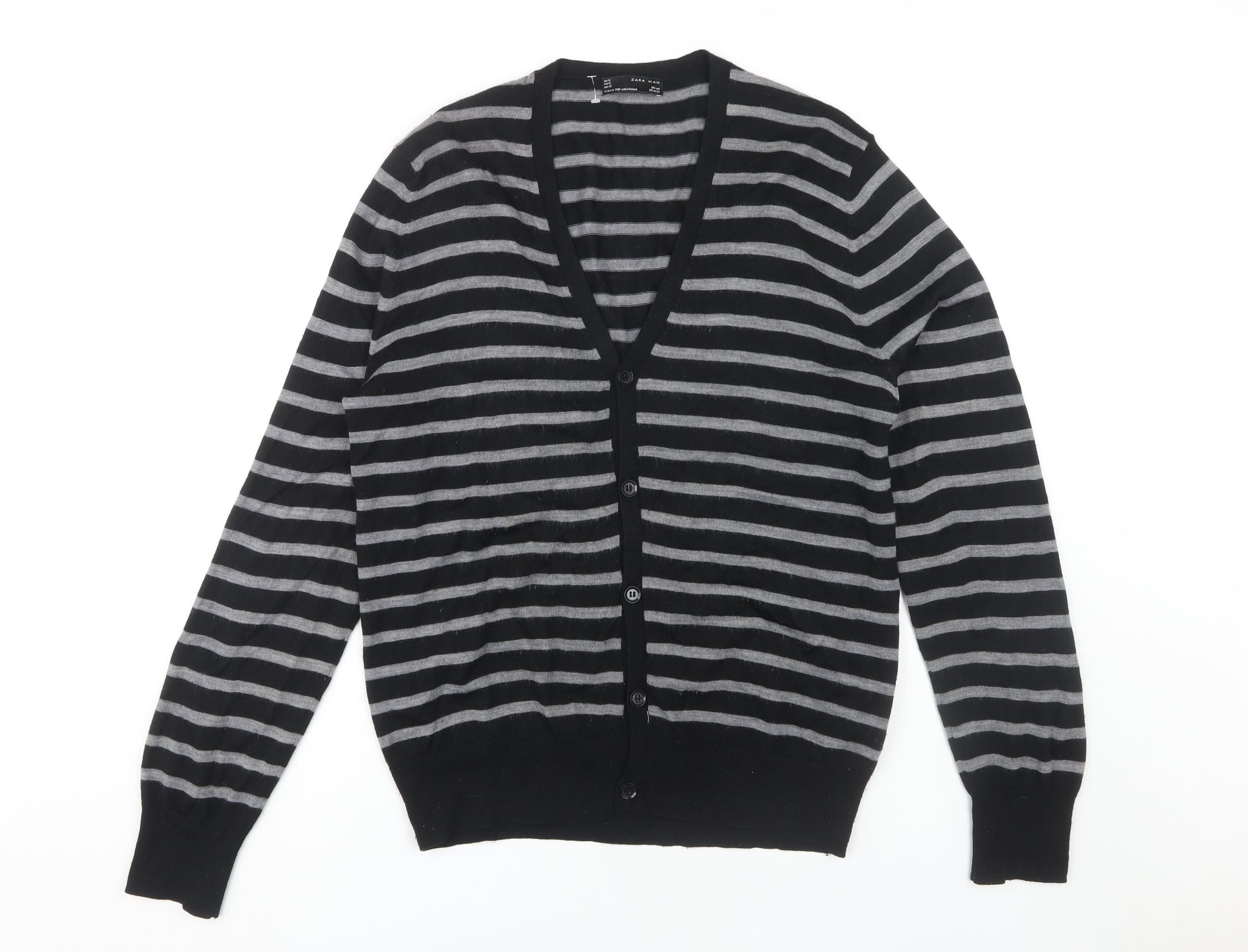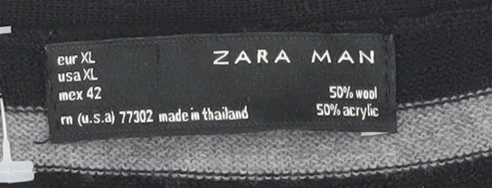 Elevate your wardrobe with this stylish Zara Man Men's XL Black Striped Cardigan. Perfectly designed for casual outings or stylish layering, this cardigan is an excellent choice for any fashion-forward individual. It features a classic V-neck design that enhances its timeless appeal, allowing versatility across different outfits. Made from a balanced blend of 50% wool and 50% acrylic, this cardigan provides both warmth and comfort throughout the seasons. Its regular fit ensures ease of movement and comfort, making it suitable for all-day wear. The long sleeves add to its practicality, keeping you warm during those cooler days. The black and grey striped pattern is a staple design that easily complements various trousers or jeans, making it an essential addition to any man's wardrobe. Despite being pre-owned, it is in excellent condition with no signs of damage, ready to serve as a reliable piece in your fashion collection. This cardigan is not only practical but also fashionably durable, making it a must-have for casual or semi-formal occasions. Update your style effortlessly with this Zara Man Striped Cardigan and experience the blend of fashion and functionality.
