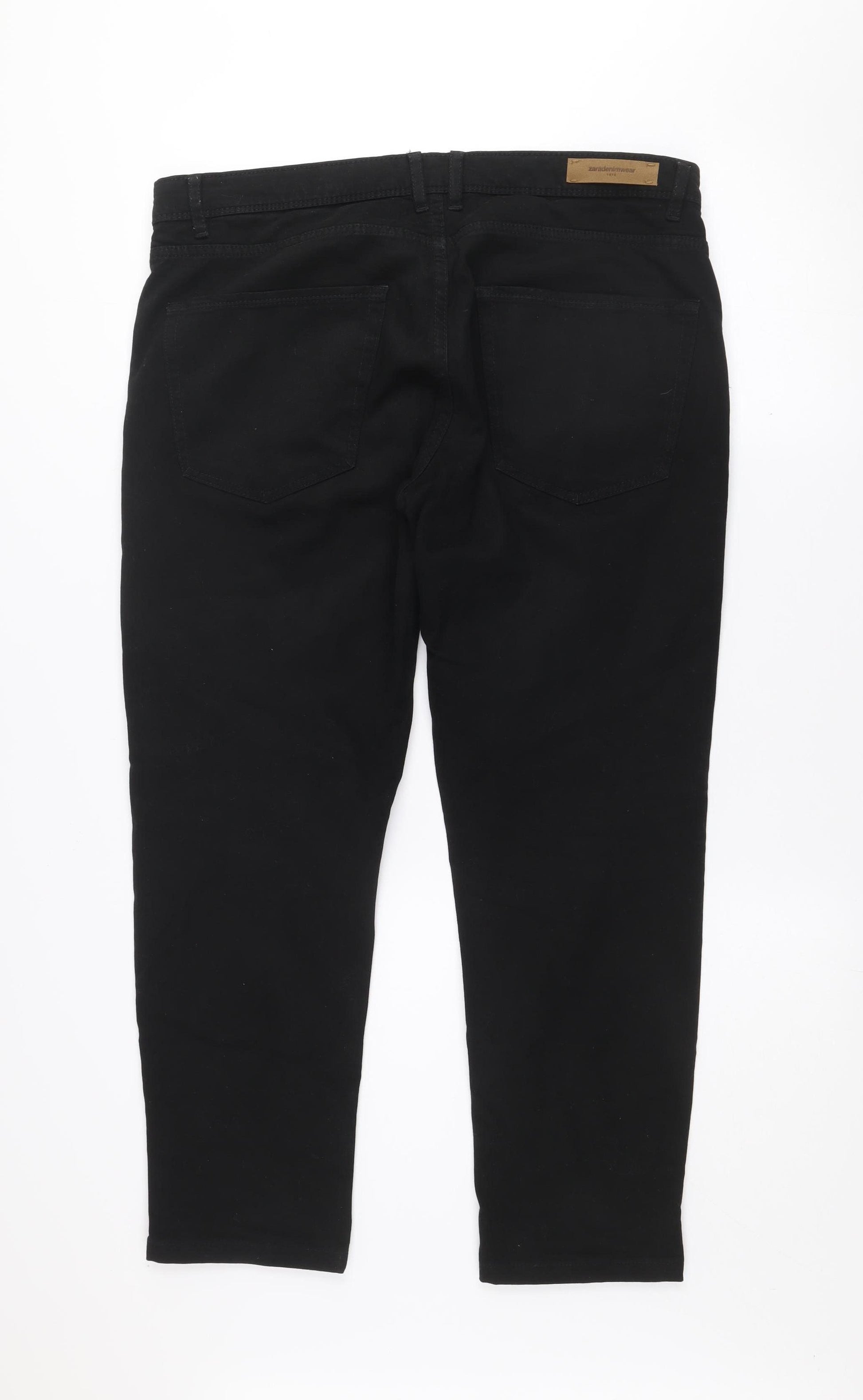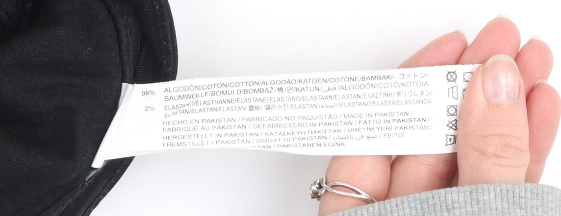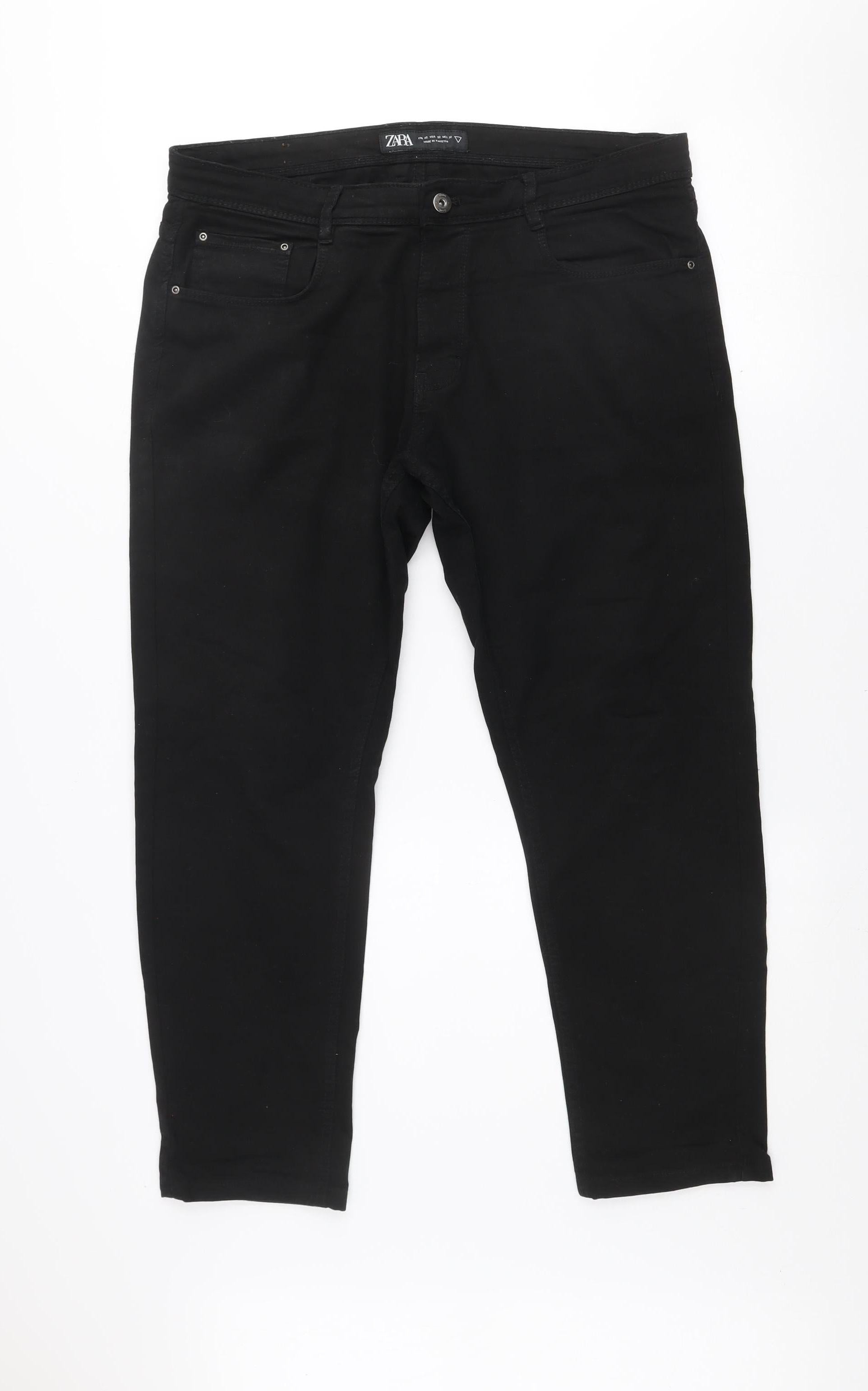 Step up your casual style with these classic black slim fit jeans by Zara, designed for the modern man who values both comfort and sophistication. Crafted from a high-quality blend of 98% cotton and 2% elastane, these jeans offer the perfect balance of softness and stretch, ensuring a flattering fit that moves with you throughout the day. With their timeless straight silhouette and clean dark wash, these jeans are versatile enough for smart-casual events or everyday wear.Featuring a mid-rise cut and a traditional five-pocket design, these jeans provide both function and form. The button and zip fastening ensures a secure fit, while the durable denim material maintains structure and longevity, even with frequent wear. Subtle detailing, such as metal rivets and understated pocket stitching, adds a refined touch without overwhelming the minimalist aesthetic. Their dark colour makes them a wardrobe essential that pairs effortlessly with shirts, jackets, or T-shirts.Ideal for autumn through spring, these jeans are breathable yet warm enough for cooler days, perfect for creating stylish layered outfits. The slim fit accentuates your shape without being restrictive, making them a go-to choice for a polished yet relaxed look. Whether worn with trainers for a laid-back vibe or with brogues for a sleek finish, these Zara jeans easily adapt to any occasion. In excellent pre-owned condition with no significant signs of wear, they present superb value for their quality and brand reputation.Upgrade your denim rotation today with these timeless black Zara jeans that blend comfort, durability, and smart casual appeal — the perfect staple for every man’s wardrobe.