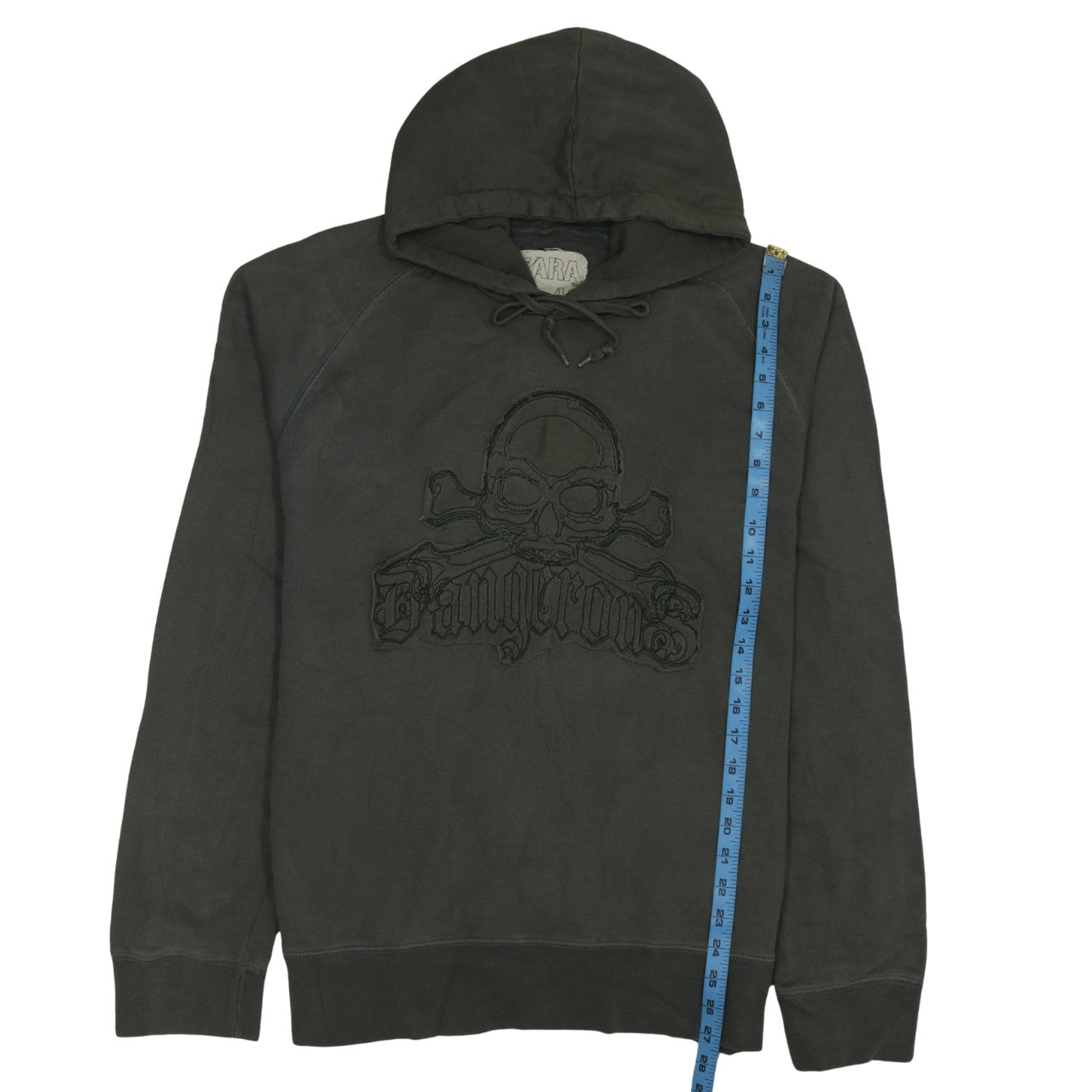 This Zara men's pullover hoodie brings an effortlessly edgy touch to your casual wardrobe. Crafted from soft 100% cotton jersey, this piece offers both comfort and breathability, ideal for cooler autumn and winter days as well as early spring wear. The hoodie features a striking embroidered skull and crossbones with 'Dangerous' text across the chest, enhancing its rebellious punk-rock aesthetic. The drawstring hood adds functional style, while ribbed cuffs and hem ensure a snug, comfortable fit. The cotton fabric gives it a naturally soft texture that feels great against the skin and provides a relaxed silhouette suitable for everyday wear. Designed for men, this hoodie works perfectly for casual outings, relaxed weekends, and layering over tees during transitional weather. The deep green tone gives it a rugged appeal that pairs seamlessly with jeans or cargo trousers for an effortlessly cool look. Though pre-owned, it remains in excellent condition with minimal signs of wear. Whether you’re heading to a gig, lounging at home, or strolling through town, this Zara hoodie effortlessly blends style and comfort. Its timeless pullover design is versatile enough to complement both laid-back and bold outfits, ensuring it stays a firm favourite in your collection. A must-have for any fashion-forward man who appreciates subtle rebellious flair combined with quality craftsmanship, this skull graphic hoodie by Zara captures the essence of relaxed street style perfectly.