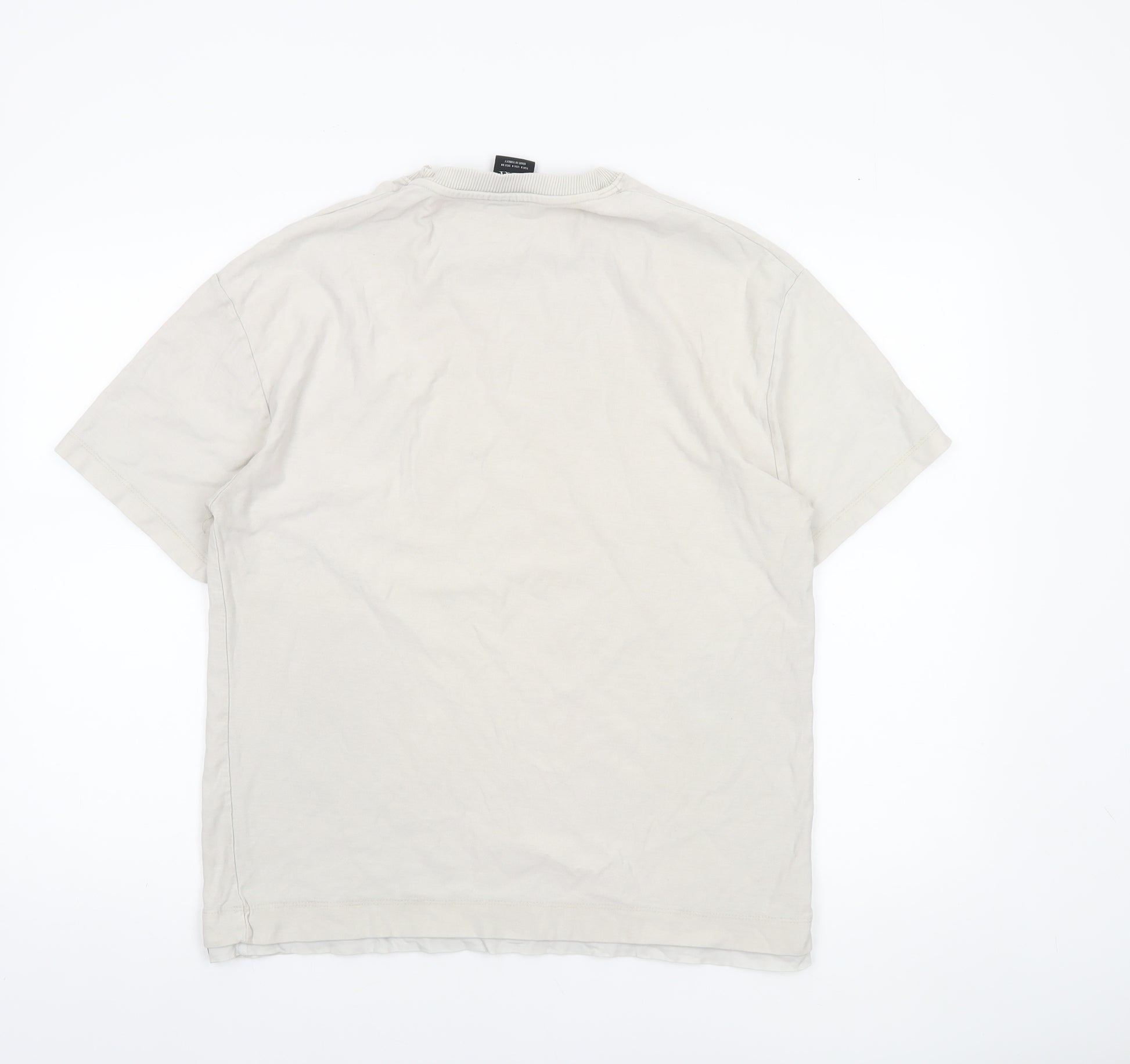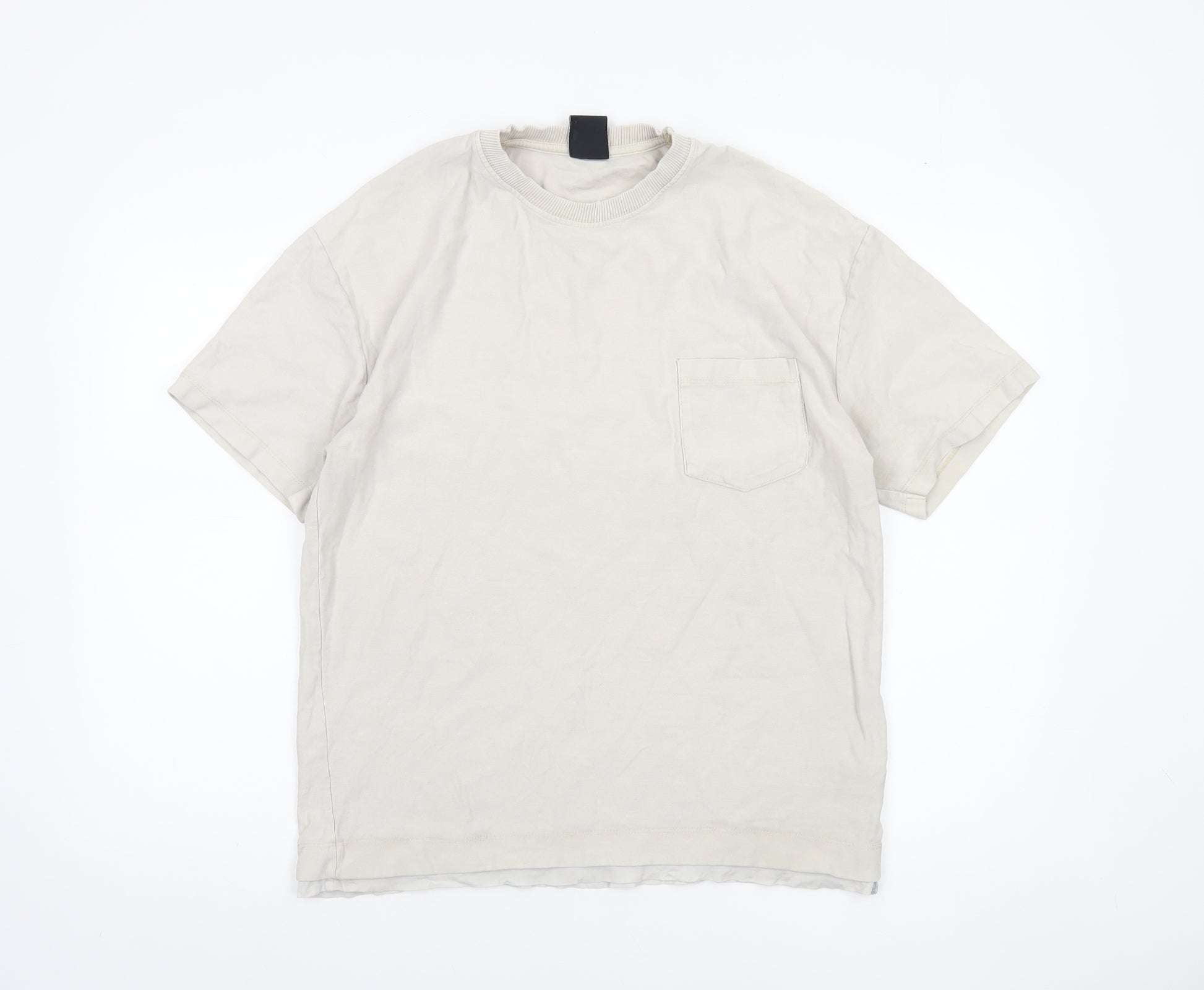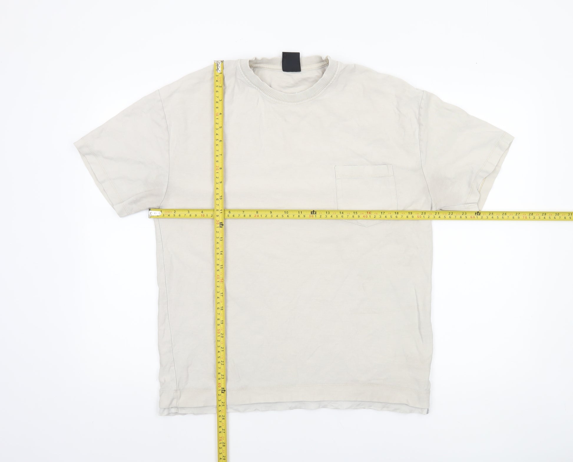 This Zara Men's Beige Crew Neck Short Sleeve T-Shirt offers understated style and reliability, perfect for everyday wear. Crafted from 100% soft cotton jersey, the lightweight and breathable fabric provides comfort throughout the day, making it ideal for layering or wearing on its own. The T-shirt features a classic crew neckline, short sleeves, and a single pocket on the chest, adding a subtle design touch while maintaining a clean, minimalist appeal. Its regular fit ensures a comfortable and natural drape suitable for various body types, while the neutral beige tone allows for easy pairing with jeans, chinos, or shorts. Designed for versatility, this timeless cotton T-shirt transitions effortlessly across seasons, from cool spring layering to warm summer days. Made by Zara, it embodies the brand’s contemporary aesthetic with casual refinement. Its durable cotton construction ensures long-lasting wear and easy garment care, as the T-shirt is conveniently machine washable. Although previously owned, it remains in very good condition with only light general wear visible, maintaining its structure and softness. Perfect for men seeking a relaxed yet stylish everyday essential, this beige T-shirt blends utility and modern simplicity in equal measure. Whether worn casually or as part of a minimalist smart-casual outfit, it’s a wardrobe staple that works across multiple looks. Add this reliable, modern basic from Zara to your wardrobe for an effortless style update and everyday comfort you can count on.