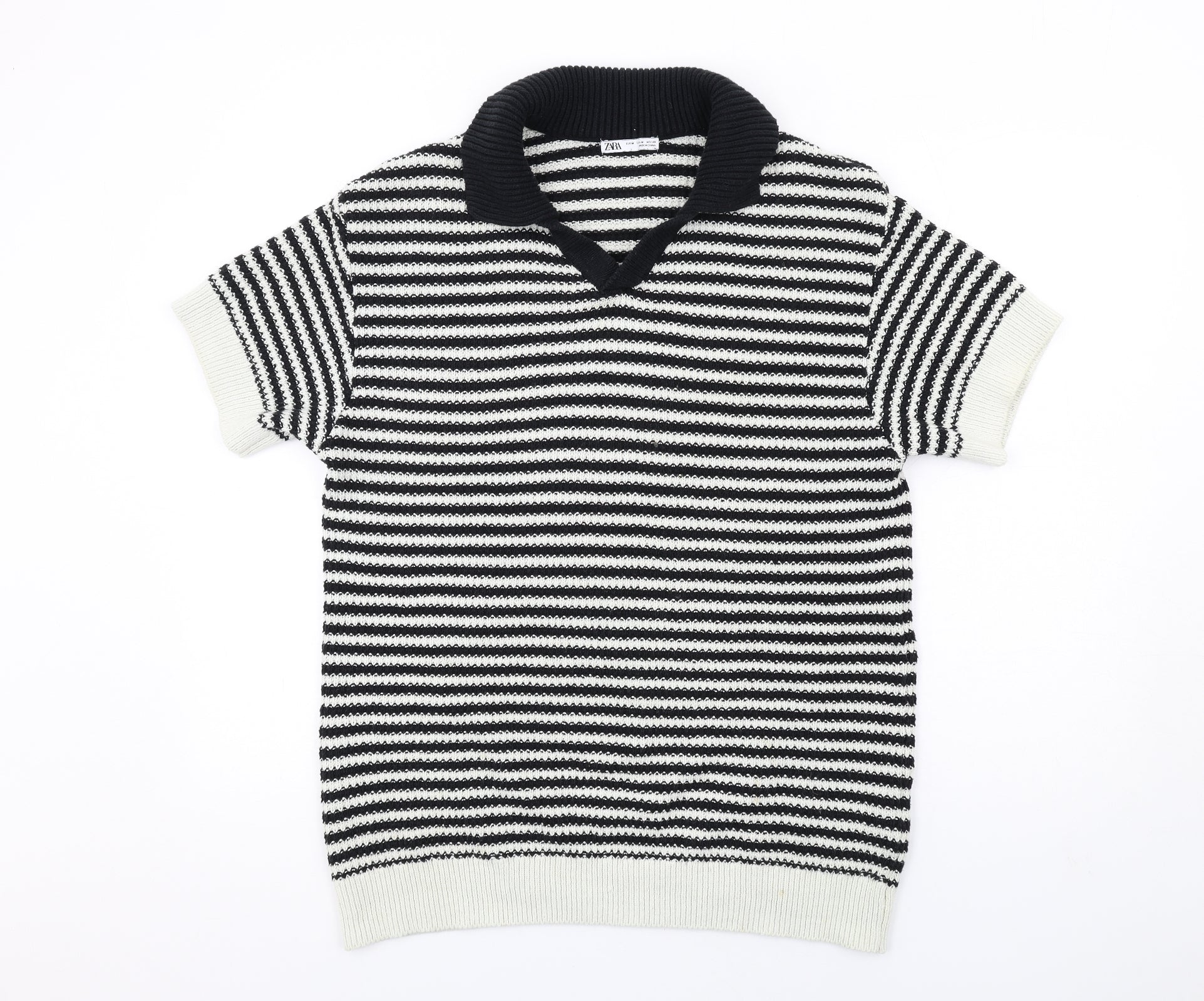 Mens Black Collared Striped Cotton Pullover Jumper Size M Short Sleeve