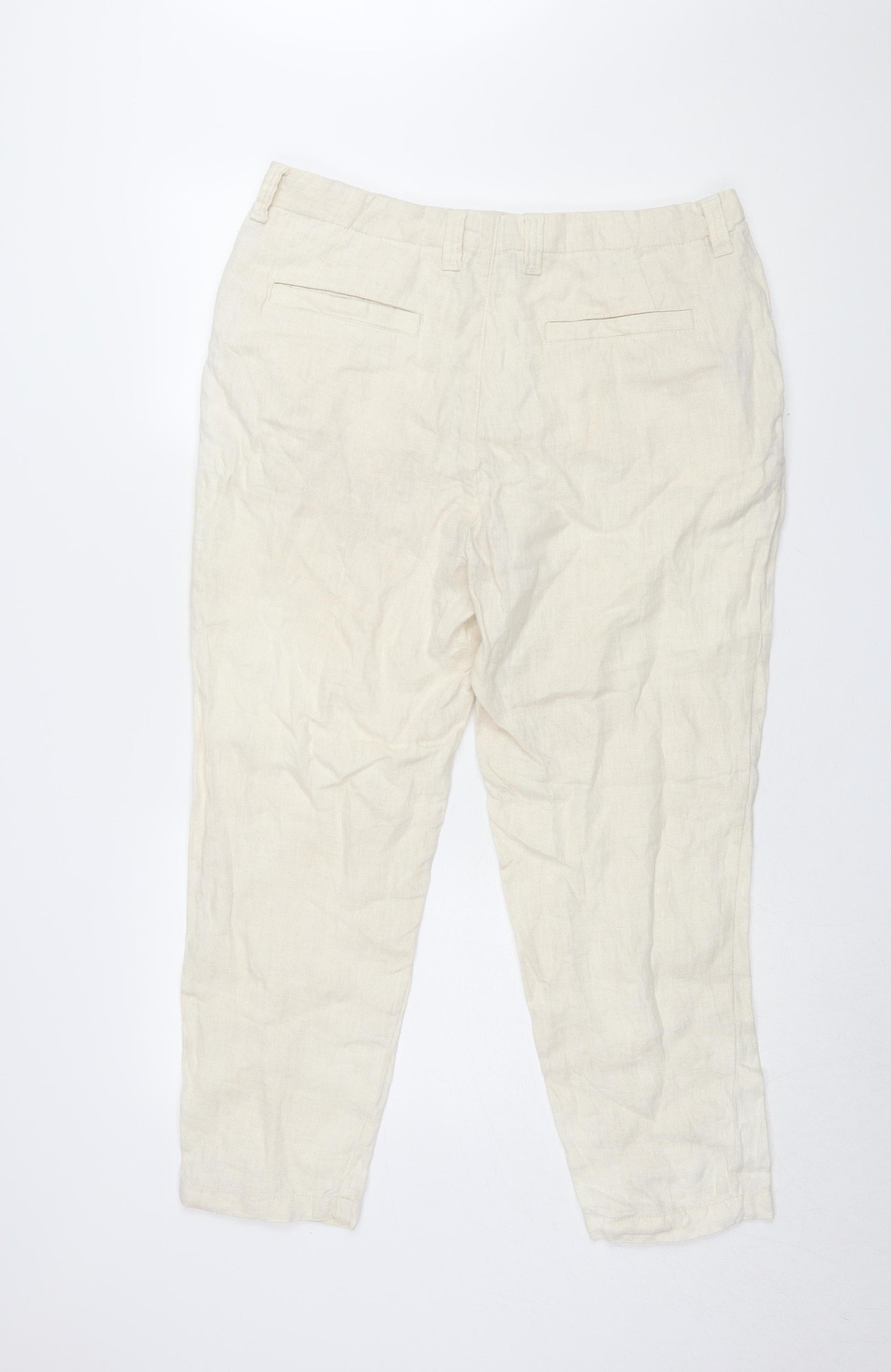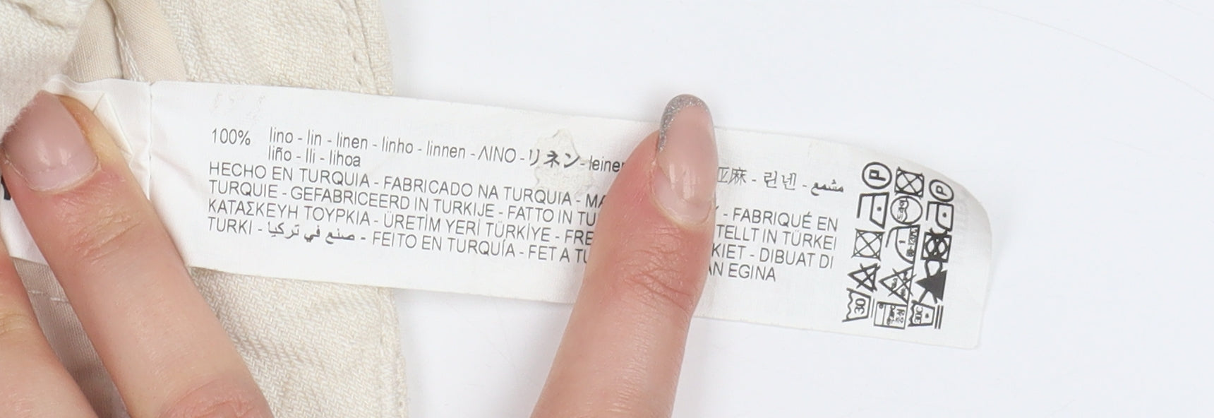 Discover the perfect blend of comfort and style with these Zara men's ivory linen cropped trousers. Made from 100% linen, these trousers offer breathability and softness ideal for both spring and summer months. The regular fit, combined with the straight leg style, ensures a relaxed yet refined look. The trousers feature a button and drawstring closure at the waist, offering adjustable comfort and a personalised fit. With a practical elastic waist and convenient slash pockets, these trousers are as functional as they are stylish. The flat front and lack of pattern add to the sleek, understated aesthetic, making them a versatile addition to your casual wardrobe. Despite being pre-loved, they are in excellent condition with only minor wrinkles typical of natural linen. Perfect for casual occasions, these trousers coordinate well with a variety of tops, offering a flexible wardrobe solution. Embrace timeless style and comfort with these must-have trousers from Zara.