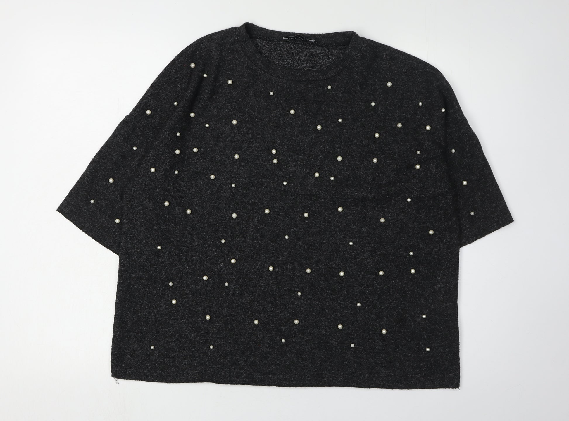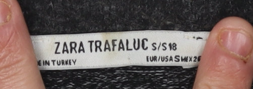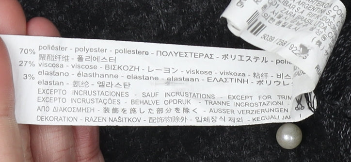 Discover the elegant charm of the Zara Trafaluc Women’s Black Pullover Jumper, a stylish addition to your casual wardrobe. Designed with a classic crew neck and short sleeves, this knit jumper offers a comfortable fit in size S, perfect for everyday wear. Adorned with exquisite beaded accents, it introduces a touch of sophistication and style. Crafted from a high-quality blend of materials, including 70% polyester, 27% viscose, and 3% elastane, this jumper ensures a soft, breathable feel while maintaining its shape. Though it features pearl-like beading, a minor detail may include some missing accents, yet its overall aesthetic remains striking and appealing. Ideal for the spring season, this Zara piece can easily be paired with your favourite trousers or skirts to create a chic ensemble. Designed primarily for the discerning woman who appreciates subtle elegance with a modern twist, this jumper is not only a versatile staple but also an eye-catching attire for casual occasions. While sold in excellent condition, it provides tremendous value, boasting durability combined with style. Don’t miss out on this opportunity to refresh your collection with this fashionable and unique knit piece, available now at a compelling price.