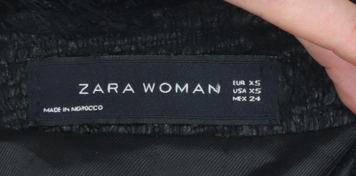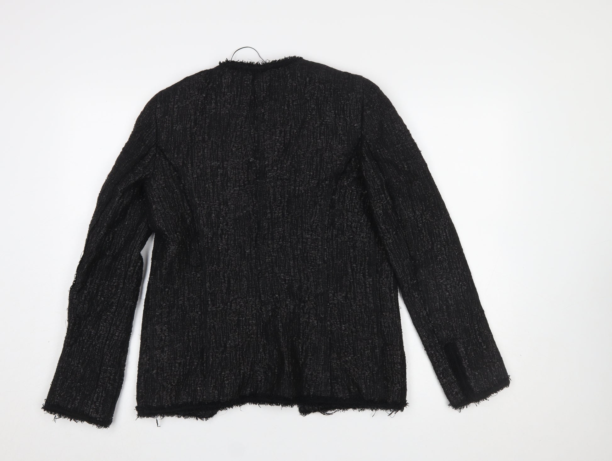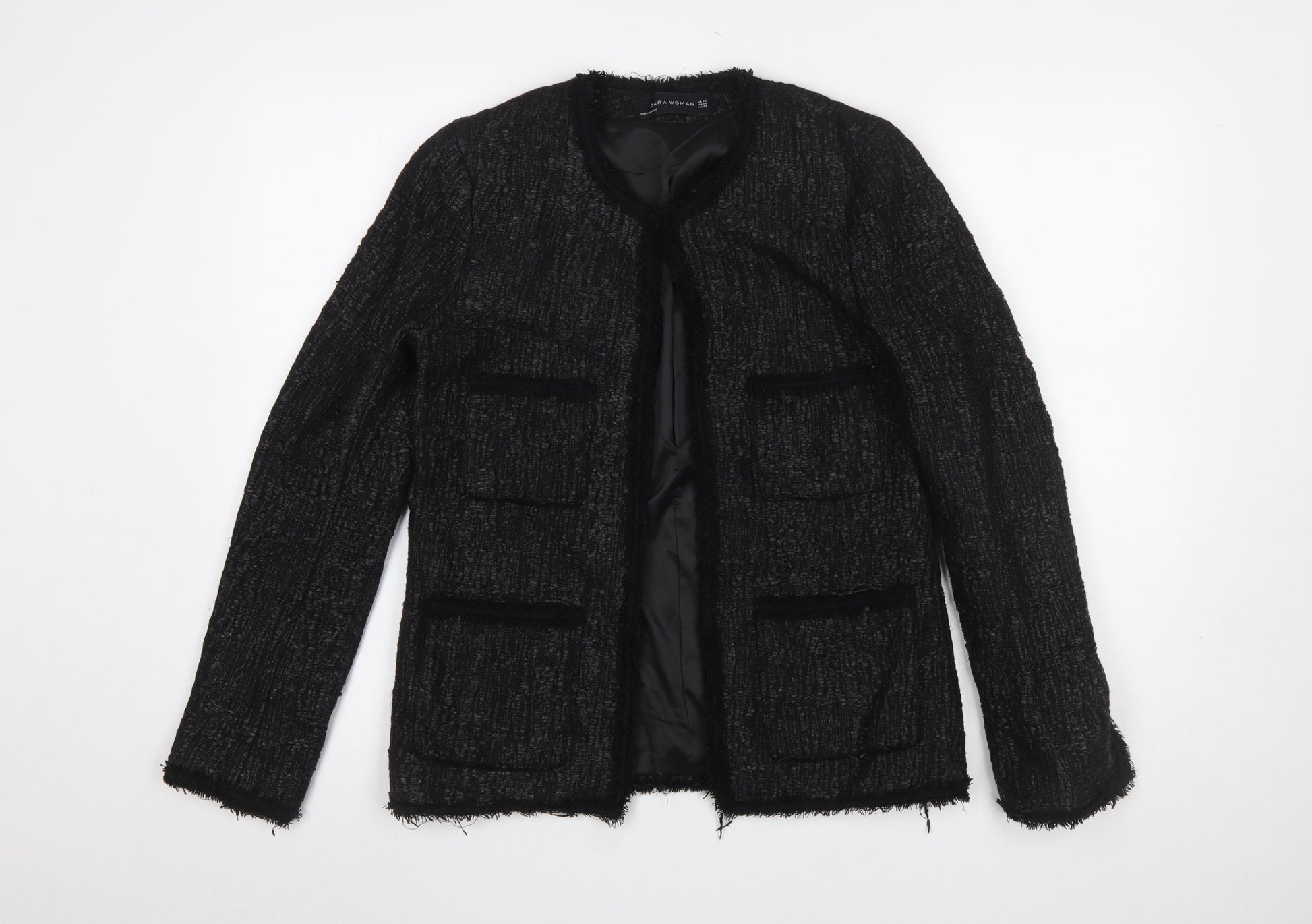 Elevate your wardrobe with this sophisticated Zara Woman black bouclé blazer, tailored to perfection for women who appreciate modern elegance. Crafted from a blend of 95% polyester and 5% elastane, this jacket offers structure with a subtle stretch for added comfort and movement. The textured bouclé fabric lends a refined, tactile finish while the fully lined interior enhances both durability and comfort when worn. Designed in a regular fit, this single-breasted blazer features long sleeves, multiple front pockets, and a clean, open-front design without buttons, ensuring an effortlessly sleek silhouette. Its edge-frayed detailing gives a contemporary twist to a timeless staple, perfect for styling with trousers, skirts, or dresses. Ideal for business meetings, smart casual occasions, or as a versatile piece for workwear, this jacket transitions beautifully between formal and everyday looks. The deep black tone makes it an easy wardrobe match for any season, especially during autumn and winter. Zara’s signature approach to blending classic tailoring with modern minimalism is evident throughout. The jacket is in excellent pre-owned condition with minimal signs of previous wear and no visible flaws. Whether you're refreshing your office attire or adding a polished piece to your evening look, this Zara Woman blazer is a must-have that pairs effortlessly with both understated and bold wardrobe choices. Perfect for expressing subtle sophistication while maintaining comfort and practicality, this piece demonstrates why Zara remains a favourite for chic, versatile fashion staples. Make this timeless blazer yours and enjoy its stylish functionality day to evening.