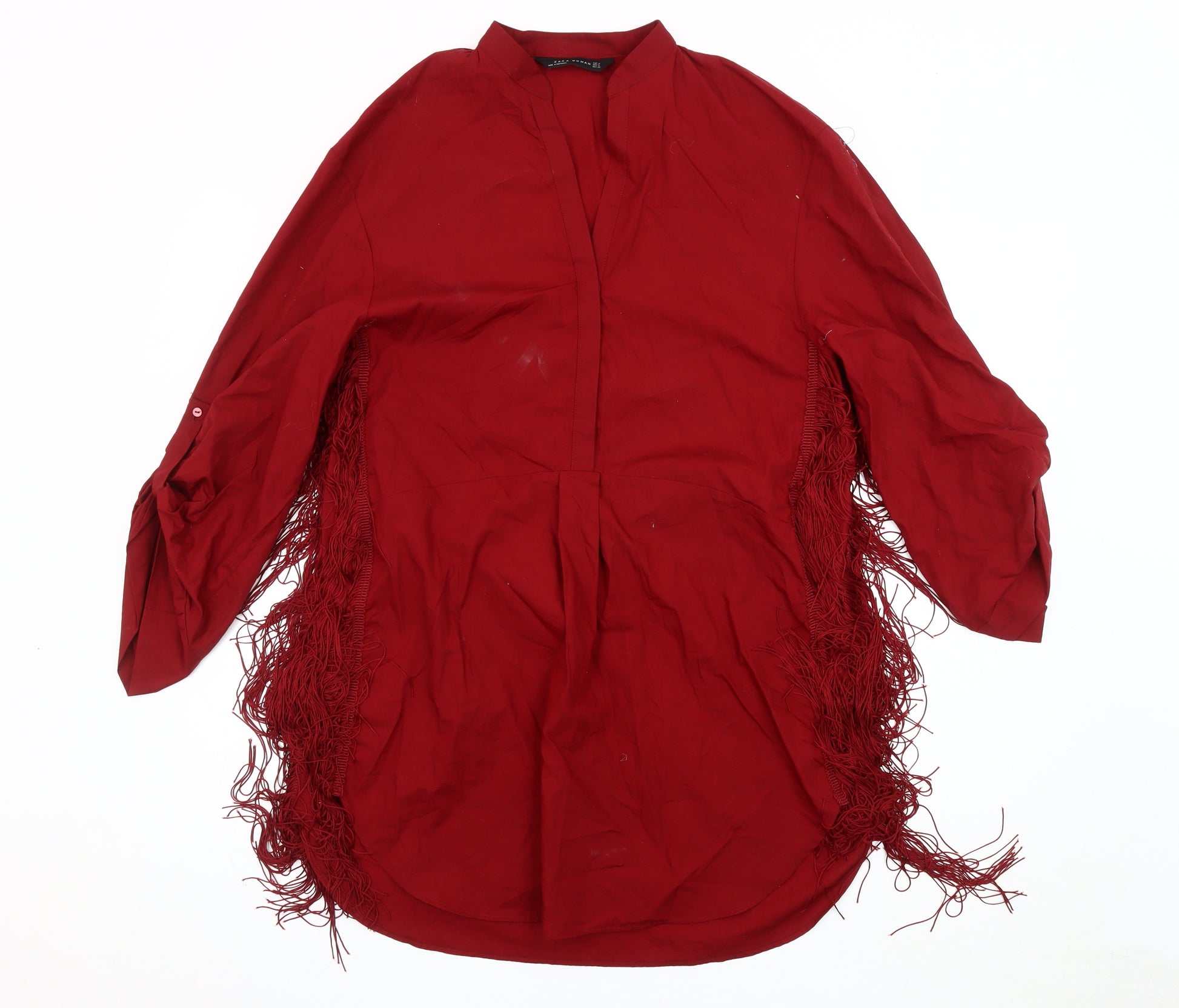 Elevate your wardrobe with this stylish red blouse from Zara Woman, perfect for any casual occasion. The rich red colour and unique fringe accents give it a trendy edge, while the comfortable 100% cotton material ensures you'll feel as good as you look. The tunic style offers a relaxed fit, complemented by a flattering V-neckline and 3/4 sleeves, making it an ideal choice for both spring and autumn outings. Whether you're teaming it with jeans for a laid-back day or adding accessories for a chic evening look, this blouse is your go-to versatile piece. Easy to maintain with machine washable care, it's a hassle-free addition to your fashion collection.