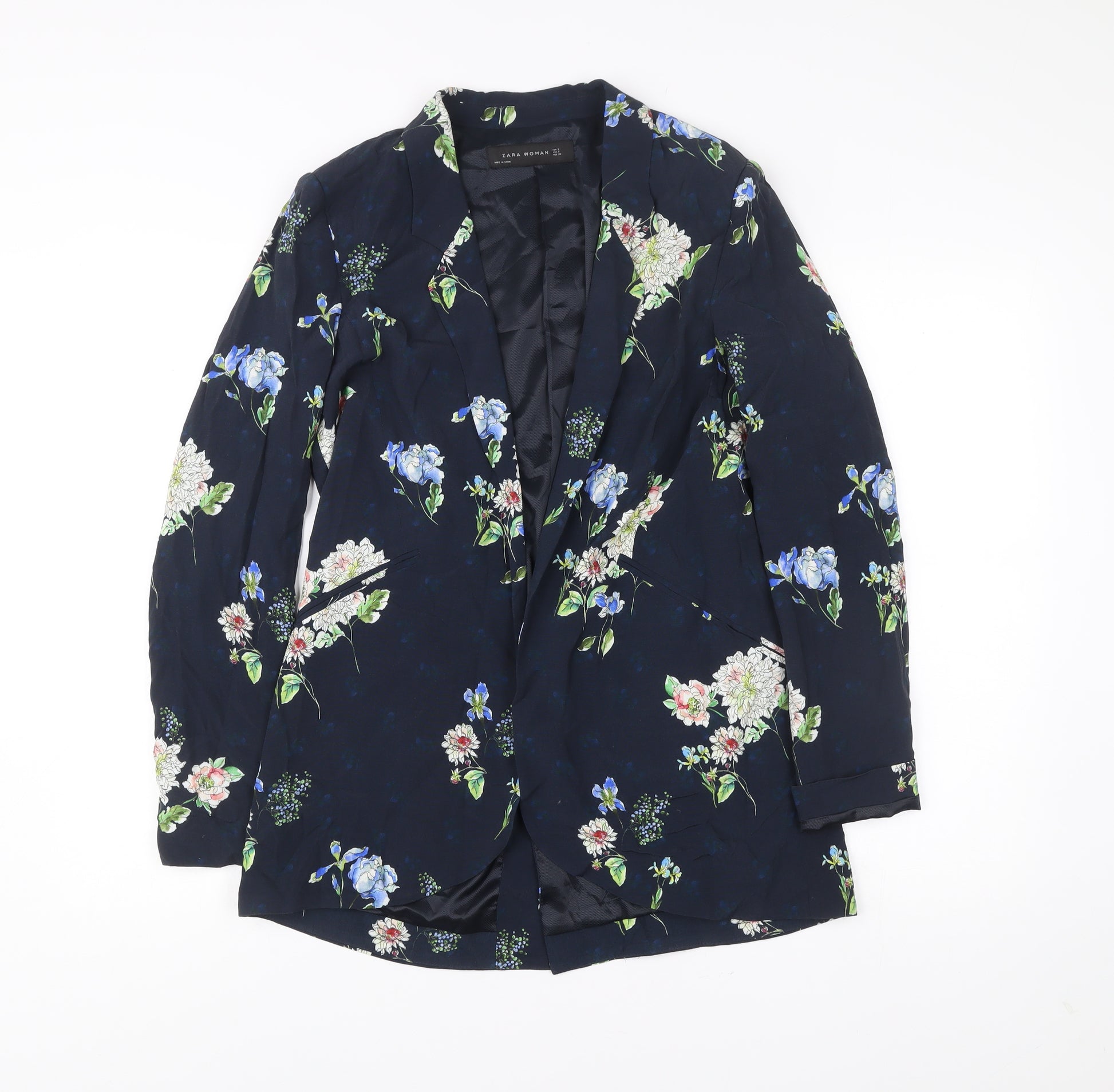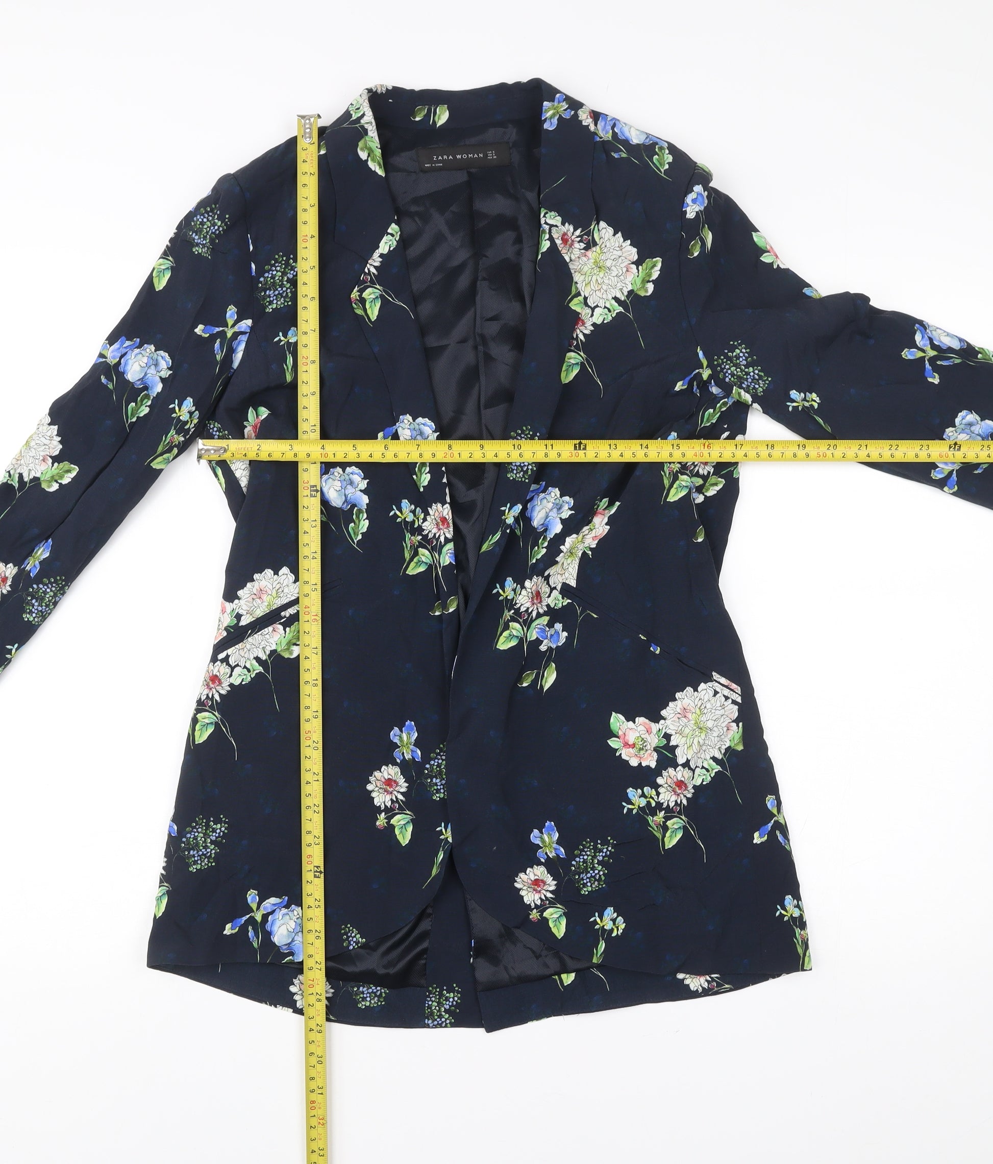 Step out in confident style with this Zara Woman floral blazer, perfectly blending sophistication with a touch of playful charm. Crafted in a sleek satin-style polyester fabric, this tailored piece features a striking floral print set against a rich dark background, making it a standout addition to any wardrobe. Designed in a flattering mid-length cut, this blazer delivers a confident and elegant silhouette that works effortlessly for office wear, evenings out, or paired with jeans for a chic casual day look.Thoughtfully constructed, this blazer includes a crisp collared neckline, a single-breasted front with button fastening, and practical front pockets for added functionality. The lining is finished in smooth polyester for comfortable wear all day long. With long sleeves and a regular fit, it’s a timeless staple, while the floral motif adds feminine charm. Lightweight yet structured enough to hold its tailored shape, it’s ideal for transitional seasons, especially spring and autumn.This versatile piece is suited for a wide range of occasions – whether you’re dressing for work meetings, formal evenings, or styled casually with trainers for weekend outings. The floral design gives a fresh, timeless appeal with a classic twist that ensures it won’t date, while the durable polyester composition makes it machine washable and easy to care for. The vibrant multicoloured flowers stand out beautifully against the darker base, offering a sophisticated and graceful layering option.In excellent pre-loved condition with minimal signs of wear and no flaws, this Zara Woman blazer promises longevity and enduring style. A must-have for women who appreciate wardrobe pieces that fuse high-street fashion with smart tailoring, this blazer captures the essence of contemporary elegance with everyday practicality. Comfortable, versatile, and stylish, it’s just the piece you need to elevate your fashion game across different seasons and settings.