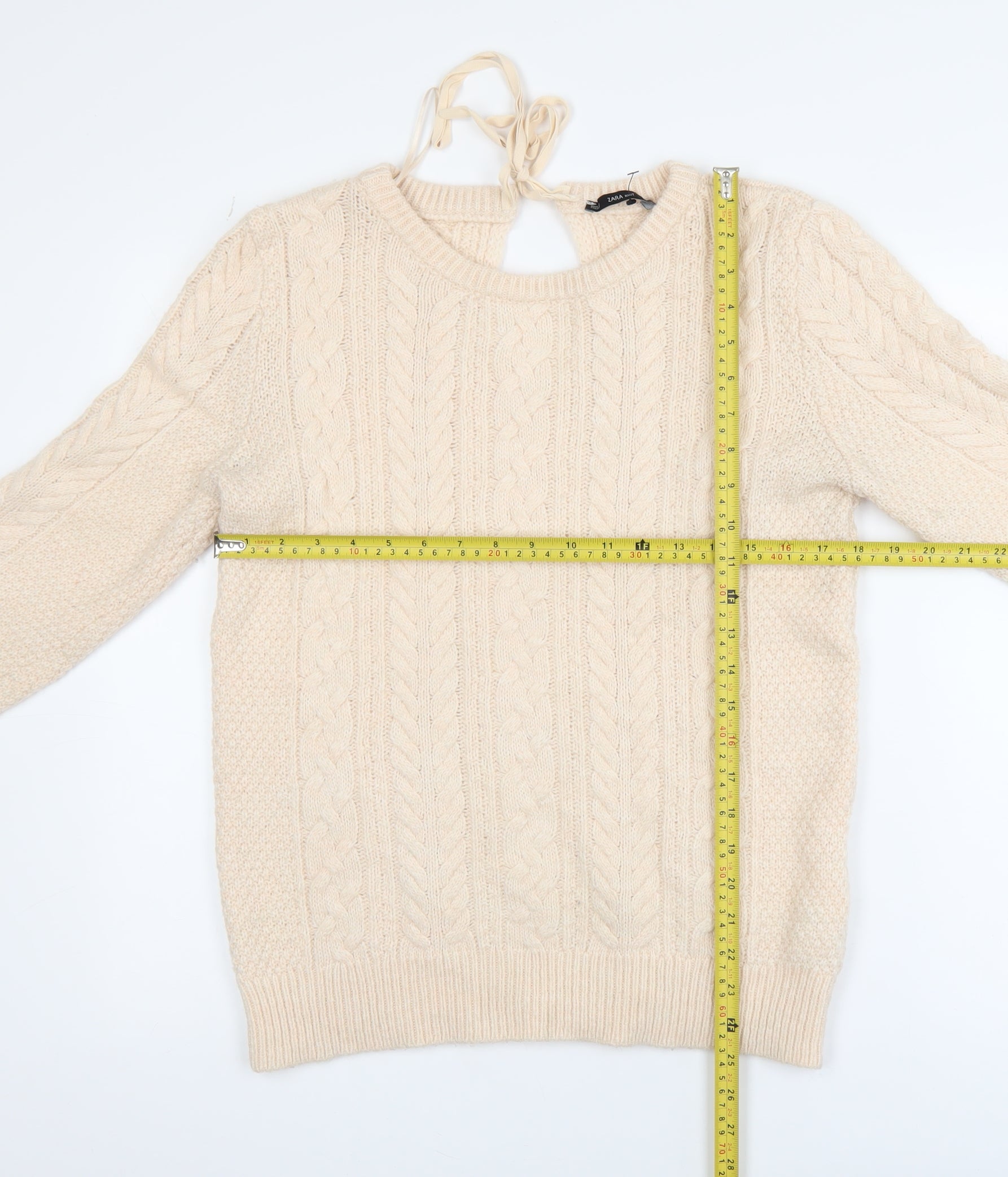 Stay cosy and stylish in this timeless Zara Women's Cable-Knit Pullover Jumper. Finished in a soft beige hue, this sweater perfectly blends everyday comfort with effortless elegance. Crafted from a premium knit blend of acrylic, polyester, and touch of mohair, it provides a warm yet lightweight feel, making it ideal for transitional and colder weather. The intricate cable-knit design adds classic charm to the garment, while the back bow accent adds a subtle feminine detail. Designed with a crew neckline and long sleeves, this pullover offers a relaxed fit that flatters a variety of body shapes while ensuring ease of wear. The textured knit pattern provides visual interest and a cosy tactile appeal, perfect for pairing with jeans, tailored trousers, or even layered skirts for an elevated seasonal look. Its neutral beige shade ensures versatility, effortlessly matching with a wide range of wardrobe staples. Suitable for casual or smart-casual settings, it’s a piece that transitions seamlessly from a day out shopping to a comfortable evening indoors. The fabric composition—54% acrylic, 25% polyester, and 11% mohair—offers warmth with added durability and softness. Perfect for autumn and winter wear, this jumper is a chic essential that delivers both warmth and sophistication. Condition is excellent with very light wear and no visible flaws, ready to wear right away. A fashionable yet timeless option for those who appreciate a mix of comfort and refinement. Ideal as a seasonal wardrobe update or a thoughtful gift, this Zara knit remains a reliable favourite, sure to complement any modern wardrobe.