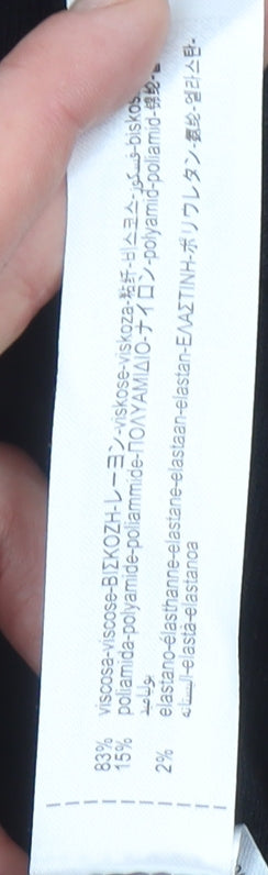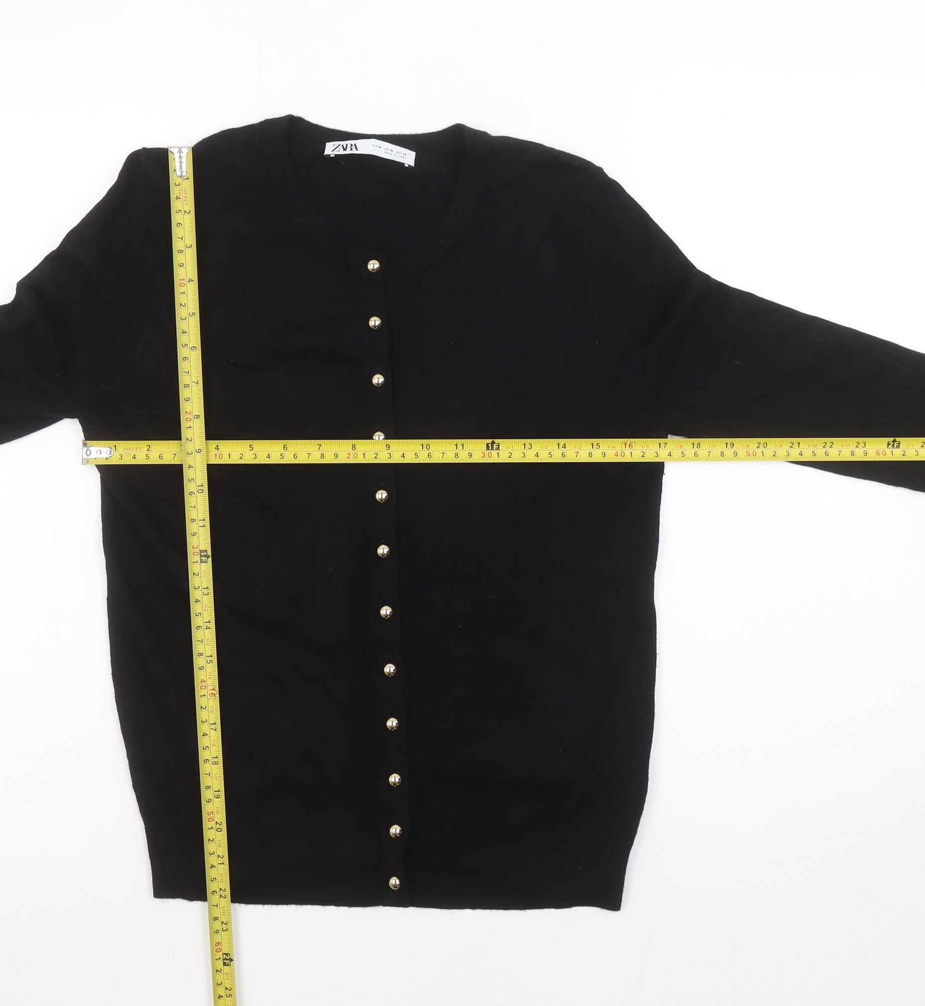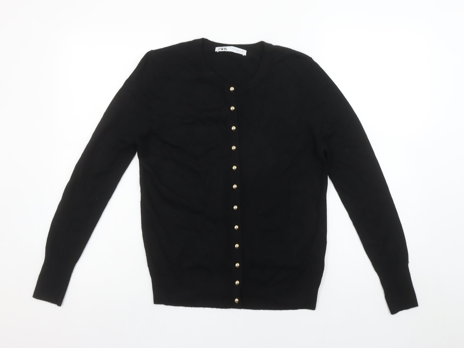 Upgrade your wardrobe with this classic black cardigan from Zara, the perfect blend of timeless style and versatile comfort. Designed for women, this cardigan features a flattering crew neckline and a front fastening with elegant gold-tone buttons that add a subtle touch of sophistication. Made from a soft and stretchable knit fabric, it provides excellent comfort and flexibility, making it an ideal choice for layering across multiple seasons. The material composition of viscose, nylon, and elastane ensures a lightweight yet durable texture that holds its shape beautifully. With a slim fit cut and long sleeves, this piece delivers a sleek silhouette suitable for both casual days and smart workwear settings.This Zara cardigan is crafted in a tight-knit design with a smooth, fine texture, keeping you warm in cooler months while remaining breathable enough for transitional weather in autumn or spring. The versatile black colour makes it an essential wardrobe staple that pairs effortlessly with jeans, tailored trousers, or skirts. Whether you wear it open over a blouse or buttoned up for a polished look, this piece offers endless styling potential.Perfect for those who appreciate minimalist yet elegant fashion, it's a must-have item that easily transitions from day to evening wear. In excellent condition with no visible flaws or signs of wear, this Zara cardigan offers great value for its timeless appeal and premium finish. Stylish, comfortable, and practical – this piece will quickly become one of your most-worn essentials.