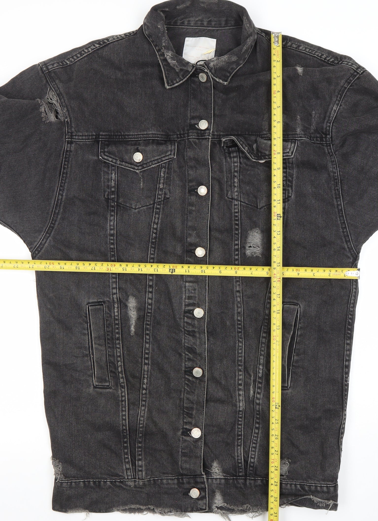 Step out in effortless edgy style with this Zara Women’s Black Distressed Denim Jacket in Size L. Designed with a relaxed silhouette, this longline jacket offers a modern take on the timeless denim staple. Crafted from 100% cotton, the high-quality material provides a soft yet durable texture, ensuring all-day comfort and long-lasting wear. The worn-in distressed detailing gives it a fashion-forward, grunge-inspired aesthetic that pairs beautifully with both casual and streetwear looks.The jacket features classic button fastening through the front, two chest pockets with flap closure, and two side pockets for convenience and practicality. Its raw hemline and artfully frayed edges create a chic, lived-in effect, while maintaining a structured design that flatters various body shapes. Perfect for layering over tops, jumpers, or dresses, this versatile piece transitions seamlessly across autumn and spring seasons.Zara’s commitment to keeping casualwear elevated is showcased in this piece, blending durability with design for women who appreciate bold yet wearable fashion. The relaxed fit provides free movement without compromising on fit and structure, allowing flexibility for multiple styling options. Pair this jacket with skinny jeans and ankle boots for an urban street look or throw it over a midi dress for an effortless contrast of tough and feminine appeal.Machine washable for easy care, this black denim jacket is ideal for building statement outfits with minimal effort. Pre-loved and in very good condition, it shows light wear consistent with its intentional distressed effect, enhancing the character and individuality of the piece. Combining practicality, comfort, and fashion, this Zara denim jacket is a must-have outerwear essential for any trend-conscious wardrobe. Whether worn open for a casual vibe or buttoned up for a structured finish, it promises to be the go-to layer that completes any outfit with understated cool confidence.