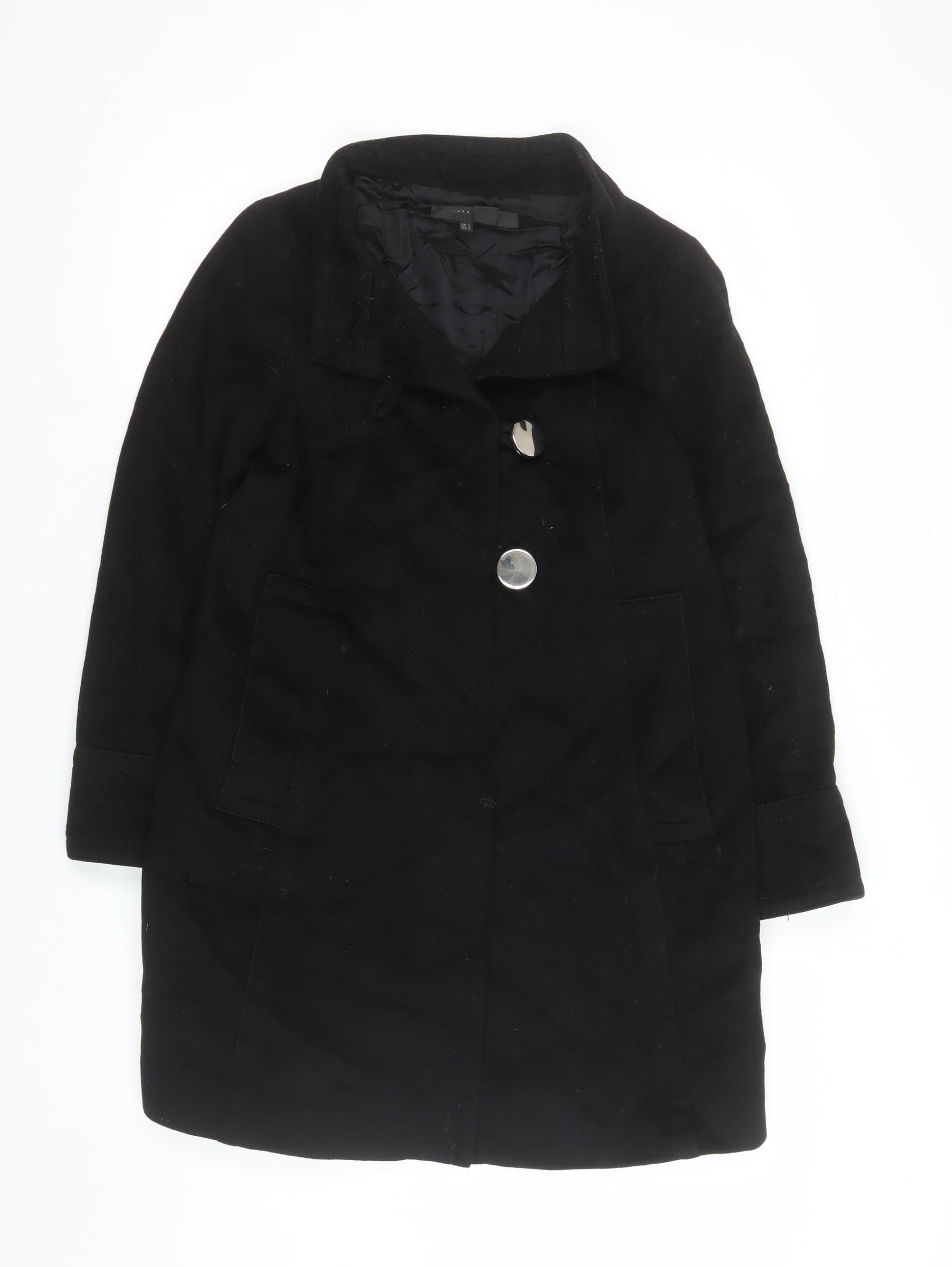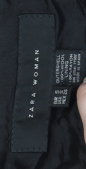 Elevate your cold weather style with this timeless black wool overcoat from Zara Woman. Expertly crafted from 100% wool, this mid-length coat offers both warmth and elegance, ideal for the autumn and winter seasons. The coat features a structured silhouette with a neat collar and two large front pockets that combine practicality with polished design. Finished with oversized metallic buttons on the front and rear belt detail, it adds a refined yet contemporary touch to any outfit. Fully lined in soft rayon for comfort, the coat embraces a classic aesthetic designed for versatile wear, suitable for both business and casual occasions. Its button-through closure and long sleeves provide reliable coverage, while the minimalist black tone makes it effortlessly stylish and easy to pair with your wardrobe favourites. Perfect for city strolls, commutes, or evening outings, this Zara piece ensures you stay chic and comfortable whatever the occasion. Condition is very good with just slight wear and light lint visible, showing gentle use but maintained in great shape. This classic black coat is a wardrobe staple that represents Zara’s sleek and modern approach to womenswear—ideal for anyone seeking a practical, well-tailored piece that never goes out of style.