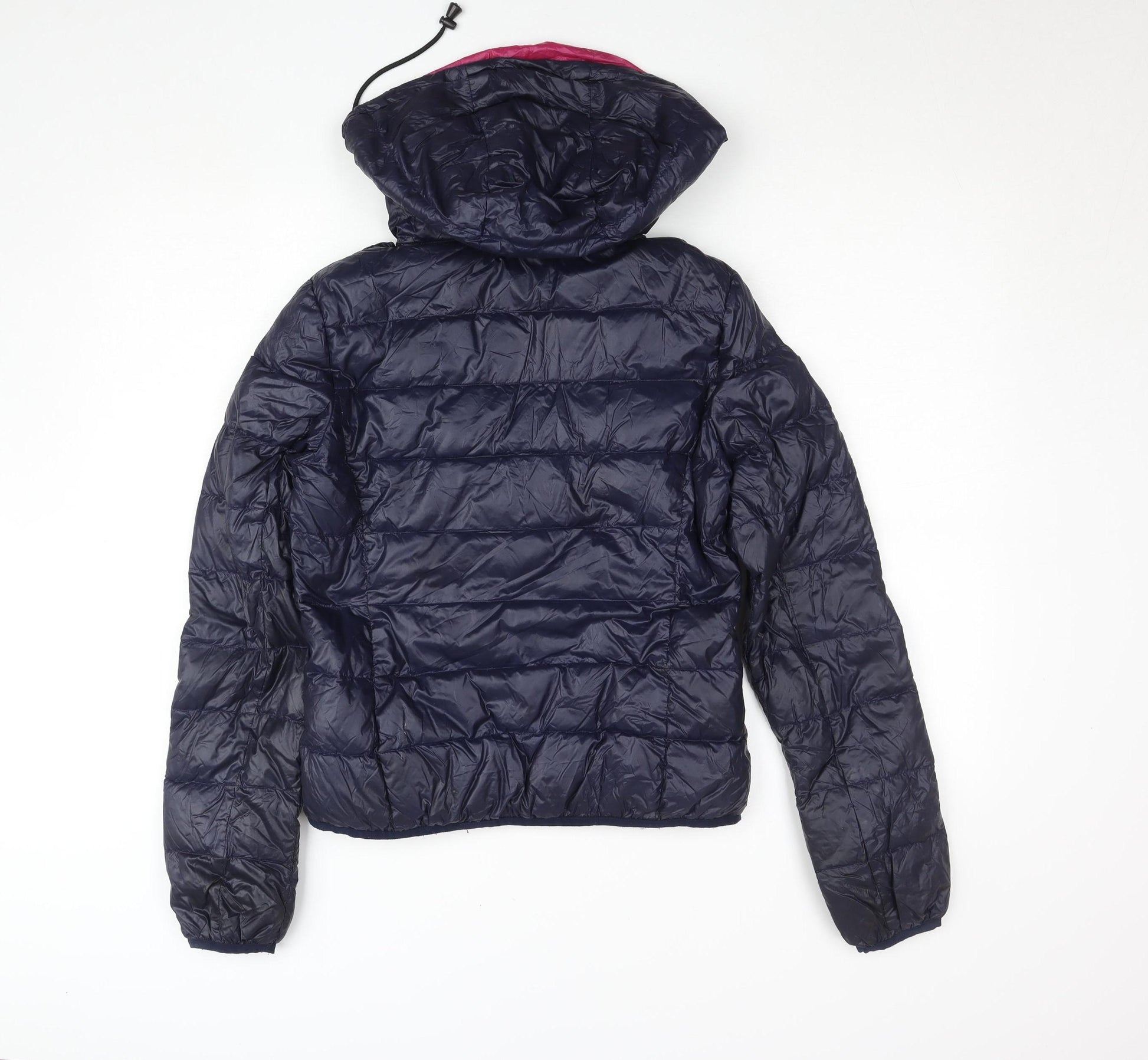 Stay warm and stylish in this Zara Women TRF Warm Wear puffer jacket, designed to combine functionality with a sleek, urban look. The rich navy blue outer shell contrasts beautifully with the vibrant pink lining, offering a touch of colour that stands out while maintaining an effortlessly chic aesthetic. Crafted from 100% nylon, this lightweight jacket provides excellent durability and resistance to light moisture, making it ideal for everyday wear or outdoor adventures. The jacket is insulated with real down for superior warmth without the bulk, perfect for cool autumn evenings or crisp winter days. Featuring a handy hood for added protection and a full zip closure that ensures comfort and ease of wear, this jacket is practical as well as stylish. The quilted design not only enhances insulation but also gives the jacket its signature puffer look, while the fitted cut maintains a flattering silhouette. Thoughtful details such as elasticated cuffs and zip-fastened front pockets provide convenience and help keep the warmth in, making it ideal for travel or casual outings. An excellent addition to your outerwear collection, this Zara jacket delivers timeless appeal and reliable comfort in cold weather. Whether paired with jeans for a relaxed street-style look or layered over a cosy jumper for extra warmth, it remains versatile and on trend. In very good pre-owned condition with minimal signs of wear, it’s ready to bring warmth and style to your wardrobe at great value. This women’s jacket is ideal for those who appreciate a blend of practicality and fashion in their everyday essentials.