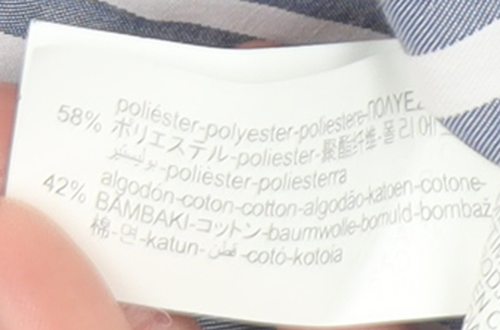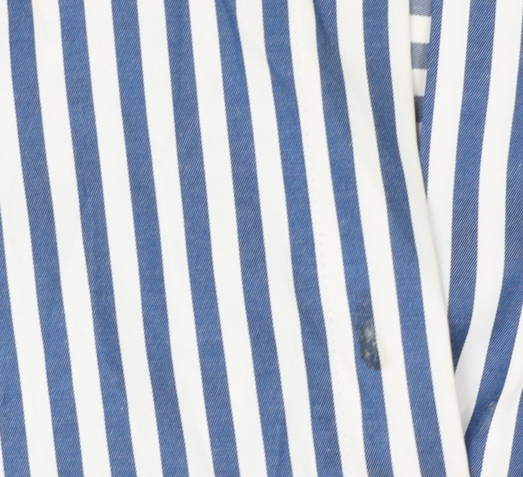 Elevate your wardrobe with this classic blue and white striped button-up shirt from ZARA, designed for women seeking a polished yet effortlessly stylish look. Crafted from a breathable and lightweight woven blend of 58% polyester and 42% cotton, this shirt offers optimal comfort and a smooth finish that's perfect for all-day wear. The timeless collared neckline and button-front closure create a sophisticated silhouette, while the curved hem and relaxed fit maintain a chic, modern edge suitable for multiple occasions, from casual outings to workwear settings. The vertical stripe pattern elongates the figure, delivering a flattering profile, while the long sleeves with fitted cuffs add an element of refined structure. This versatile shirt is great for layering under blazers or pairing with denim, trousers, or skirts, making it an indispensable addition to any wardrobe. Perfect for spring, summer, and autumn seasons, its breathable nature ensures comfort during warmer days, while the polyester-cotton mix adds easy-care durability. Although pre-loved and in good condition, there is a minor dark mark on the front that doesn’t detract from the shirt’s overall smart appearance. Ideal for women who appreciate understated yet polished style, this ZARA striped shirt embodies a timeless appeal that transcends trends. Whether you’re dressing for the office, a lunch date, or a casual weekend, it fits effortlessly into every lifestyle. Machine washable for convenient care, this shirt delivers both practicality and elegance. A must-have for fans of smart casual fashion and classic wardrobe essentials, this ZARA shirt offers both quality and impeccable taste at exceptional value.