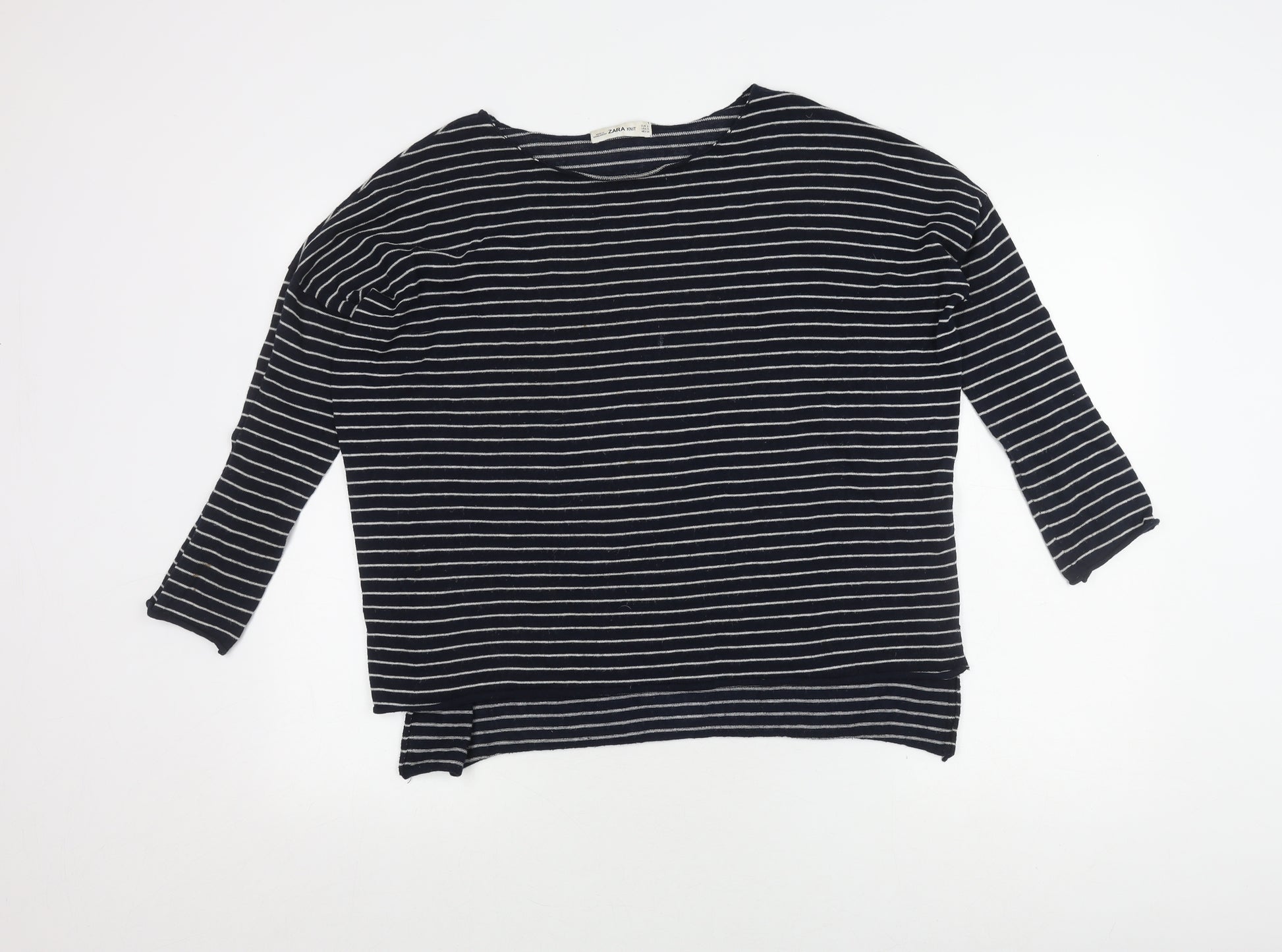 Elevate your wardrobe with this stylish Zara women’s pullover jumper, designed to offer both comfort and elegance. Made in Bangladesh, this piece boasts a 55% cotton and 45% polyester knit fabric, ensuring a soft and breathable fit. The classic round neck and 3/4 sleeves make it a versatile addition to any outfit, suitable for various casual occasions. Its navy blue hue with striped pattern adds a touch of sophistication and timelessness. Perfect for layering or wearing on its own, this jumper is machine washable, making it easy to care for. Whether you're heading to a casual outing or enjoying a relaxed day indoors, this Zara jumper ensures you stay stylish and comfortable.