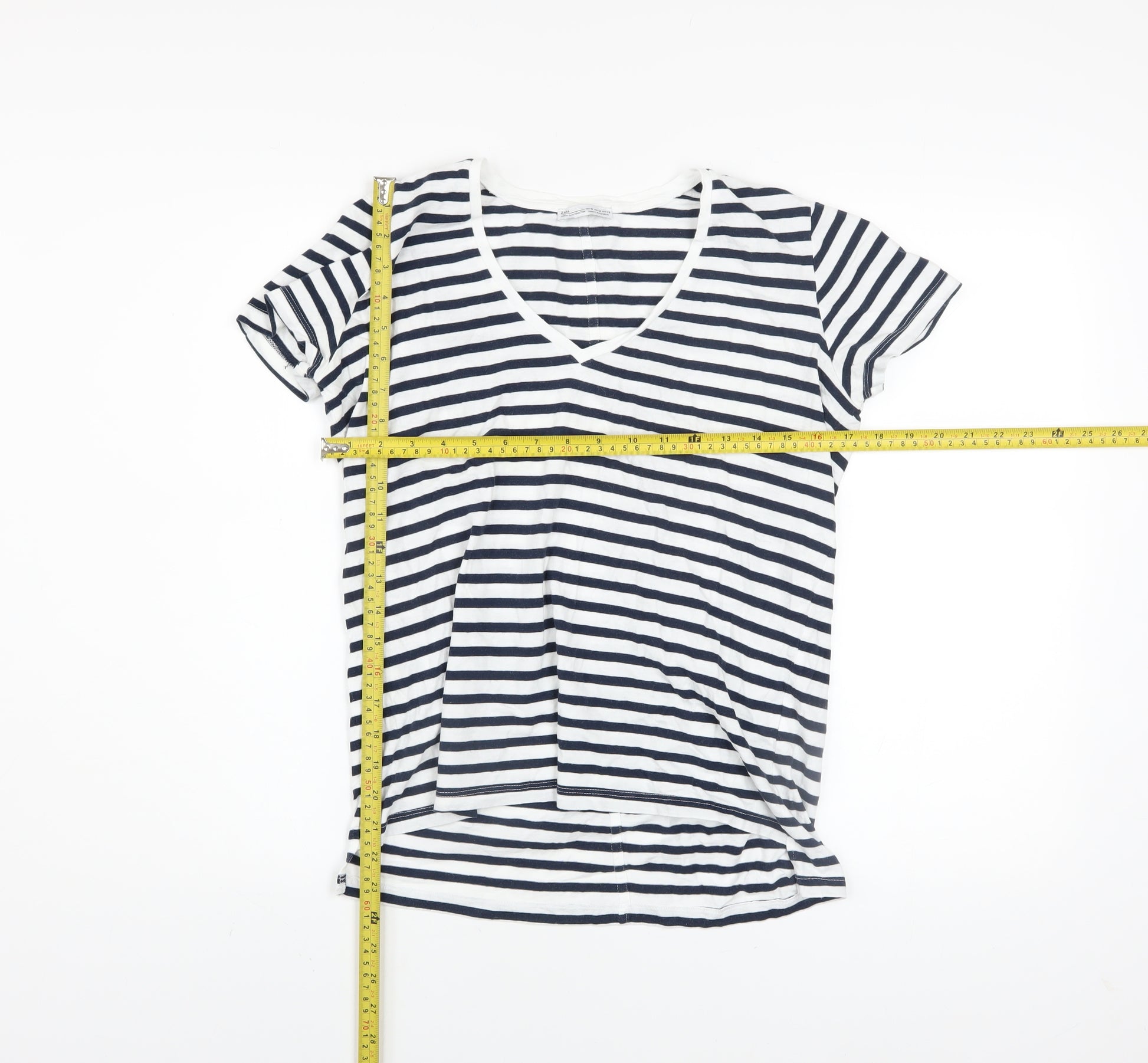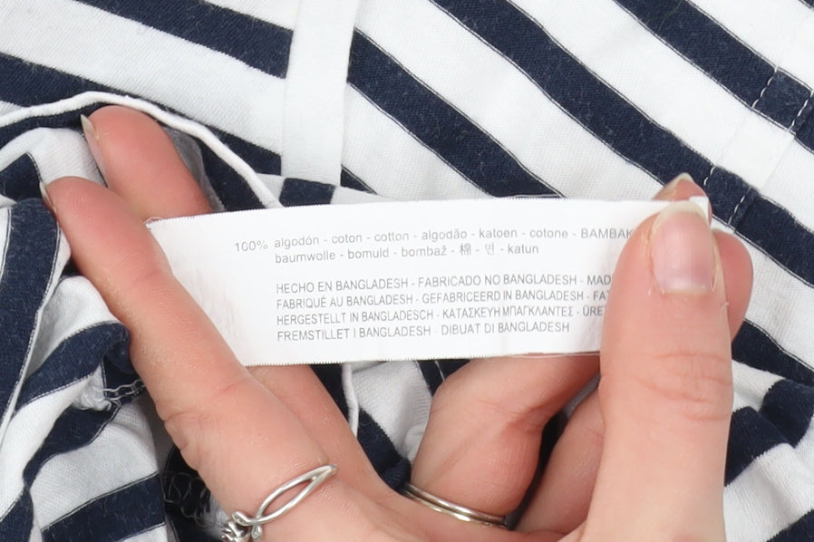Refresh your casual wardrobe with this beautifully soft striped T-shirt from Zara’s Woman Basic Collection. Crafted from 100% pure cotton, this lightweight jersey top offers breathable comfort and a flattering, relaxed fit, perfect for everyday wear. The classic navy and white striped pattern delivers an effortlessly timeless nautical style, complemented by a flattering V-neckline that adds a touch of femininity while keeping the look simple and versatile. Designed with short sleeves and a regular fit, it’s ideal for layering or wearing solo on sunny days. The soft cotton fabric keeps you cool and comfortable through spring and summer outings, while the simple pullover design makes it easy to style with jeans, shorts, or skirts. Whether you’re dressing for a weekend stroll, travelling light, or enjoying a relaxed brunch, this Zara stripe tee combines effortless chic with everyday practicality. Machine washable for easy care, it’s a reliable wardrobe staple that embodies understated style and quality. In excellent pre-owned condition, showing minimal signs of wear with no visible faults, this top is perfect for those who appreciate comfort and classic design. Pair it with denim or linen for an easy, polished weekend look. Simple, stylish, and versatile, this piece from Zara makes a great choice for women who love timeless essentials that stay fashionable season after season.
