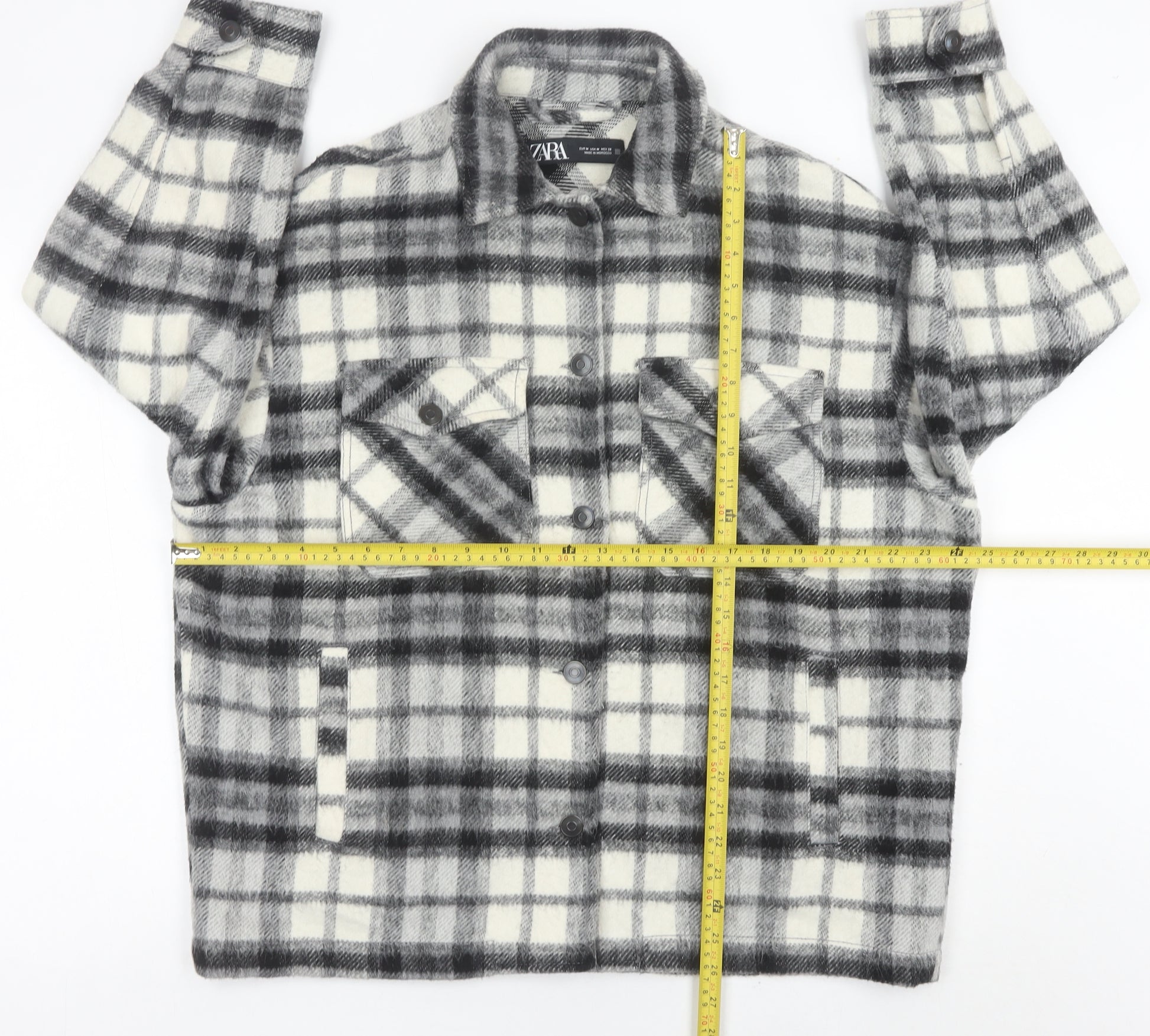 This stylish Zara women’s wool blend shirt jacket is the perfect layering piece for the cooler months. Designed in a contemporary grey plaid pattern, it combines a casual aesthetic with timeless charm. Crafted from a mix of acrylic, polyester, and wool, the mid-weight fabric provides comfort and warmth without being overly heavy, making it ideal for autumn and winter wear. The button-down front adds practicality while reinforcing the jacket’s classic shirt-style look. With long sleeves and a collared neckline, this piece offers versatility, easily pairing with jeans, casual trousers, or even a skirt for a smart-casual twist. The jacket is designed in a regular fit to ensure comfort, and features front flap button pockets for both style and function along with extra hidden hand pockets for practicality. The base material blend of 46% acrylic, 24% polyester, and 23% wool gives the jacket durability while maintaining a soft texture and structure that holds its shape well over time. It is a mid-length jacket, offering adequate coverage but leaving enough room for layering with jumpers, t-shirts, or lightweight knitwear depending on the weather. The grey plaid pattern is a versatile choice, complementing a wide variety of outfit and colour combinations. This piece is perfect for casual occasions, travel, or relaxed workwear settings where stylish comfort is key. Although pre-owned, the jacket is in excellent condition with no visible flaws, rips, or marks, having only light prior wear. With its timeless pattern and practical design, this Zara checked shirt jacket is an easy go-to for women looking for a piece that combines everyday wearability with fashionable detailing. Whether you’re running errands, meeting friends, or updating your work-from-home wardrobe, this versatile outerwear choice is sure to elevate your look while keeping you warm and comfortable.
