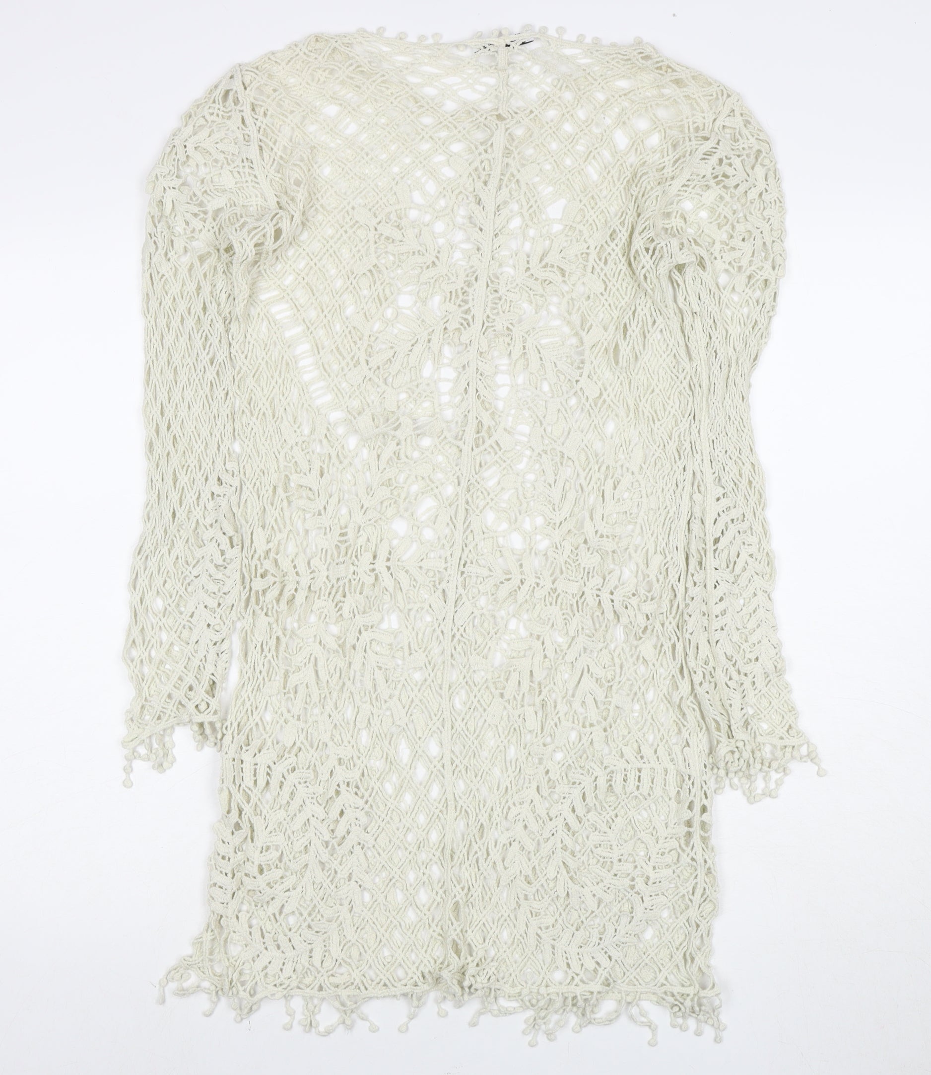 Step out in style with this exquisite ivory crochet sheath dress from Zara, perfect for adding a touch of elegance to your spring and summer wardrobe. Carefully crocheted to create a beautiful pattern, this lightweight dress showcases an effortlessly chic look suitable for casual outings or daytime gatherings. Crafted from pure cotton, it offers a soft and breathable wear, ideal for making you feel comfortable during warmer days.The long sleeves and the classic round neckline provide a timeless design, while the short length ensures a flattering silhouette. With a subtle zip closure at the back, this dress guarantees ease of wear. Its sheer style is sure to make heads turn when paired with contrasting accessories, perfect for fashionistas ready to make a statement. Dive into simplicity and embrace the understated elegance that this Zara dress represents. Enjoy unparalleled comfort without compromising on fashion. Make this your go-to piece for effortless elegance.
