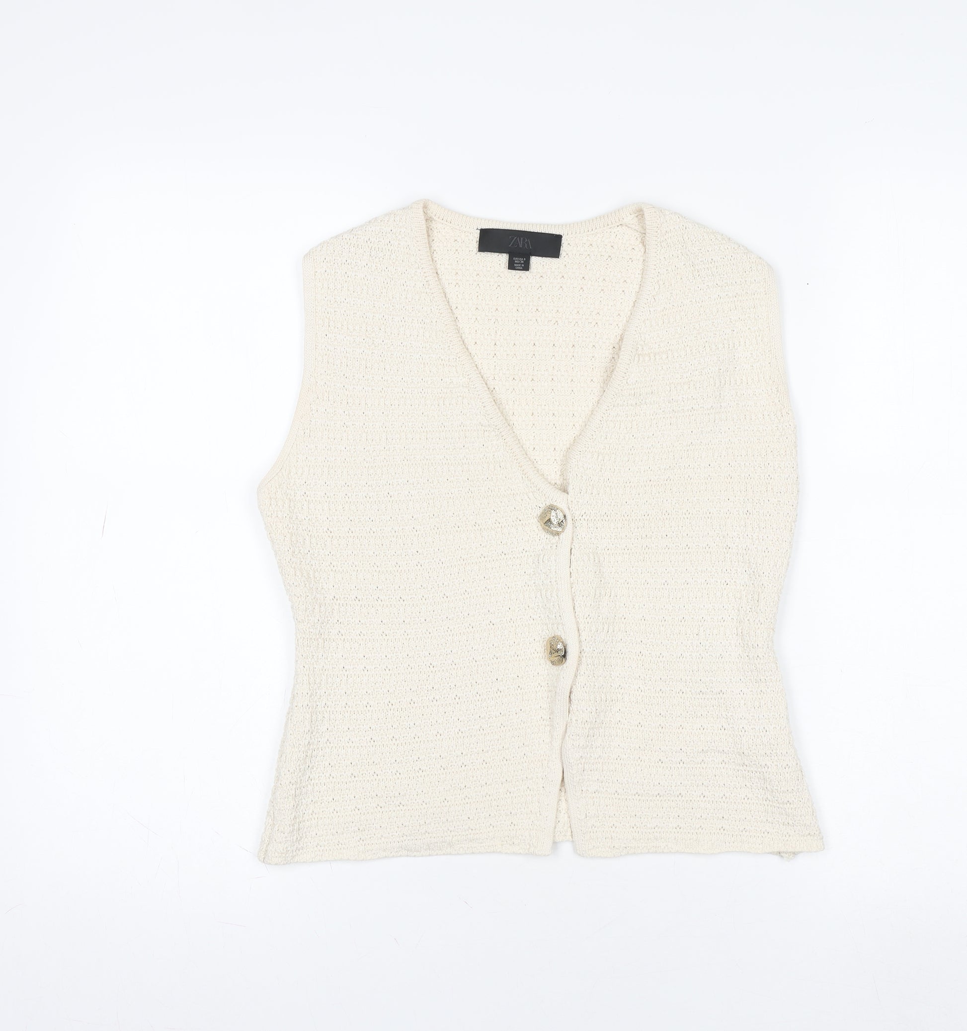 Discover effortless elegance with this sophisticated ivory sleeveless blouse from Zara, crafted in a beautifully soft knit that ensures both style and comfort. Perfectly lightweight and breathable, this classic V-neck top features a flattering fitted silhouette and two front button fastenings that lend a chic yet casual appeal. Designed in a refined solid ivory hue, it can easily transition from day to evening wear, offering versatile styling options for any modern wardrobe. The combination of cotton and polyester gives this piece a natural softness with improved durability, making it a practical choice that maintains its elegant shape throughout wear. The fine knit texture highlights Zara’s attention to detail and craftsmanship, while the minimalist design complements a wide range of looks—from smart business-casual ensembles to laid-back weekend outfits. Ideal for spring and summer months, this top pairs seamlessly with tailored trousers, high-waisted skirts, or denim jeans for a polished yet relaxed vibe. In excellent pre-loved condition, it shows minimal signs of gentle wear, ensuring it remains a stylish wardrobe addition for the discerning buyer. This versatile Zara blouse embodies understated sophistication and comfort, proving that timeless design never goes out of fashion. Whether layered under a blazer for work or worn alone with layered jewellery for a chic brunch-ready look, this top will quickly become a go-to favourite. Make room in your wardrobe for a piece that effortlessly balances comfort and refinement. A must-have for any stylish woman seeking classic charm with modern sensibility.
