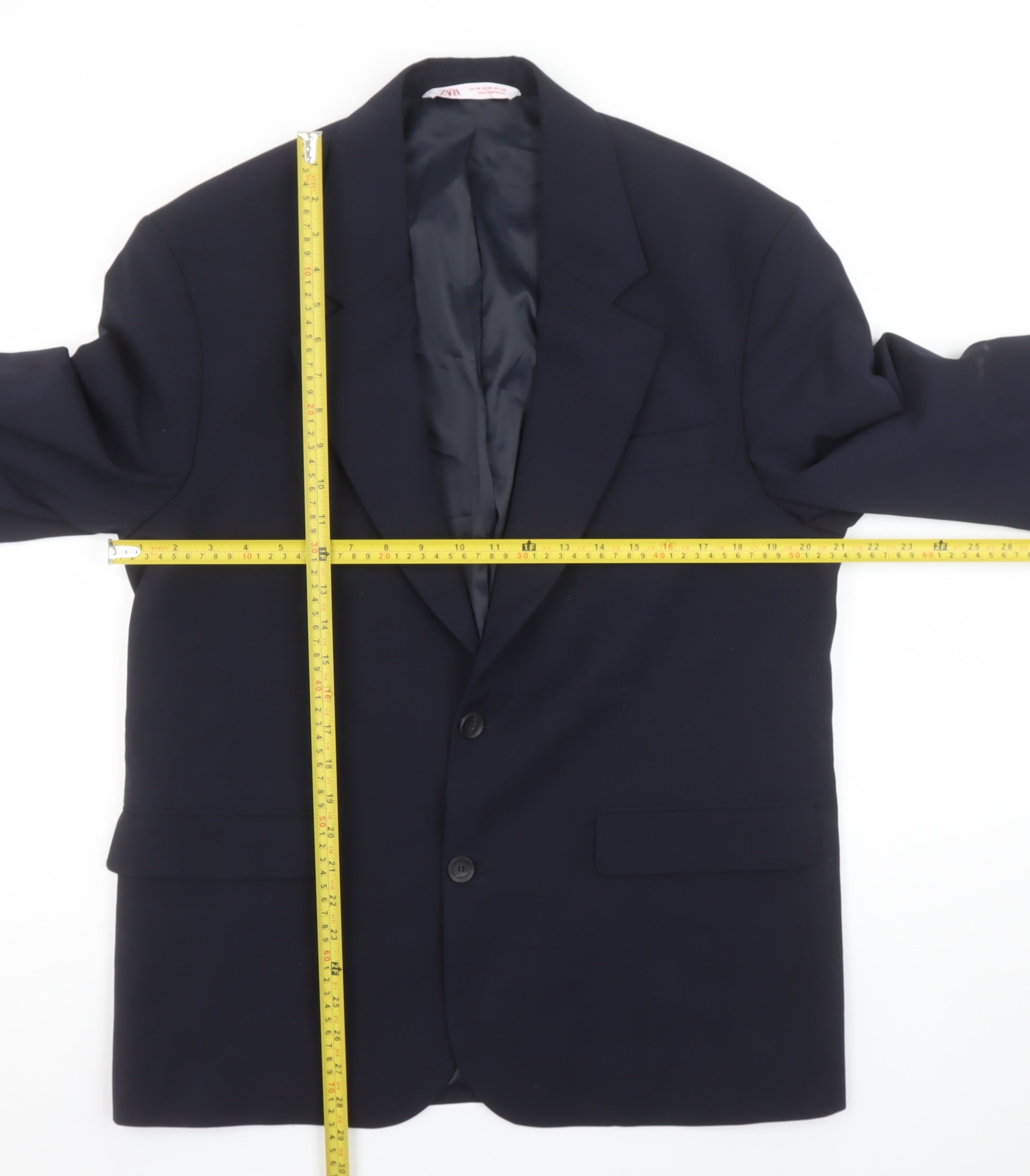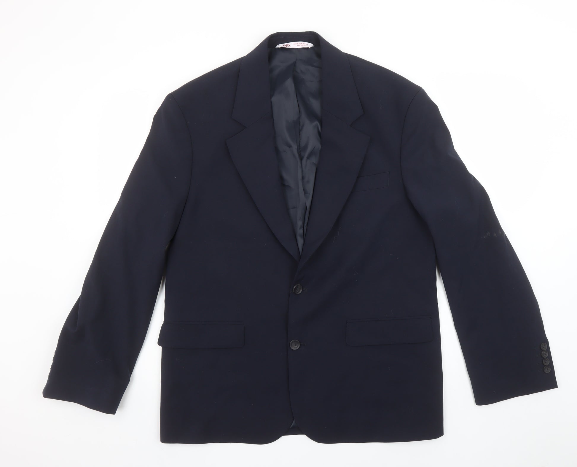 Step into timeless sophistication with this elegant Zara women's navy blue suit jacket. Expertly tailored for a sharp silhouette, this classic single-breasted blazer offers versatility and refinement for any wardrobe. The deep navy hue provides an effortlessly polished look suitable for business, smart casual, or formal occasions. Crafted from a smooth, woven fabric, the jacket showcases Zara’s signature minimalist style with structured shoulders, a notched lapel, inner lining, and a two-button front fastening. The fully lined interior enhances comfort and wearability, while the regular fit ensures an elegant yet relaxed profile perfect for layering over blouses, dresses, or tailored trousers. The thoughtful design includes flap front pockets and a chest pocket, adding both functionality and aesthetic detail. Designed to adapt seamlessly from day to evening, it’s an ideal piece for workwear, professional meetings, and sophisticated events. The condition is excellent, showing light surface marks typical of minimal previous wear. This stylish separate embodies understated luxury, making it a great choice for building a capsule wardrobe or refreshing your formalwear collection. Pair it with matching trousers or a skirt for a complete suit look, or wear it over a dress for a modern twist. Quality and style combine effortlessly in this Zara piece—a wardrobe staple that adds timeless elegance and confidence to your outfit. Perfect for year-round wear, this navy blazer exudes confidence and versatility, ideal for women who appreciate refined design and value practicality without compromising on sophistication.