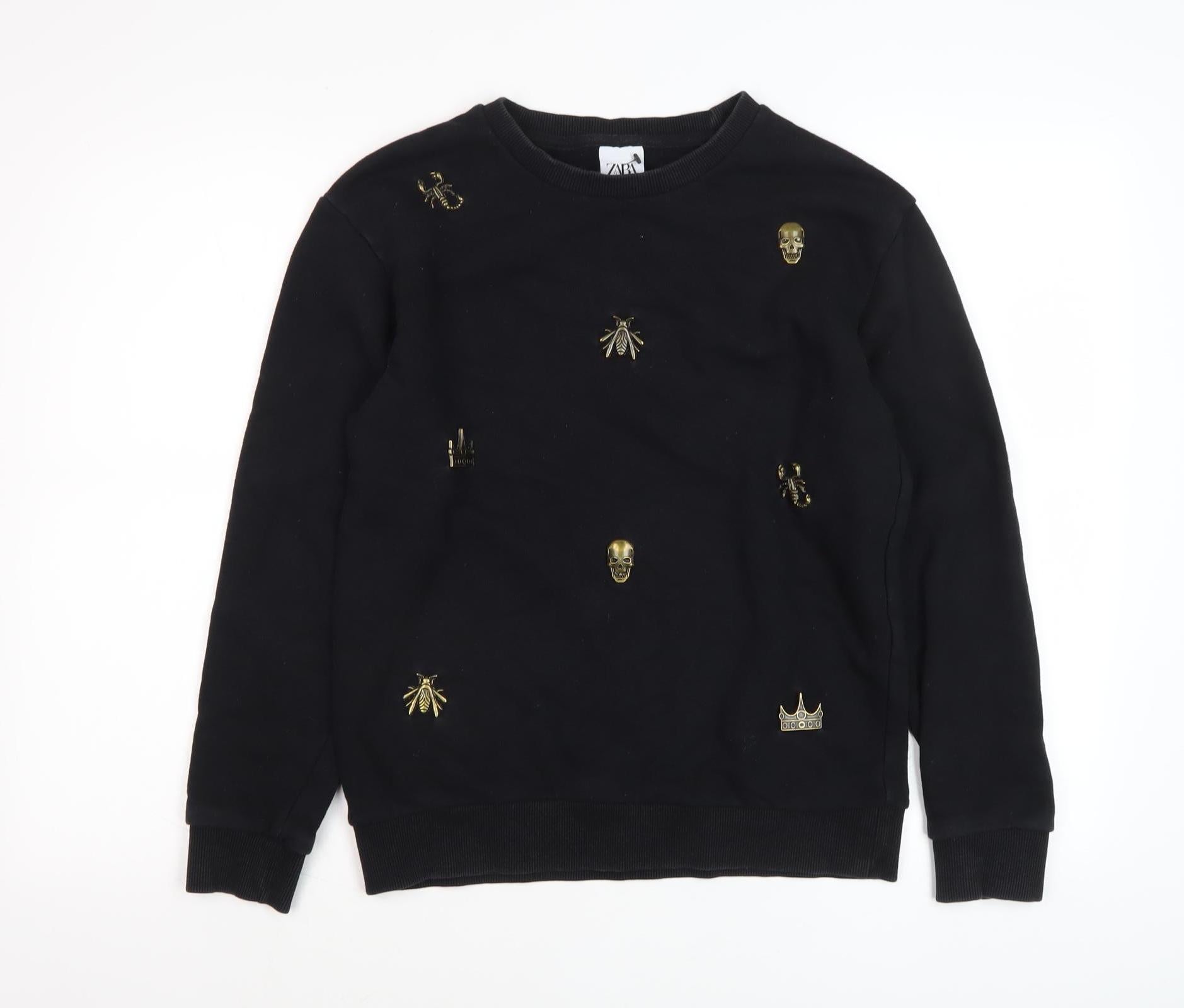 Elevate your casual wardrobe with this chic black sweatshirt from Zara, perfect for those seeking a blend of comfort and style. Designed for women, it features eye-catching embroidered accents depicting various gothic and animal themes, adding a unique touch to your outfit. This pullover style sweatshirt is crafted for a regular fit, ensuring you stay comfortable and stylish throughout autumn and winter. Made from a blend of cotton and polyester, it offers softness and durability. The crew neckline and long sleeves provide a classic look that pairs well with jeans or skirts for a trendy, laid-back ensemble. Whether you're heading out for a casual day or relaxing at home, this sweatshirt is your ideal companion. Don't miss out on adding this versatile piece to your wardrobe!