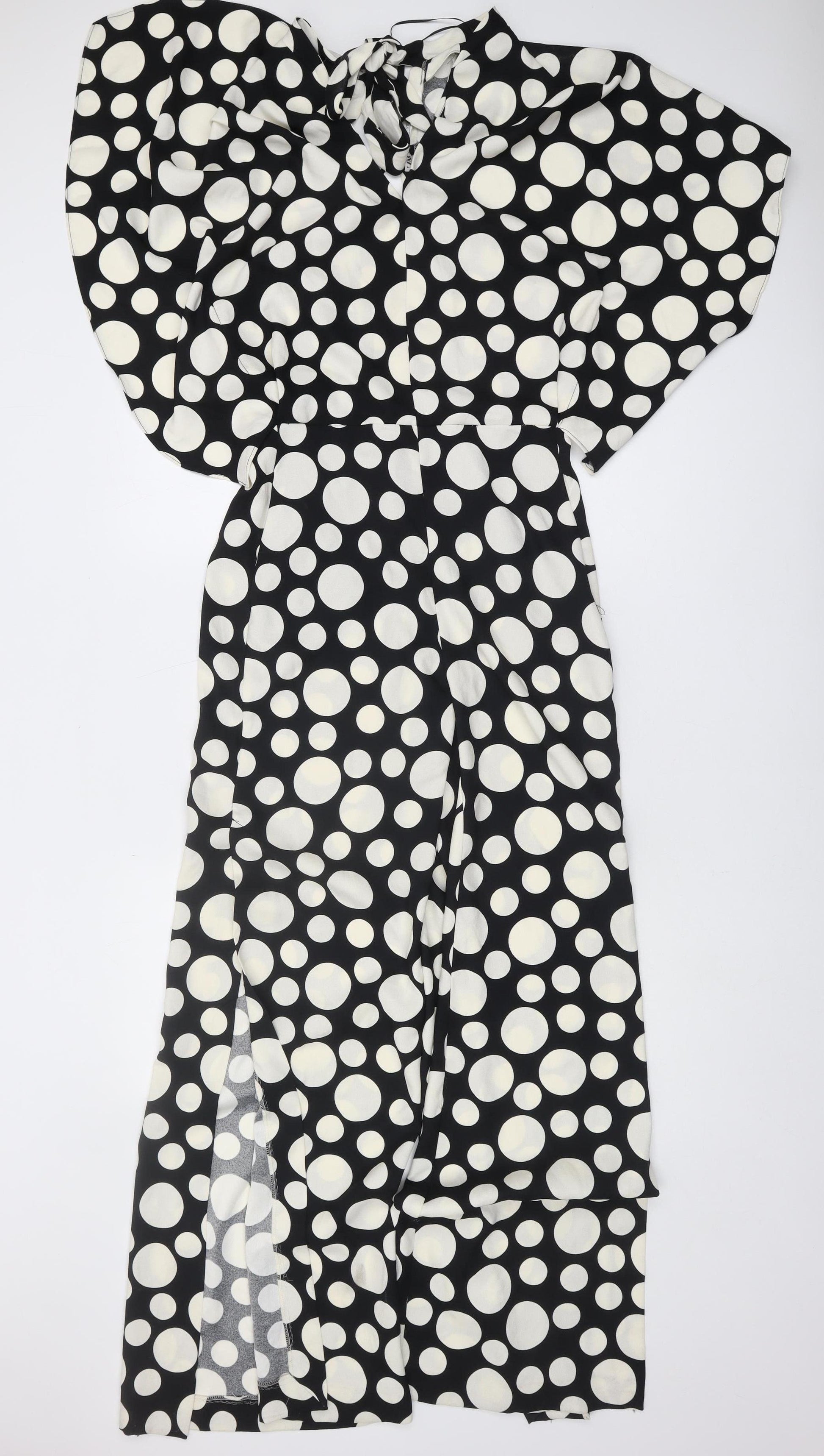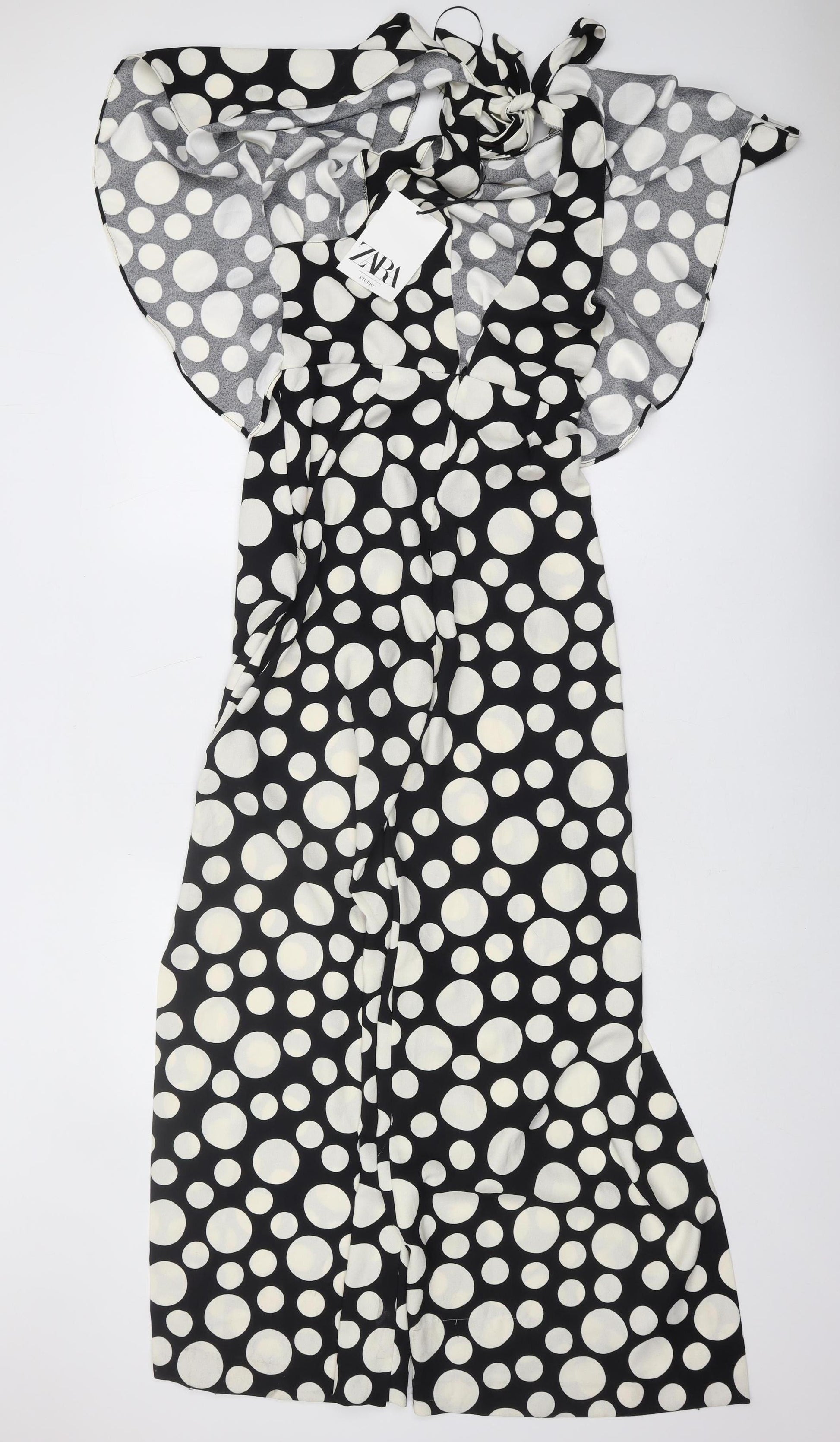 Elevate your wardrobe with this stylish black and white polka dot jumpsuit from Zara, designed for the modern woman. This chic piece is perfect for casual outings and warm summer days. Crafted from 100% soft cotton, it offers comfort and breathability, making it ideal for all-day wear. The regular fit, combined with a flattering V-neckline and wide-leg silhouette, ensures a fashionable and comfortable look. Its short, kimono-style sleeves add a touch of elegance, while the playful polka dot pattern makes a bold fashion statement. Whether you're heading to a casual lunch or a weekend getaway, this jumpsuit is a versatile choice that pairs beautifully with your favourite sandals or sneakers. Machine washable for easy care, keeping you looking effortlessly stylish on any occasion. Don't miss out on adding this must-have piece to your collection!