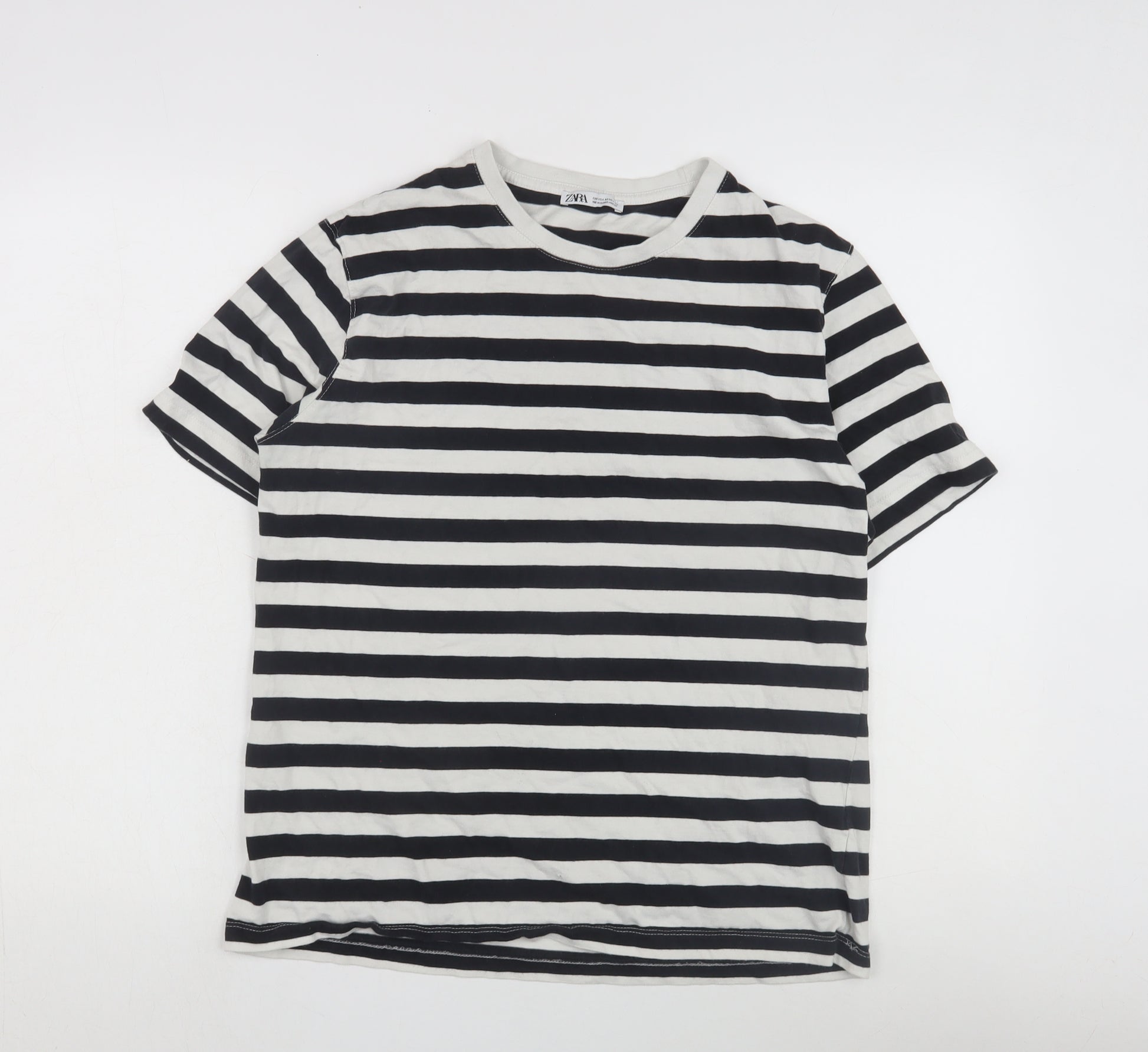 Add a touch of classic style to your wardrobe with this Zara Women's Black Striped T-Shirt, the perfect blend of comfort and fashion. Ideal for all seasons, this basic t-shirt is crafted from 100% cotton, offering a soft and breathable feel that is perfect for everyday wear. The regular fit ensures comfort while maintaining a sleek appearance, and the crew neckline adds a casual yet polished touch. With its stylish black and white striped pattern, this t-shirt can be effortlessly paired with jeans for a relaxed look or dressed up with a skirt and accessories for a more sophisticated ensemble. The short sleeves make it a versatile choice for layering or wearing alone during warmer months, while the classic design seamlessly transitions through seasons. Zara's commitment to quality is evident in this piece, which is machine washable for easy care, making it a practical and stylish addition to your closet. Whether you're stepping out for a casual day out or simply relaxing at home, this striped t-shirt delivers both style and comfort, making it a wardrobe staple.