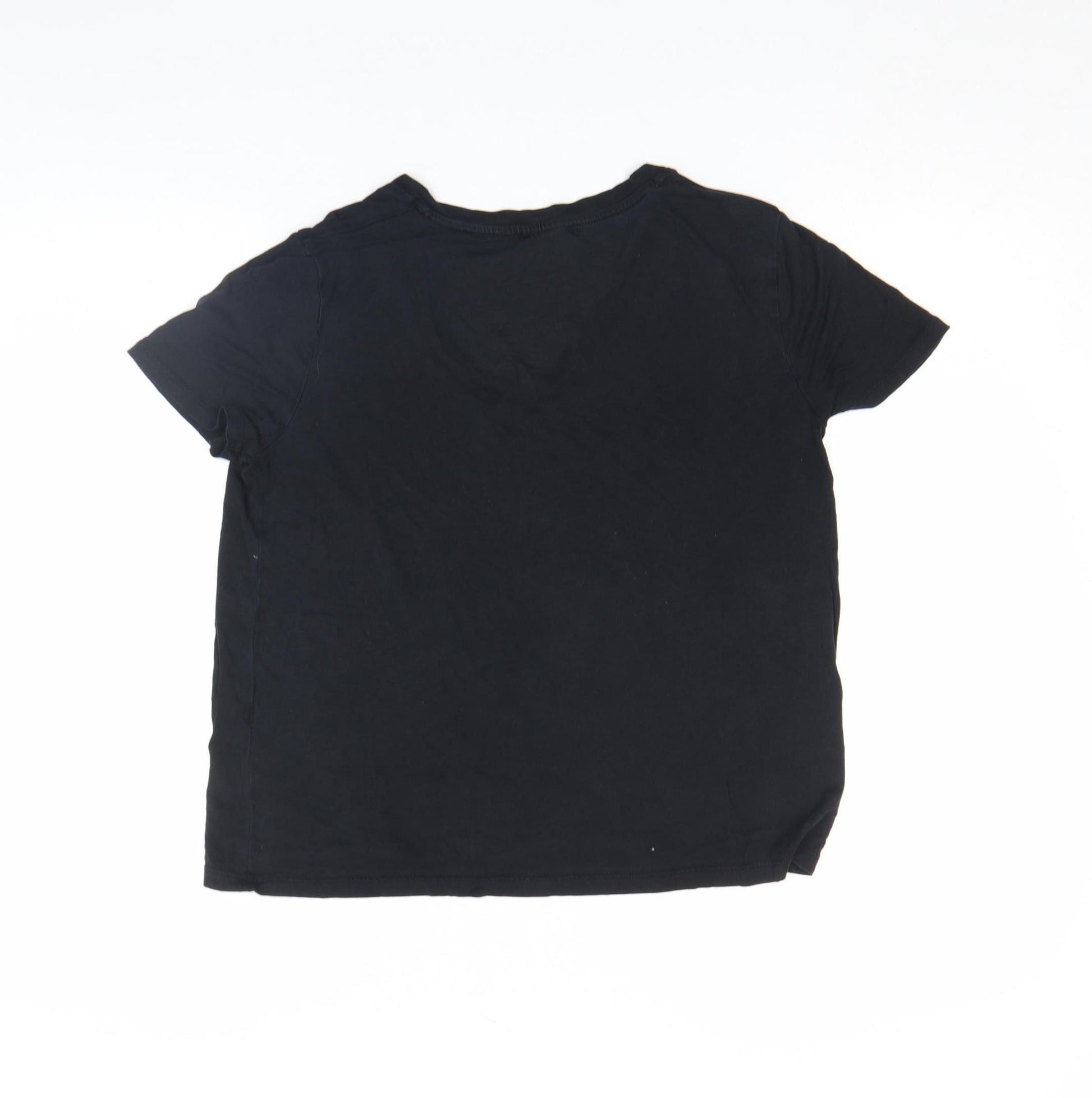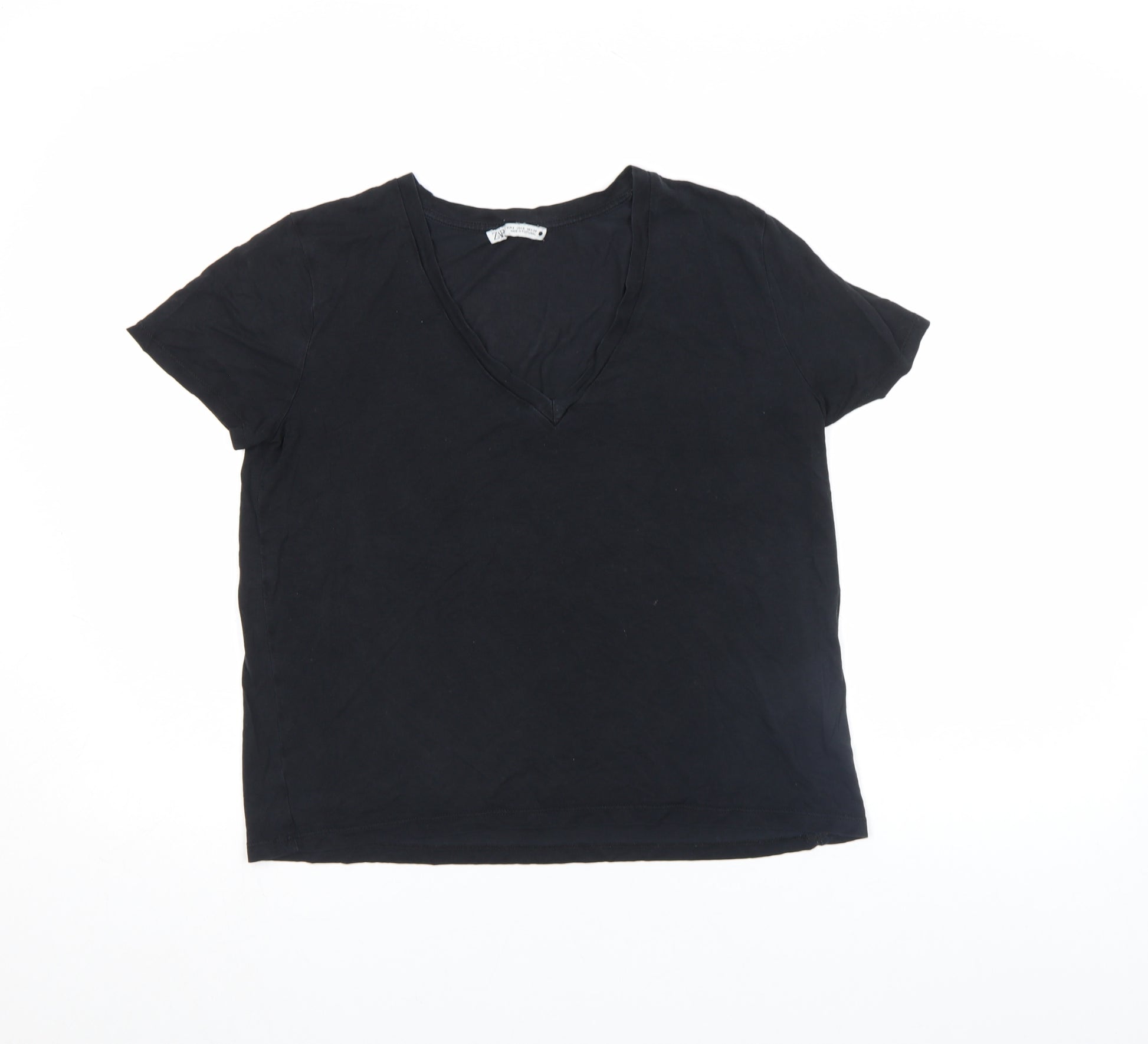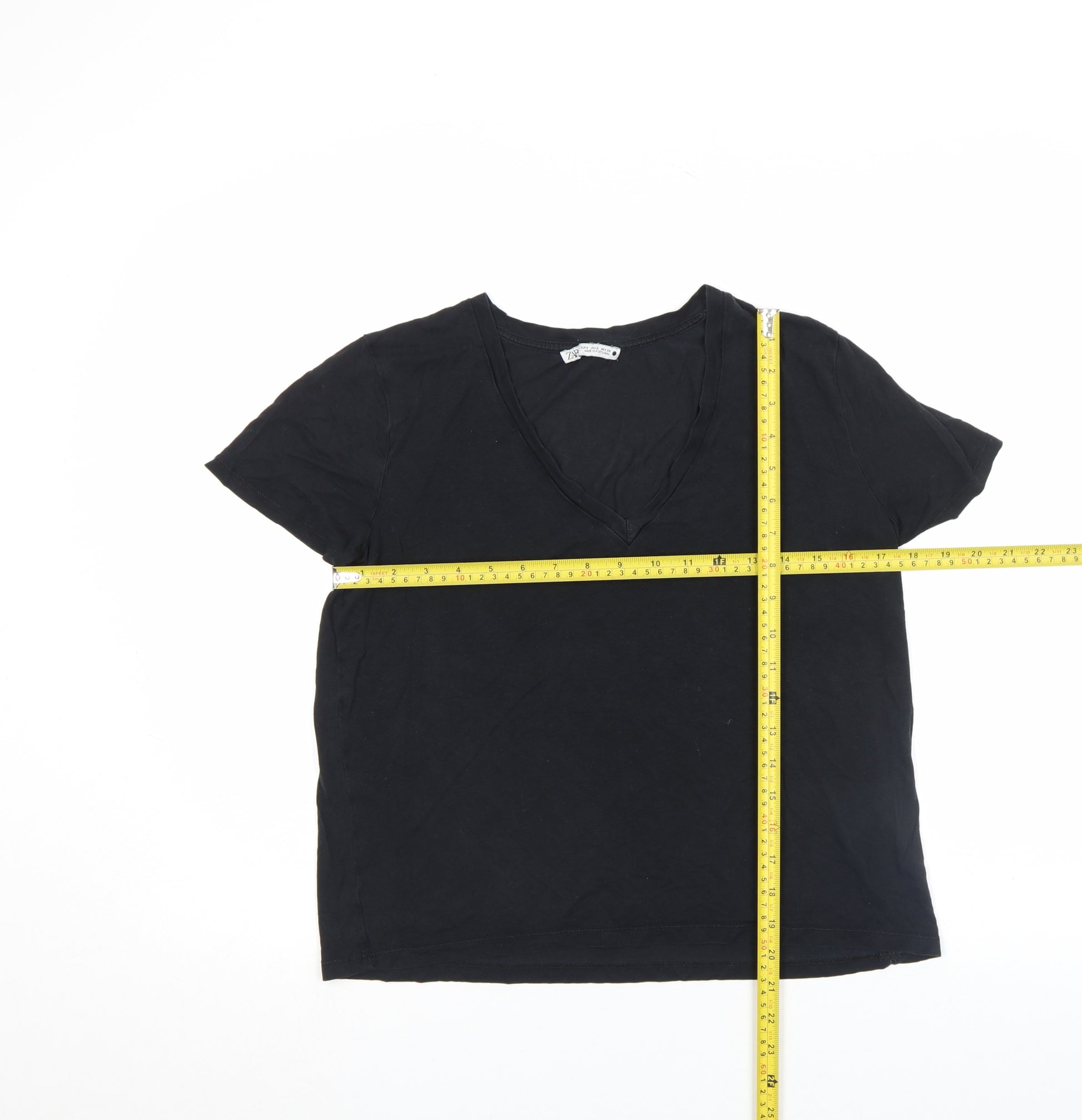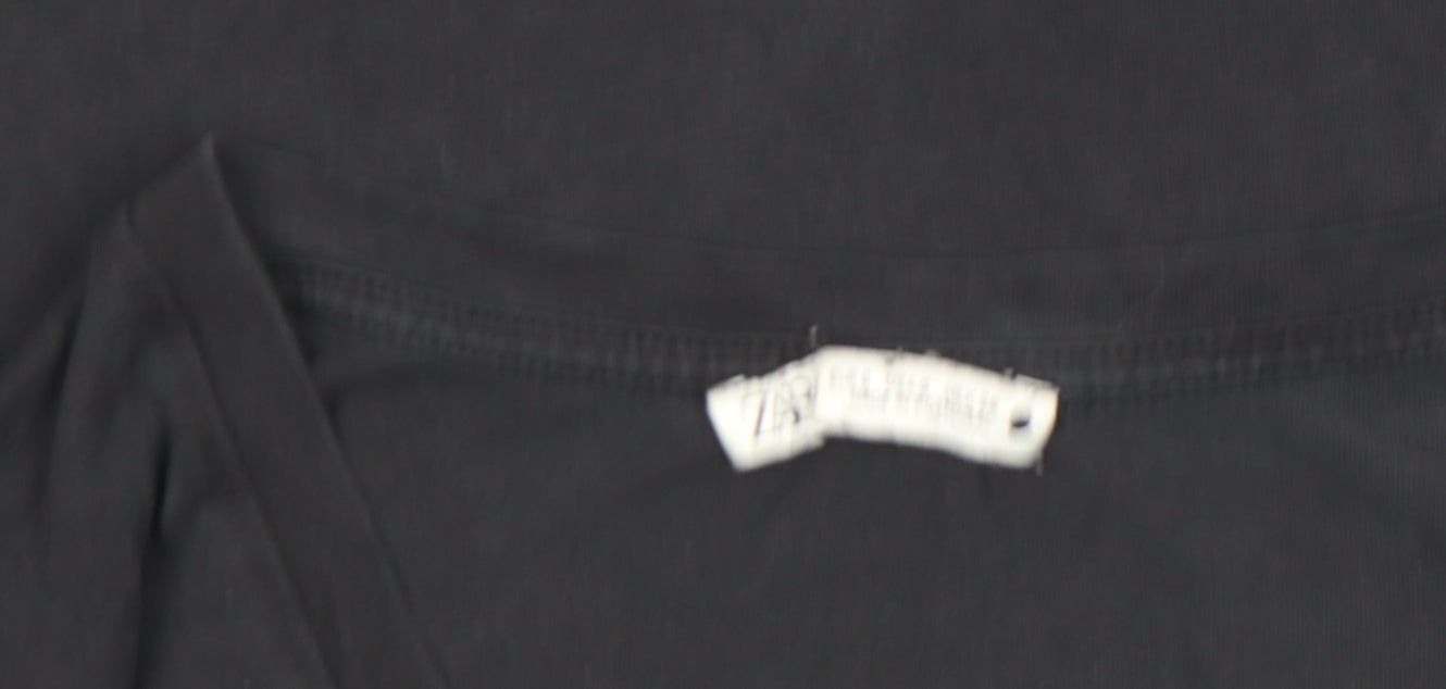 Refresh your everyday wardrobe with this versatile Zara Women’s Black V-Neck T-Shirt, a true essential for effortless style and comfort. Crafted from soft, breathable 100% cotton, this tee provides a lightweight feel that ensures comfort throughout the day. The classic black colour gives it a timeless appeal, pairing seamlessly with jeans, skirts, or tailored trousers for a polished yet relaxed look. Designed in a regular fit, this short sleeve top offers an easy-to-wear silhouette that flatters a variety of body types. The V-neckline adds a subtle feminine touch, making it perfect for layering with necklaces or wearing beneath blazers and denim jackets. Made from jersey fabric, it provides just the right amount of flexibility for movement without losing shape. Ideal for the warmer seasons of spring and summer, this top is breathable and soft against the skin, keeping you comfortable whether worn for a casual day out, a relaxed office outfit, or weekend lounging. The pullover style adds simplicity to getting dressed, while its solid pattern offers a clean, minimalist look suitable for multiple occasions. Combining practicality and easy care, this Zara T-shirt is machine washable, making it a great fuss-free addition to your collection. Although pre-loved, it remains in very good condition with no visible flaws, offering excellent value for money. A must-have piece that captures Zara’s contemporary and effortless fashion aesthetic, this T-shirt will quickly become a go-to favourite. Whether styled with denim shorts and trainers for laid-back summer days or tucked into high-waisted trousers for smart-casual appeal, it is a reliable staple no wardrobe should be without.