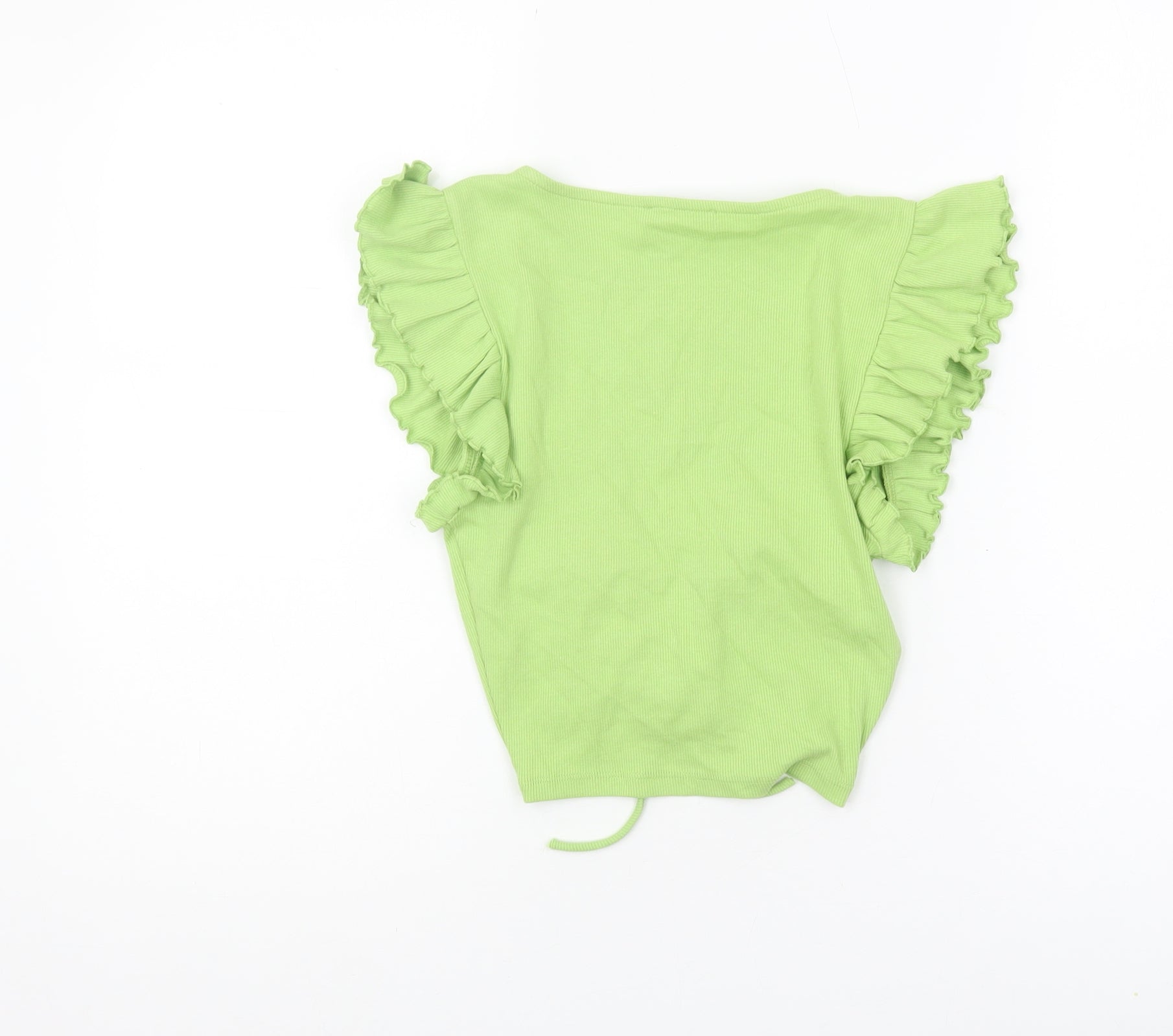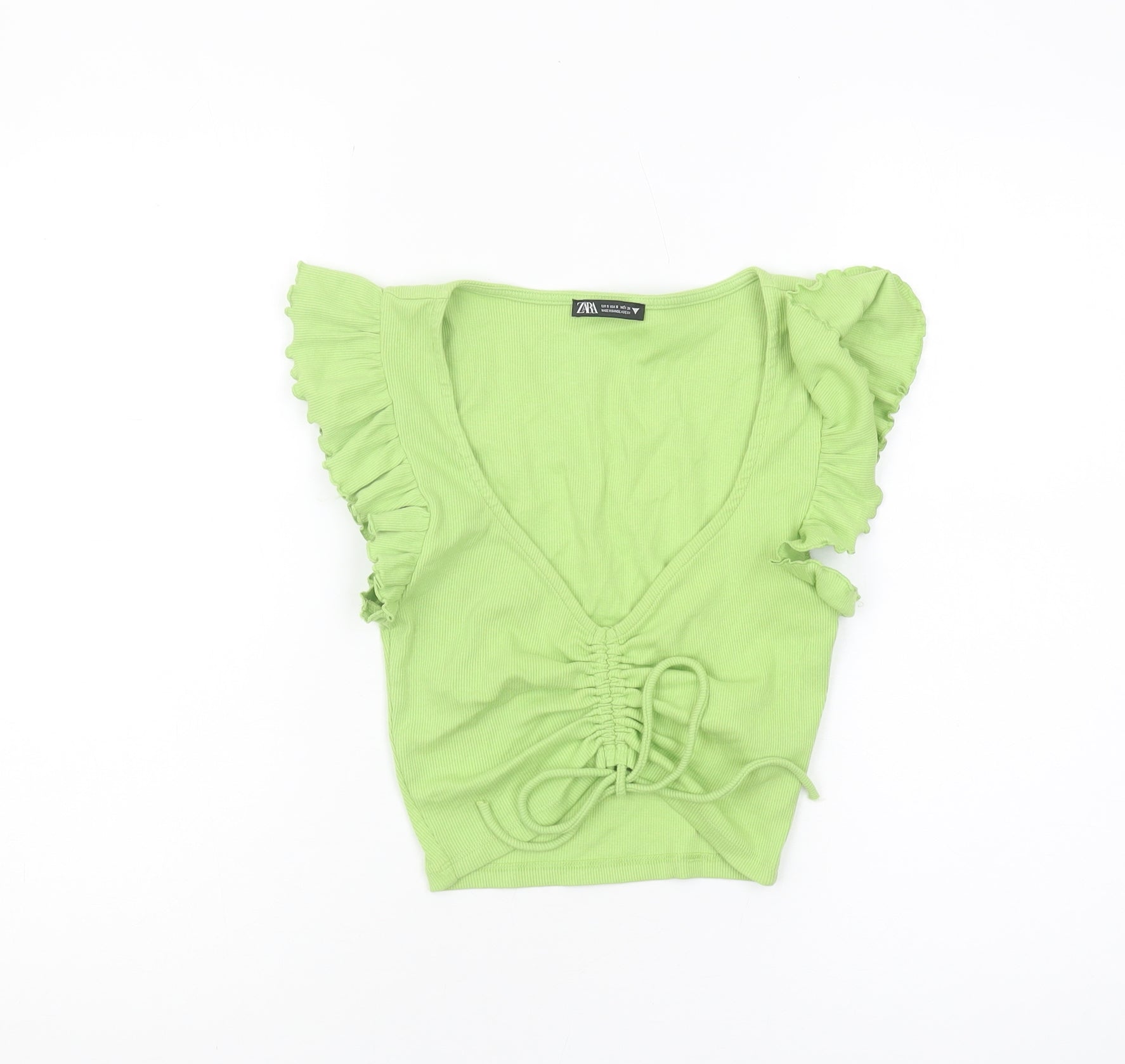 Elevate your summer wardrobe with this chic cropped blouse from Zara. Designed for women who appreciate style and comfort, this top features a stunning green hue that captures the essence of summer. The slim fit and flattering V-neckline accentuate your features, while the ruffle sleeves add a touch of playful elegance. Crafted from a comfortable jersey fabric, it offers a relaxed stretchy fit without compromising on style. This versatile piece is machine washable and easy to care for, making it perfect for casual outings or leisure activities. With its solid pattern and tie closure, this blouse provides a fresh and youthful look. Perfectly paired with high-waisted jeans or a flowy skirt, this top is a must-have for any fashion-forward individual.