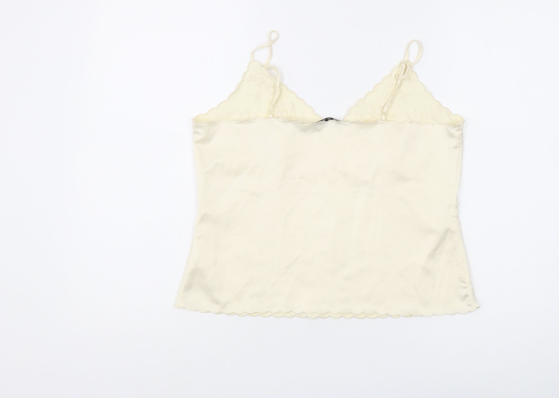 Embrace elegance with this sophisticated Zara Women’s Camisole Blouse in a delicate ivory shade. Perfect for those warm summer days, this sleeveless top features a flattering V-neck and delicate spaghetti straps that offer a feminine silhouette. The satin polyester fabric not only feels luxurious against the skin but also elevates this camisole with its subtle sheen, making it a versatile addition to your wardrobe. Detailed with exquisite embroidery, this blouse adds a touch of texture and style to any outfit. Easy to care for, this machine washable blouse ensures convenience without compromising on style. Ideal for casual outings or even as a chic underlayer, this cami can effortlessly transition from day to night. Its regular fit and solid pattern make it a must-have staple that pairs beautifully with skirts, jeans, or shorts. Don't miss the chance to own this timeless piece that promises both comfort and style.