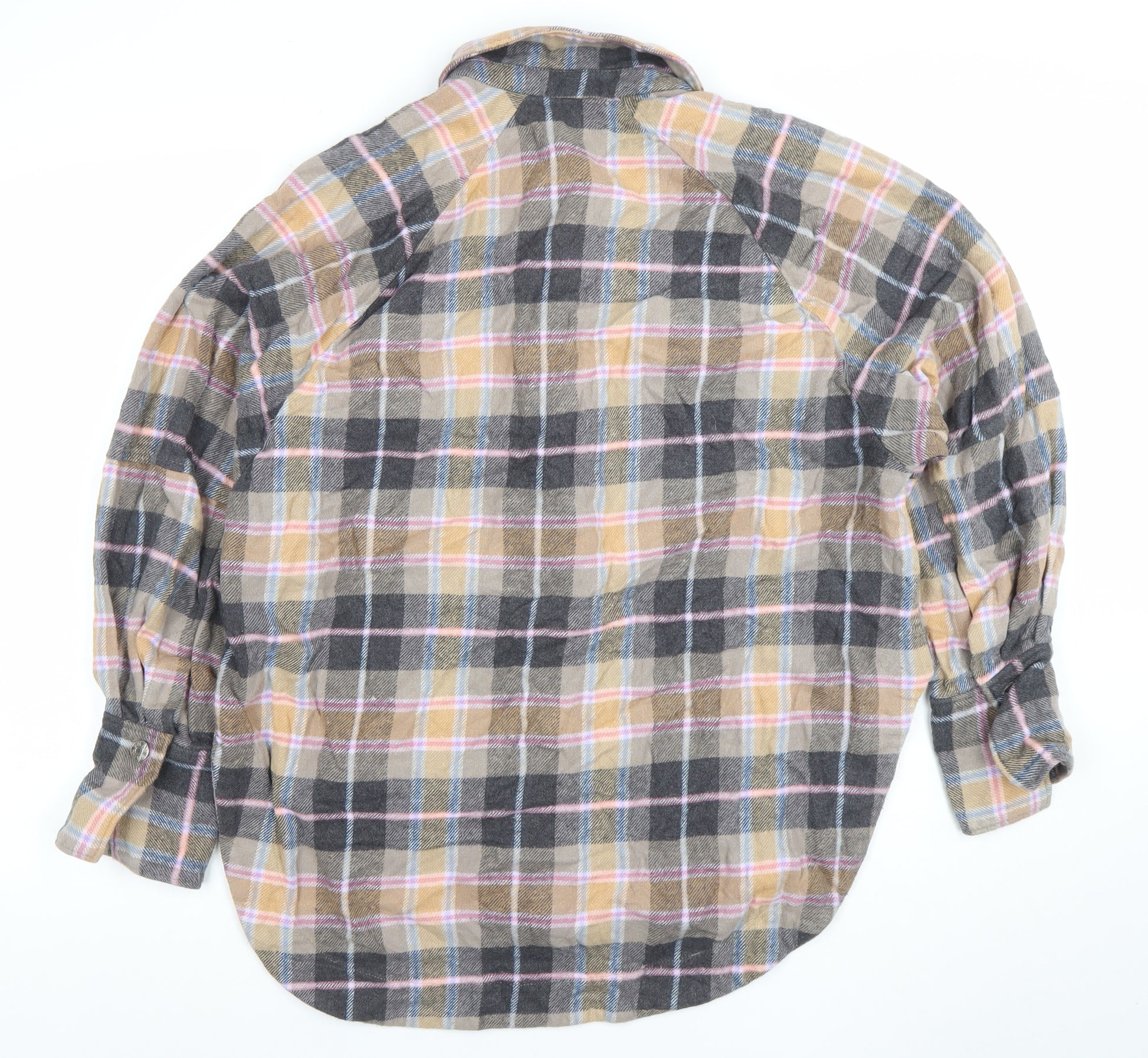 Add effortless style and warmth to your wardrobe with this ZARA Women’s Multicoloured Check Shirt Jacket in size 14. Designed in soft, brushed flannel, this piece perfectly combines the look of a shirt with the cosy comfort of a lightweight jacket. The multicoloured pattern, featuring muted tones of brown, grey, pink, and cream, offers a timeless check design that works well with everything from jeans to skirts. The relaxed fit and curved hemline make it an easy layering piece for cooler days, while the front button closure and collared neckline give it a structured yet laid-back appeal.Crafted from 100% cotton, this flannel overshirt provides breathable warmth, ideal for autumn and winter wear. Thoughtfully designed chest pockets add both style and practicality, perfect for everyday use. Whether you wear it open over a t-shirt or buttoned up for extra warmth, this jacket captures ZARA’s signature modern simplicity with a classic twist. The long sleeves with buttoned cuffs offer a refined finish, and the relaxed silhouette ensures comfortable wear throughout the day.This ZARA jacket is in excellent pre-owned condition with minimal signs of wear and no visible flaws. It retains its vibrant texture and structure, ensuring lasting quality. Perfect for weekend layering, autumn walks, or casual outings, it’s a versatile addition to any wardrobe. Easily styled with denim, boots, or trainers, this piece transitions seamlessly between seasons, making it a go-to favourite. Machine washable and crafted with care in Morocco, this flannel jacket combines practicality, comfort, and understated chic, embodying ZARA’s modern design ethos at an affordable price.