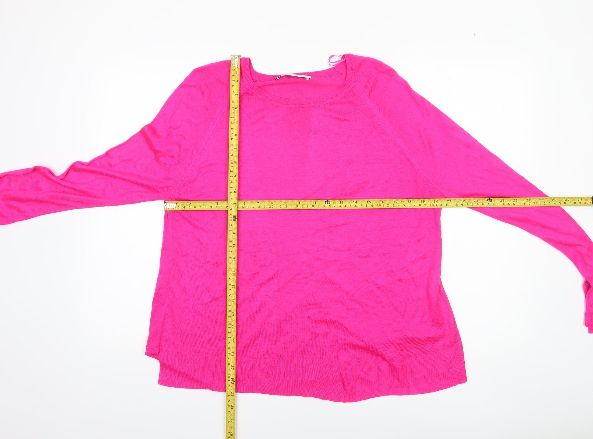 Add a pop of vibrant colour to your wardrobe with this stunning ZARA women’s jumper in a striking pink hue. Designed in a classic pullover style, this piece delivers effortless style and comfort, perfect for everyday wear or casual outings. Crafted from a soft and breathable blend of 50% viscose and 50% acrylic, the knit fabric offers both comfort and lightweight warmth, ideal for layering across multiple seasons. The jumper features a flattering crew neckline and long raglan sleeves that give it a relaxed, easy-to-wear fit suited to most body shapes. Its fine tight-knit texture ensures a smooth finish and contemporary look, while the ribbed hem and cuffs add a subtle touch of structure. Perfect for styling with jeans, tailored trousers, or over a crisp collared shirt, this ZARA pullover is a versatile piece that can be dressed up or down with ease. Machine washable for convenience, it’s ideal for busy lifestyles and transitional weather. Suitable for spring, autumn, or even cooler summer evenings, this bright pink jumper adds bold personality to your collection. The condition is excellent with only slight creasing visible, showing minimal signs of previous wear and still maintaining vibrant colour and shape. Chic yet comfortable, this ZARA crew neck jumper will quickly become a go-to favourite for anyone wanting a statement yet timeless wardrobe essential. Refresh your style with this eye-catching and feminine knit that enhances both casual and polished looks, providing just the right balance of simplicity and charm.