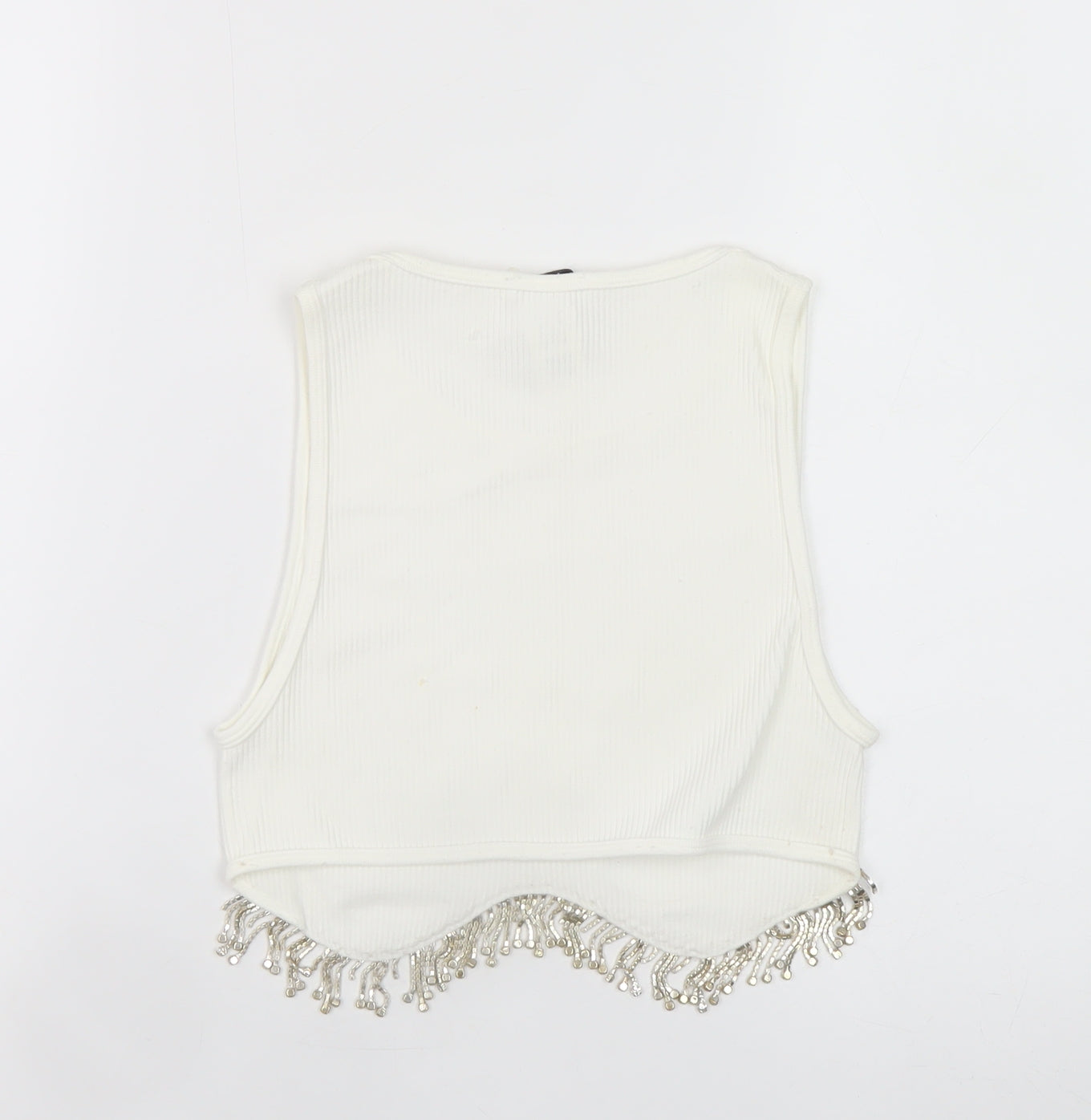 Step into effortless style with this chic Zara Women’s White Beaded Cropped Tank Top, designed to bring a touch of sparkle and sophistication to your summer wardrobe. Crafted from a premium blend of 93% polyamide and 7% elastane, the fabric ensures a soft, lightweight feel with just the right amount of stretch for a flattering, slim fit. The clean white ribbed knit body exudes understated elegance, while the intricate beaded trim along the hemline adds an eye-catching touch of glamour, perfect for daytime outings or evening events. This tank top features a classic crew neckline and wide shoulder straps, giving it a modern, structured silhouette that flatters the figure. Its cropped length makes it perfect for styling with high-waisted skirts, shorts, or jeans—ideal for both casual looks and summer parties. The sleeveless design provides comfort and breathability, while the pullover closure allows effortless wearability and ease of movement. Perfect for party or cocktail occasions, this top’s standout beadwork turns a simple silhouette into a statement piece. Whether paired with denim for a relaxed, trendy vibe or dressed up with tailored trousers and heels for a night out, this top easily transitions from day to night. The fabric blend’s durability maintains shape and comfort, making it a reliable addition to any fashion-conscious wardrobe. In excellent pre-loved condition with no visible defects, this sleeveless tank offers both style and value. Zara’s signature attention to detail and high-street appeal shine through in the clean lines and premium finish of this piece. Ideal for summer outings, social events, or just adding a little sparkle to everyday wear, it’s the versatile top you’ll reach for again and again. A beautifully crafted, timeless piece ready to enhance your seasonal look.