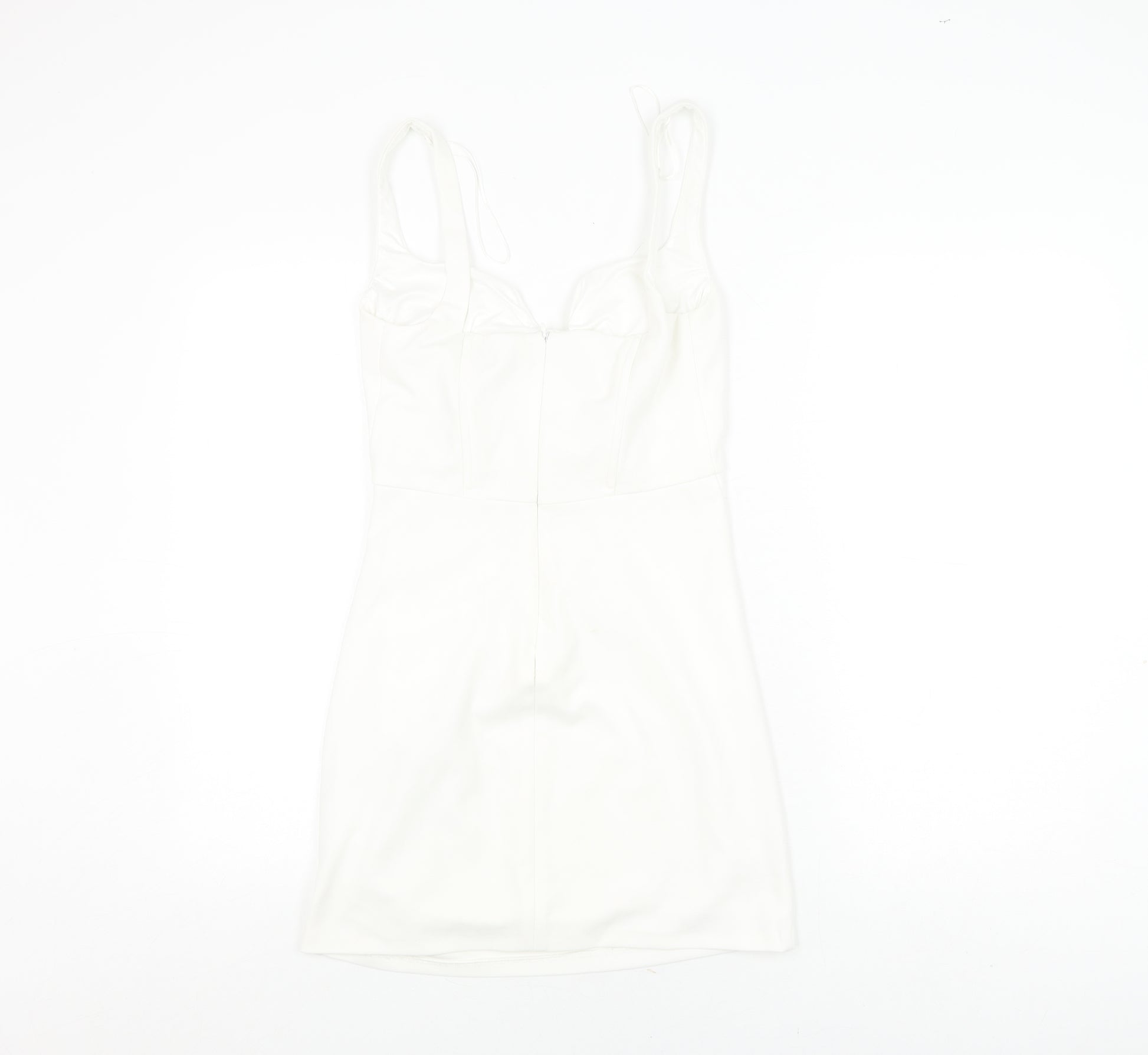 Elevate your wardrobe with this stunning Zara Women's White Bodycon Dress, perfect for party and cocktail occasions. This versatile dress is designed in a flattering short length and features a chic bodycon style that accentuates your curves beautifully. The dress comes in a classic white colour, making it a timeless piece that can be styled for any spring or summer occasion. With a lovely sweetheart neckline and strappy sleeves, it offers a feminine and elegant aesthetic. Crafted from a comfortable woven fabric with a ruched design, this dress ensures a snug yet flexible fit, allowing you to move effortlessly. Its sleeveless design makes it ideal for those warmer months. Featuring a convenient zip closure, it's easy to slip into and style with your favourite accessories. Made from 100% polyester, this Zara dress promises durability and ease of care with its machine washable material. Though excellent in condition, please note a slight stain on the front, which is reflected in the pricing. Whether you're heading to a party or enjoying a summer day out, this Zara dress is sure to be a go-to choice. Embrace elegance and comfort with this must-have addition to your collection.