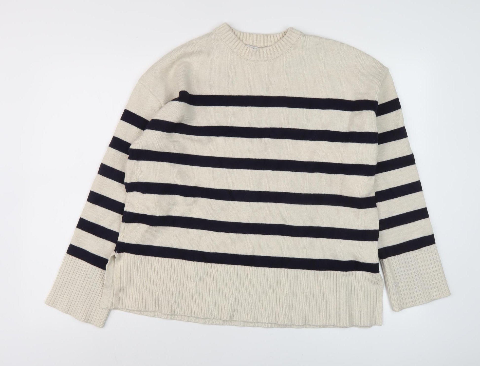 Upgrade your wardrobe with this classic Zara Women's Beige Striped Pullover Jumper. Perfectly blending comfort and style, this pullover is designed for the fashion-conscious woman. Crafted from a premium mix of viscose, nylon, and polyester, it features a soft knit fabric that offers excellent durability and warmth, making it an ideal choice for autumn and winter seasons. The jumper showcases a timeless striped pattern that adds a touch of sophistication to your outfit. The crew neckline and long sleeves ensure maximum comfort, making it suitable for casual outings. Whether you're heading to a coffee catch-up or simply lounging at home, this versatile jumper will be your go-to option. Enjoy easy garment care with its machine-washable material, ensuring it remains in pristine condition after every wash. Available in size Medium, this Zara jumper offers a regular fit that flatters any body shape. Elevate your casual ensemble with this stylish pullover, perfect for layering over shirts or wearing alone. Make a bold fashion statement while staying cosy and warm. Don't miss out on adding this must-have piece to your collection!