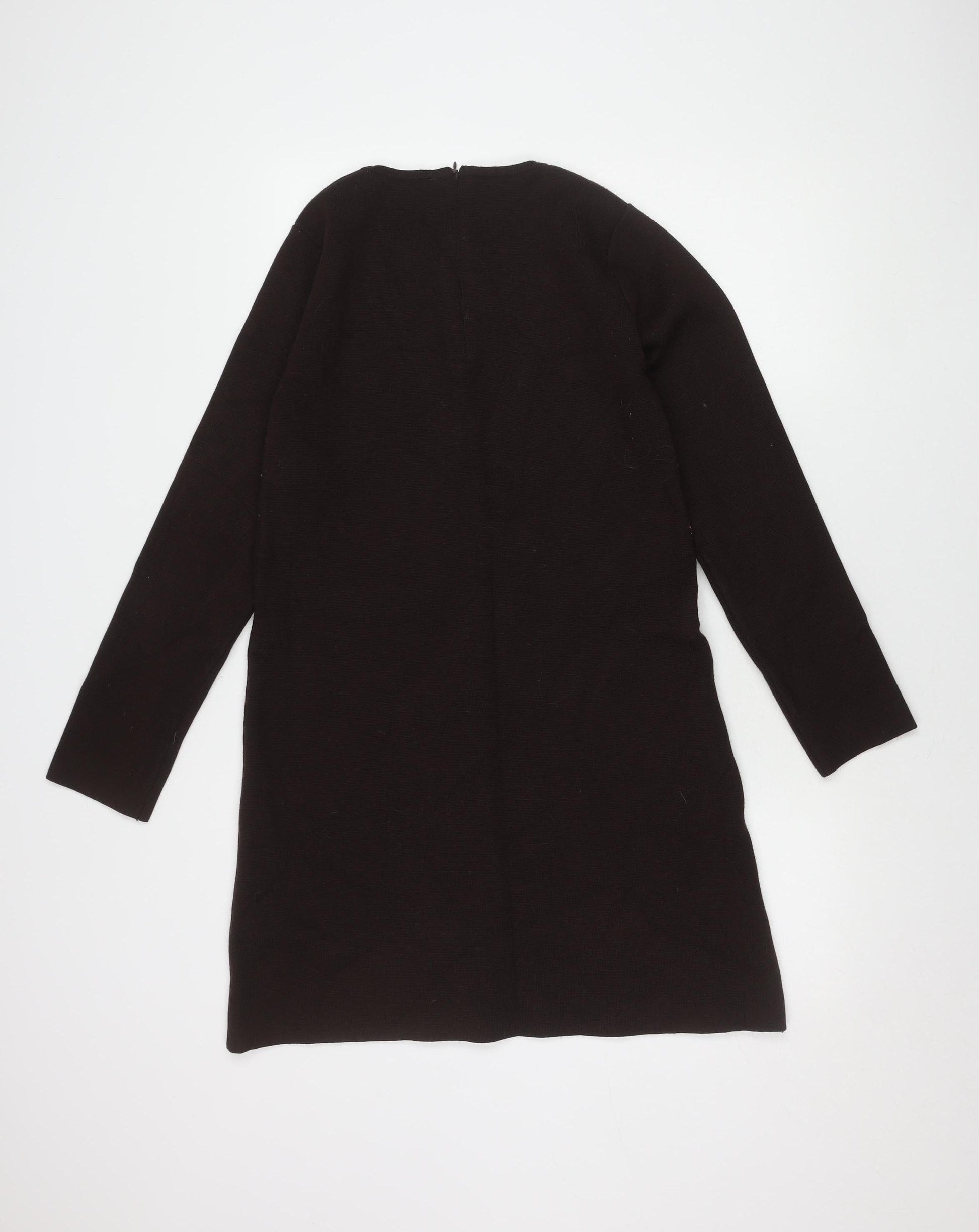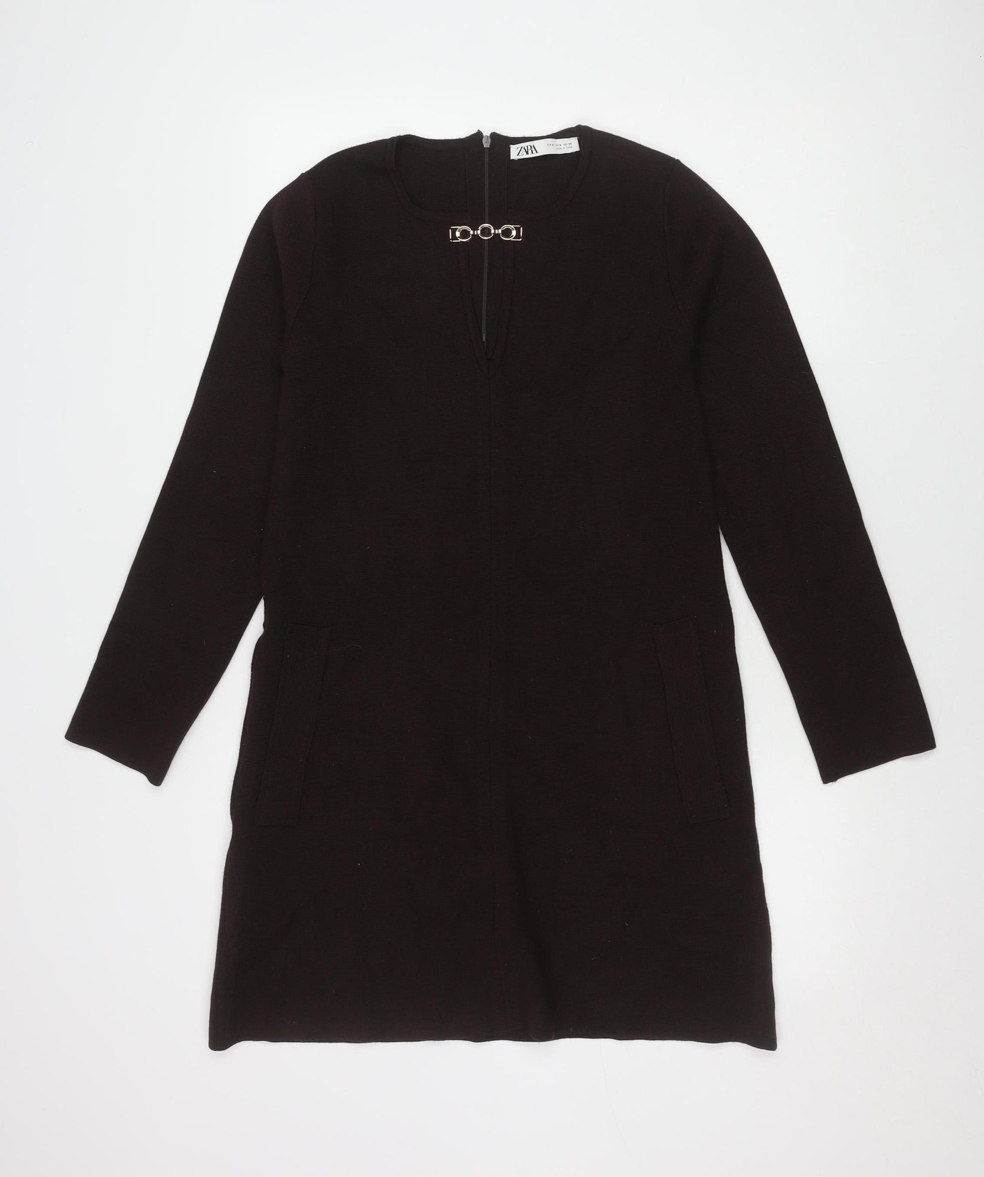 Discover sophistication with this Zara Women's Black Bodycon Dress, size M – perfect for elevating your casual autumn and winter wardrobe. Crafted from a comfortable knit fabric that combines viscose, nylon, and polyester, this dress offers a snug yet flexible fit ideal for day-long comfort. The sleek black hue ensures versatility while the long sleeves and high neckline provide a touch of elegance. Accentuated with a stylish buckle closure, this bodycon dress offers a subtle yet chic detail, adding depth to your outfit without overwhelming your look. With its regular size fit, this dress contours perfectly to your silhouette, providing a flattering and figure-enhancing wear. Suited for casual outings, this classic black dress needs minimal styling effort – pair it with your favourite boots or heels and a statement accessory to complete your ensemble. This Zara dress ensures quality with its excellent condition, noted only by slight lint which can be easily removed. Ideal for fashion-conscious women who appreciate comfort and style, this piece is an indispensable staple for your everyday wardrobe, offering a perfect mix of fashion and functionality. Grab this must-have Zara Bodycon Dress for an unbeatable price of £15.75 and make it your go-to choice this season.