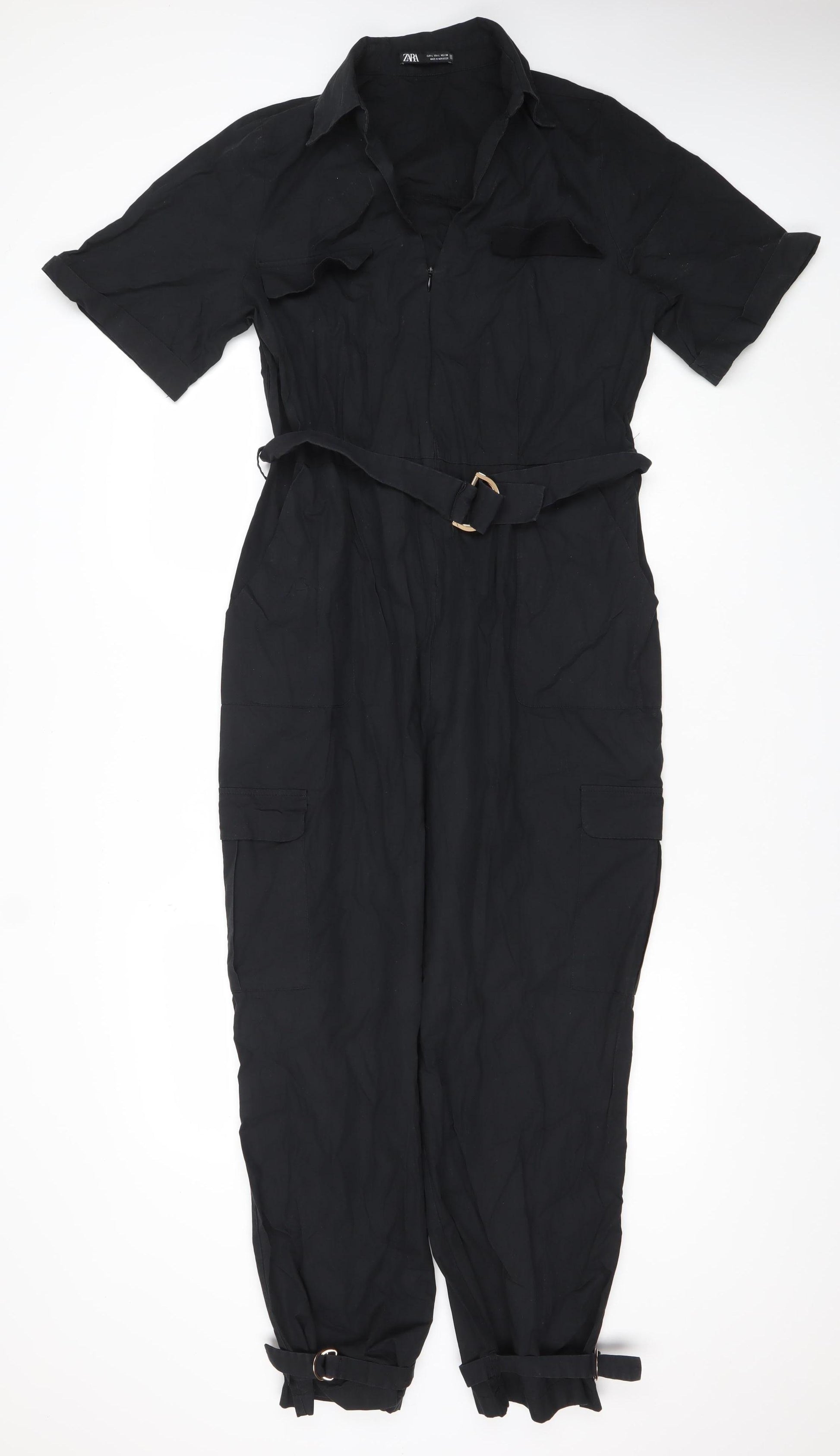 This stylish black women's jumpsuit from Zara combines sleek tailoring with casual comfort, making it a perfect wardrobe staple for any season. Crafted from 100% woven polyester fabric, it offers a lightweight and breathable feel, ideal for both daytime wear and evening outings. The design features a collared neckline and short sleeves, finished with a smart straight leg silhouette that enhances the streamlined look. A matching belt with a subtle buckle detail cinches the waist, adding shape and sophistication to the overall style. Functional side pockets lend a practical edge, while the front zip fastening ensures ease of wear. The jumpsuit's minimalist design makes it exceptionally versatile – pair it with trainers for a casual day out, or elevate it with heels and statement jewellery for an evening event. Perfect for spring, summer, and autumn styling alike, this Zara piece transitions effortlessly from casual to dressy depending on your accessories. The black colourway provides timeless appeal, allowing for endless mix-and-match possibilities within your wardrobe. Although pre-owned, this jumpsuit remains in excellent condition with no visible damage, featuring only light creasing from storage which will easily smooth out with gentle care. Machine washable for easy maintenance, it offers a great combination of practicality and chic design. Whether for relaxed daytime wear, smart-casual office attire, or a sophisticated night look, this Zara collared belted jumpsuit is a modern essential you'll reach for again and again.