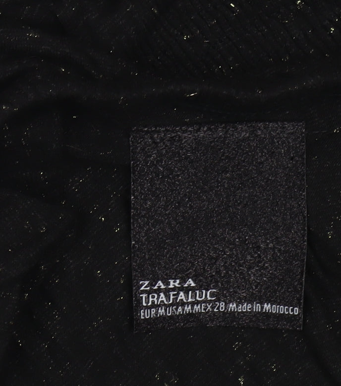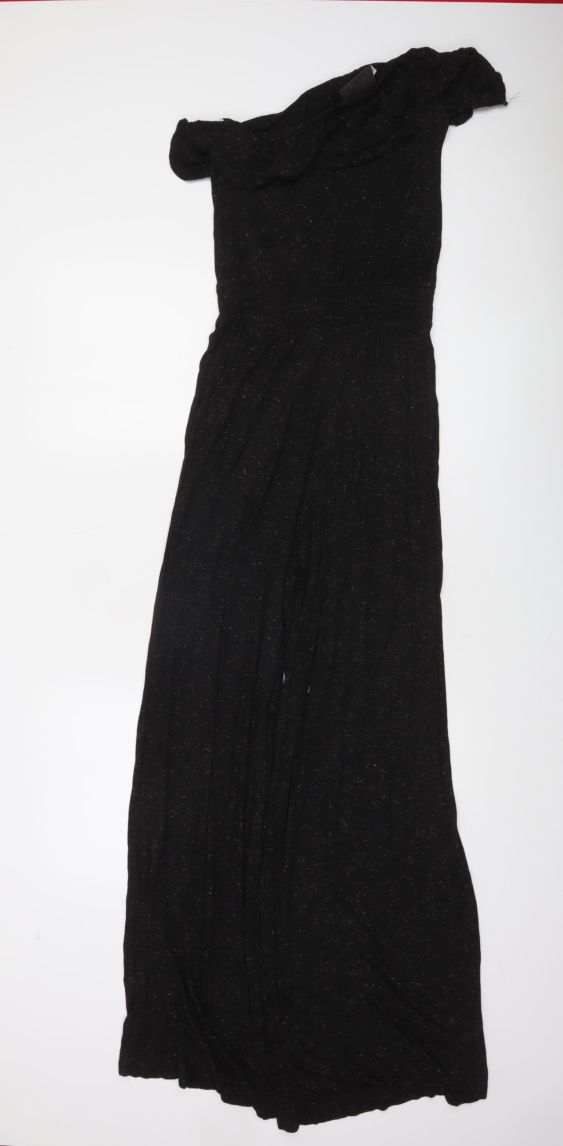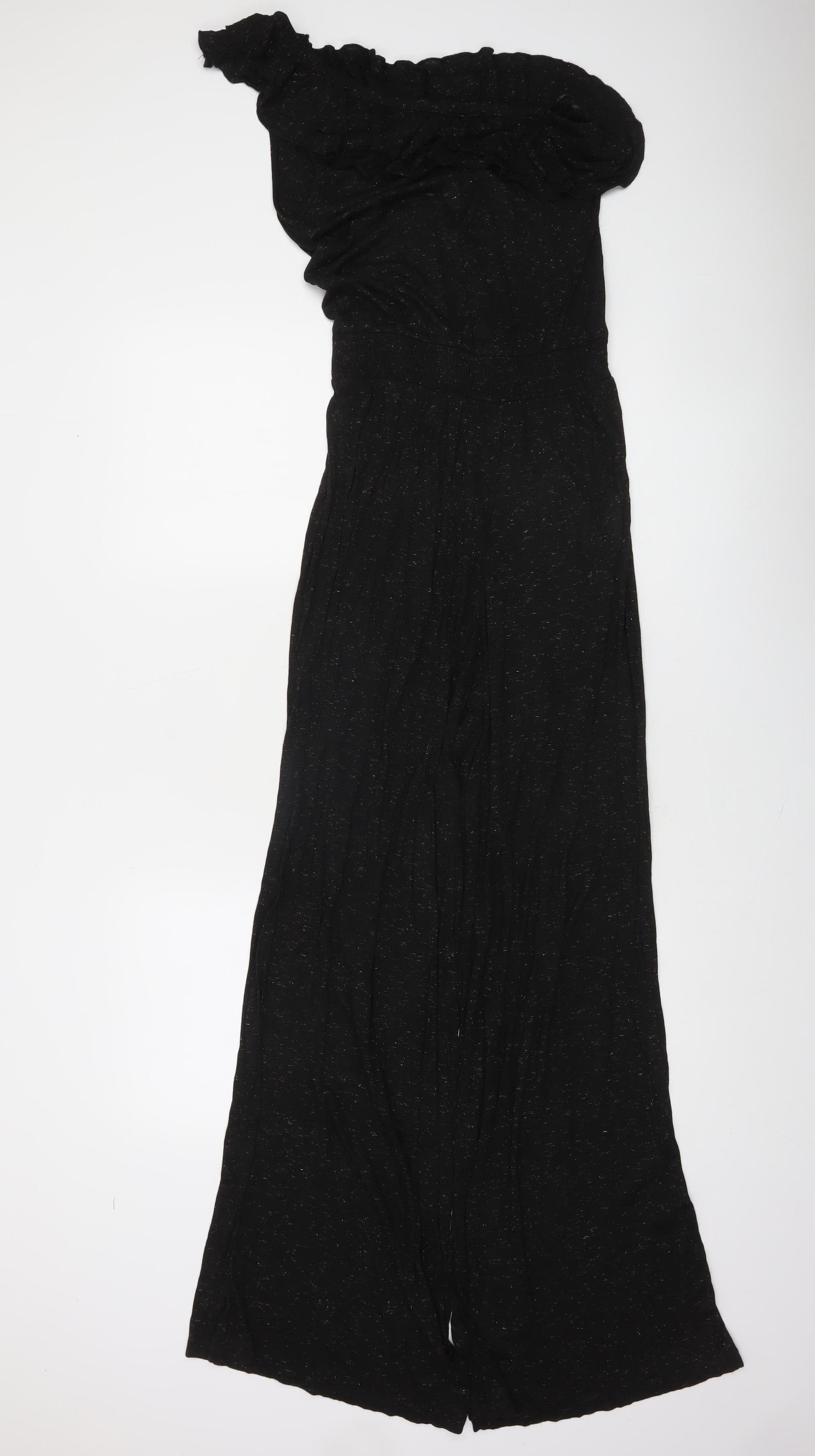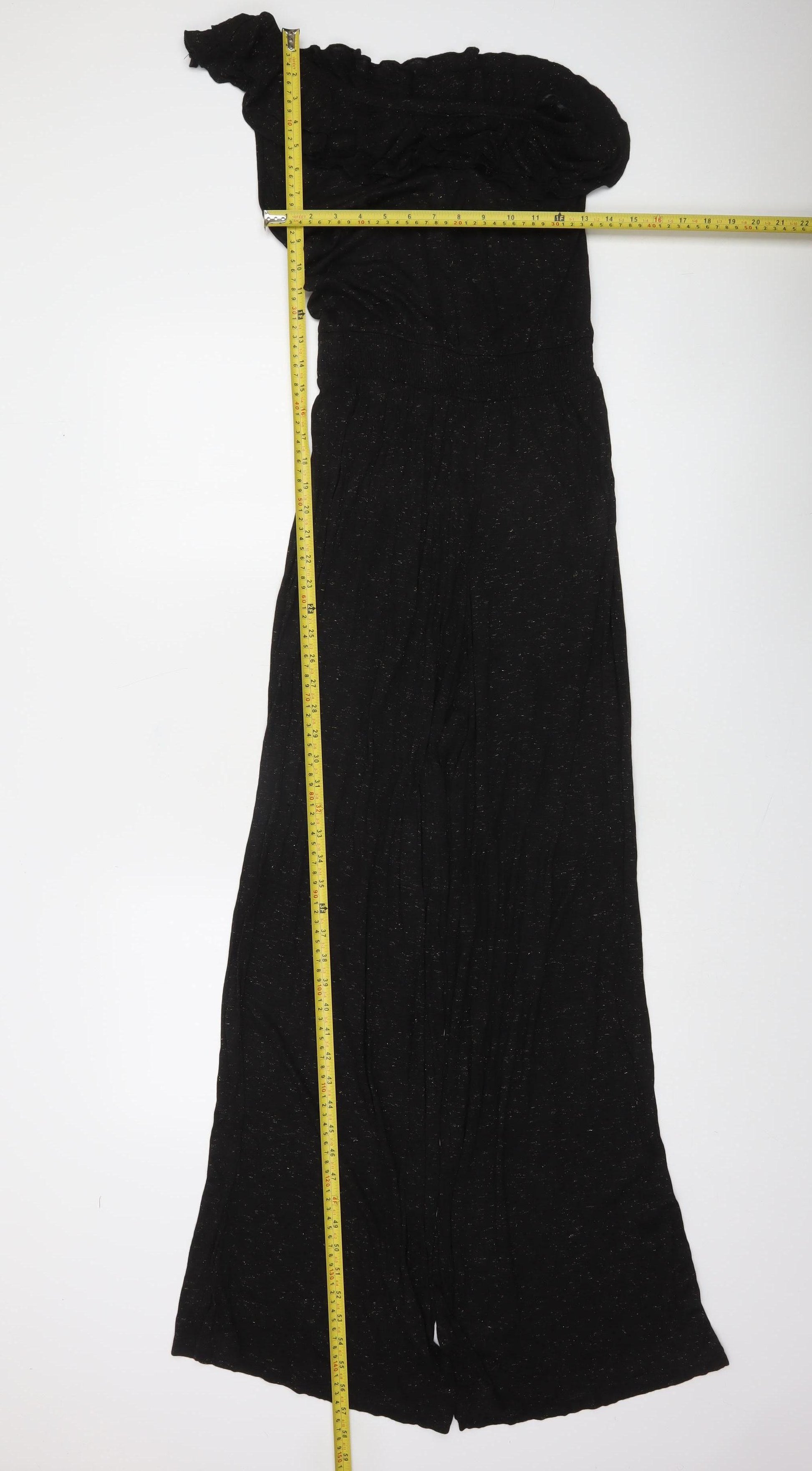 Step out in style with this elegant Zara Women's Black One Shoulder Jumpsuit, perfect for summer parties, evening events, or special occasions. Crafted from a soft jersey fabric blend of polyester and elastane, this chic piece offers a comfortable stretch fit that flatters the figure while maintaining its structure. The standout detail is the feminine one-shoulder neckline enhanced with a delicate ruffle accent, giving the outfit a refined yet effortless appeal.Designed with a wide-leg silhouette, the jumpsuit drapes beautifully, creating a balanced shape suitable for both heels and flats. The elasticated waist provides added comfort and ensures a defined fit that enhances your natural shape. The lightweight construction makes it an ideal option for warm-weather events or layered looks during transitional seasons.Rendered in classic black with a subtle shimmer throughout the fabric, it offers a modern minimalist aesthetic that can easily be dressed up with bold accessories or kept simple for understated elegance. The pull-on style ensures a seamless look and easy wear, with no bulky zips or buttons to disrupt the sleek profile.This Zara piece from the Trafaluc collection brings together comfort, style, and sophistication, appealing to women who appreciate versatile fashion. Whether worn for a night out, a cocktail party, or a holiday evening, this jumpsuit guarantees instant polish and timeless appeal. Pair it with statement jewellery, a clutch, and your favourite heels to complete a glamorous evening ensemble.Pre-loved but in excellent condition, it shows minimal signs of wear and has been well cared for. A wardrobe essential for those who love stylish, easy-to-wear designs that make an impact without trying too hard. Perfect for those seeking a wardrobe refresh with a fashionable and flattering silhouette.