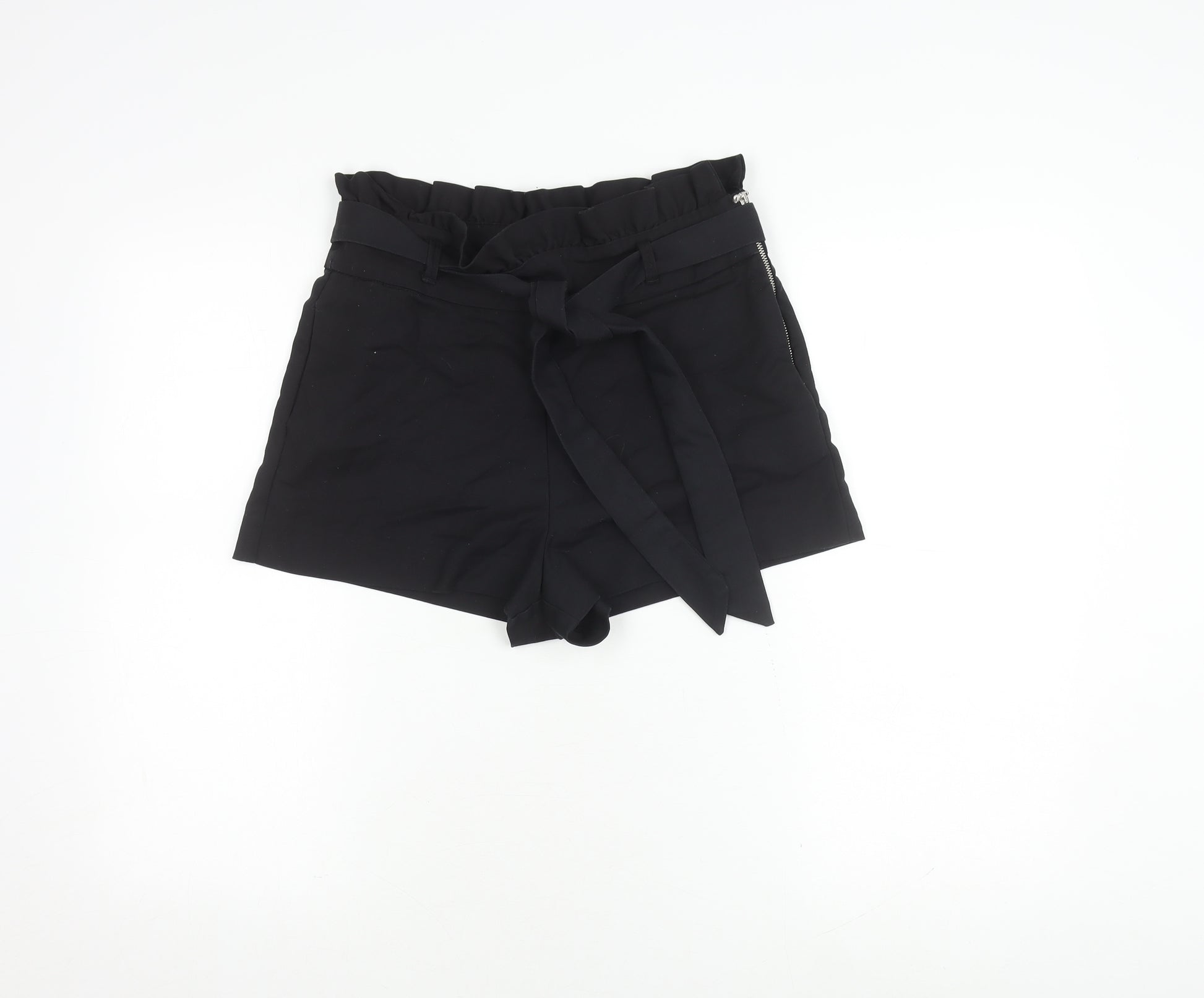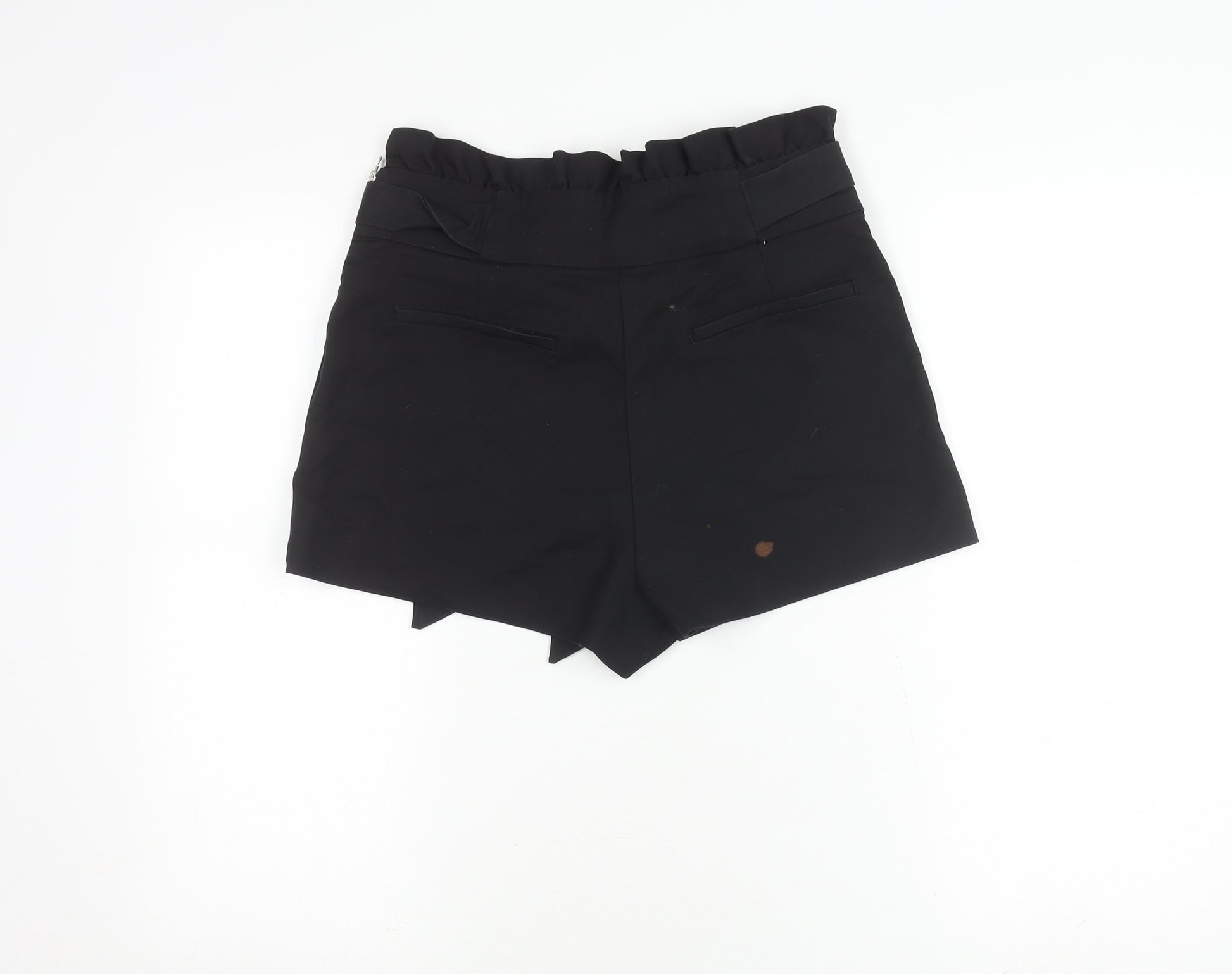 These Zara women's black paperbag shorts offer a stylish and versatile addition to any wardrobe. Crafted from a blend of 65% polyester and 35% cotton, these shorts provide comfort and durability for everyday wear. The chic paperbag style is complemented by a belted waist, adding a fashionable touch that flatters the silhouette. Perfect for casual occasions, these shorts can easily be paired with a variety of tops to create numerous outfits. Despite being gently used, the shorts remain in good condition, with a small stain that does not detract from their overall appeal. Ideal for warm weather, their black colour ensures effortless matching with any ensemble. Whether you're running errands or enjoying a day out, these shorts will serve as a go-to piece in your casualwear collection. Priced affordably, they present an excellent choice for budget-conscious fashion enthusiasts.