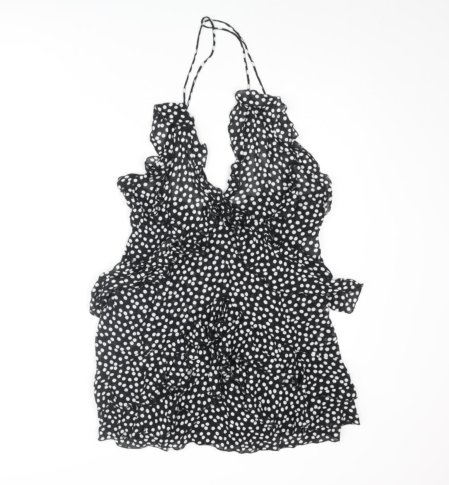 Womens Black Polka Dot Polyester Mini Size S V-Neck Pullover - Frill