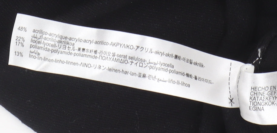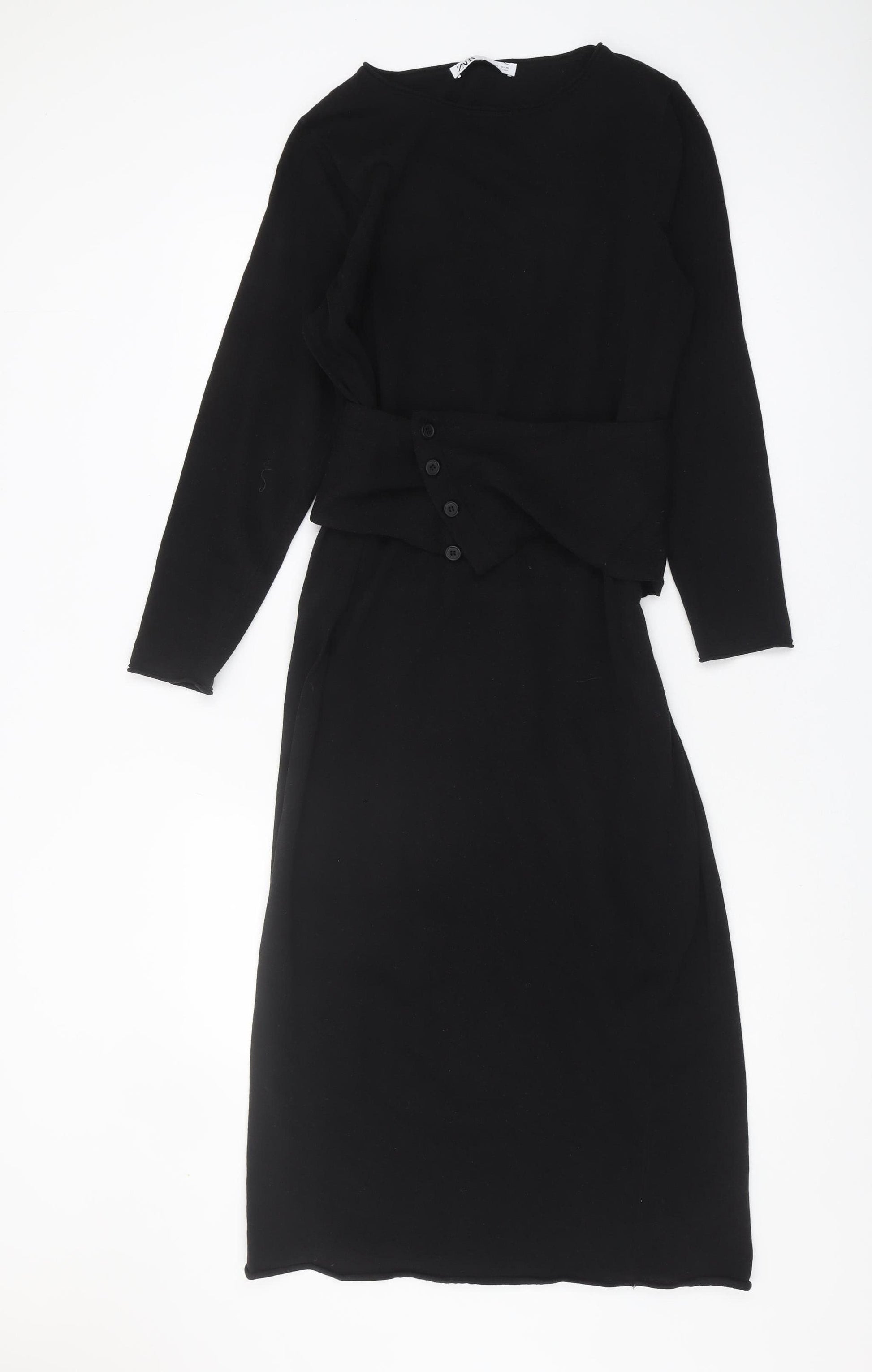 Step into elegance with this classic black sheath dress from Zara, perfect for both casual and workwear occasions. Crafted from a blend of acrylic, lyocell, polyamide, and linen, this midi-length dress features a sleek boat neck and long sleeves, providing comfort and style during the cooler months. The button accents and belted feature add a touch of sophistication, while the knit fabric ensures a flattering fit. Ideal for autumn and winter, this dress will seamlessly transition from office wear to an evening out. Despite slight wear, the condition remains excellent, making it a worthy addition to any wardrobe. Embrace timeless style with this versatile piece.