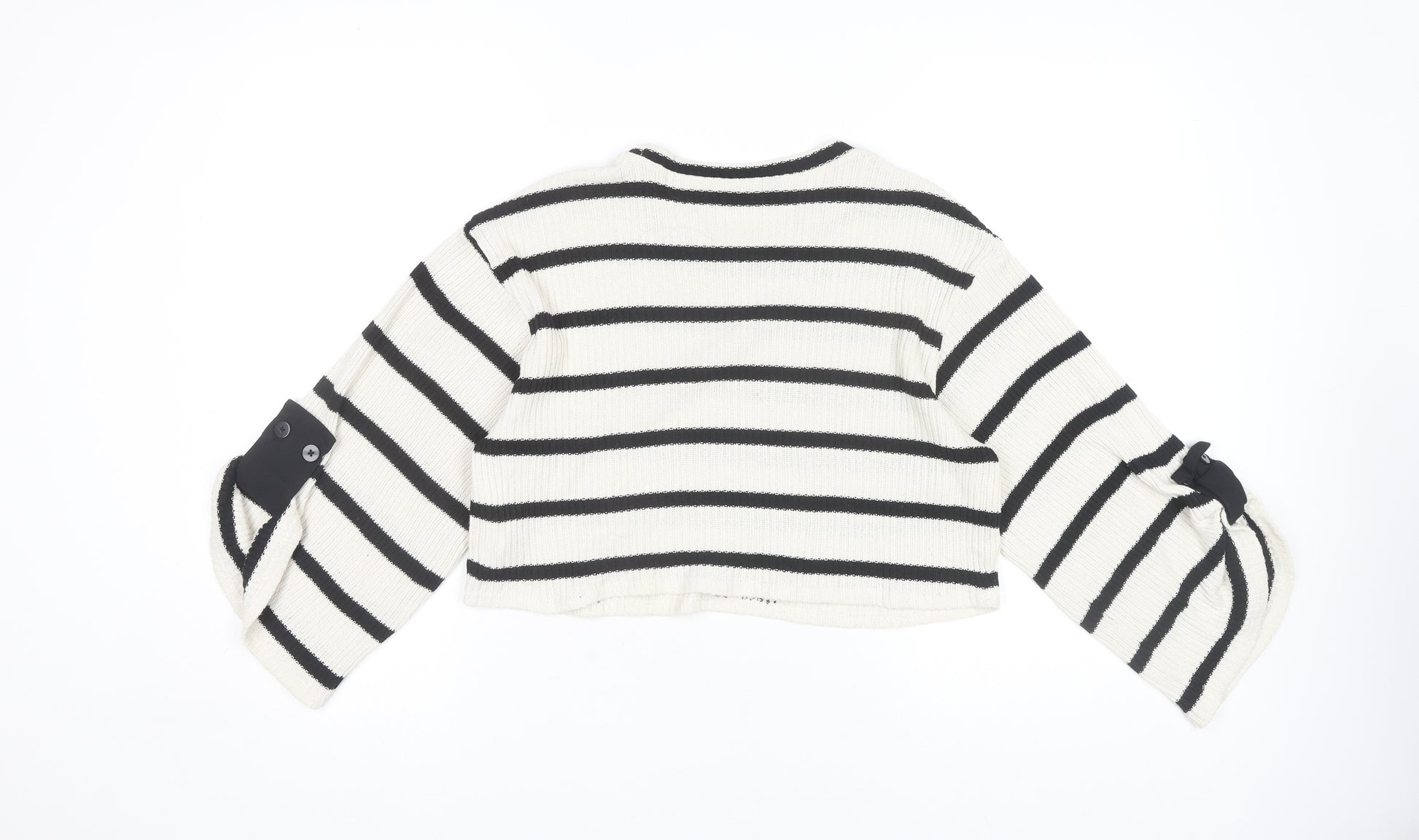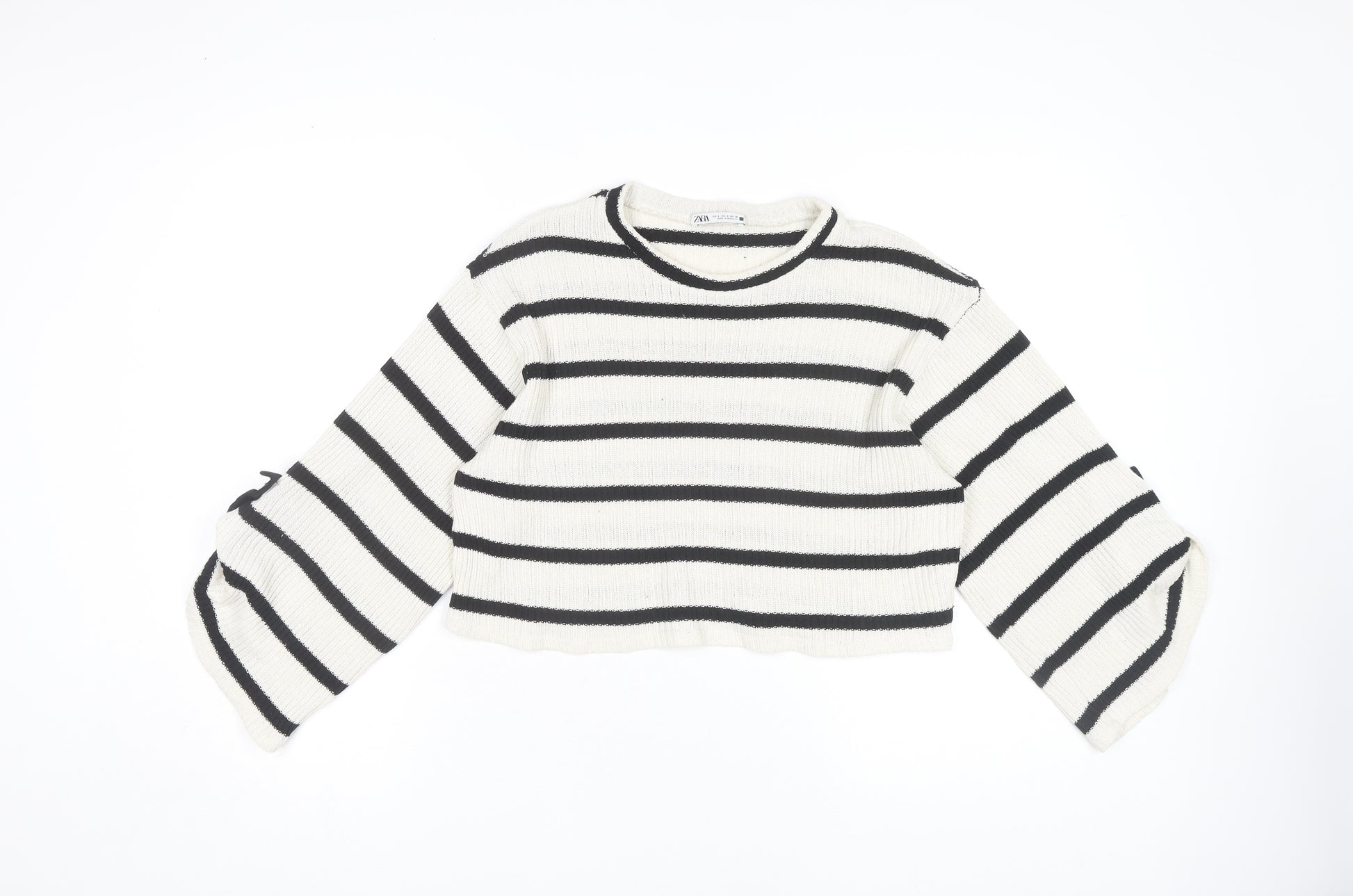 Explore style and comfort with this Zara Women's Black Striped Pullover Jumper. Perfectly designed for the modern woman, this jumper combines a classic crew neck with eye-catching black stripes on a soft knit fabric, offering a relaxed fit. The long balloon sleeves add an element of flair, making it ideal for casual outings during the spring and autumn seasons. Lightweight and machine washable, it's both easy to wear and care for. Accented with button details, this casual piece ensures you stay effortlessly chic. Pair it with your favourite jeans or skirts for a versatile look that's always in fashion. Whether you're heading out for a day with friends or simply enjoying a quiet afternoon, this jumper fits the occasion, making it a staple in any wardrobe. Get yours today for just £15.75 and enjoy the perfect blend of style and comfort.