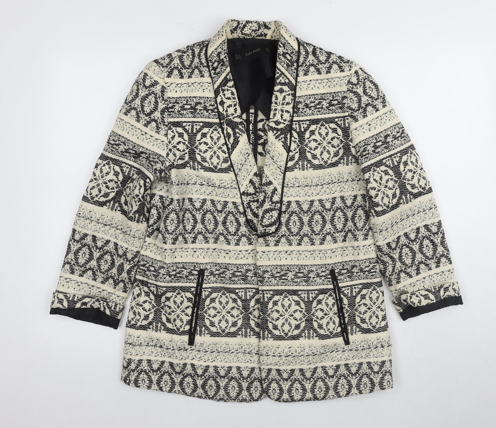 Embrace elegance with this Zara Women's Blazer, a striking piece for fashion enthusiasts seeking to enhance their wardrobe with a touch of sophistication. This mid-length blazer, crafted from a soft cotton blend, features a black and white geometric pattern that provides a classic yet contemporary flair. The collared design and long sleeves make it an ideal choice for the autumn and winter seasons, offering both warmth and style. Perfect for casual outings or to add a distinctive edge to workwear, this blazer combines comfort with versatility. The regular fit ensures it flatters various body types while the button closure keeps it functional and chic. Easy to pair with both formal and casual ensembles, this blazer is a must-have for those looking to express their personal style. In excellent condition with no visible damage or wear, it promises both quality and durability. Add this blazer to your collection and enjoy its timeless appeal season after season.